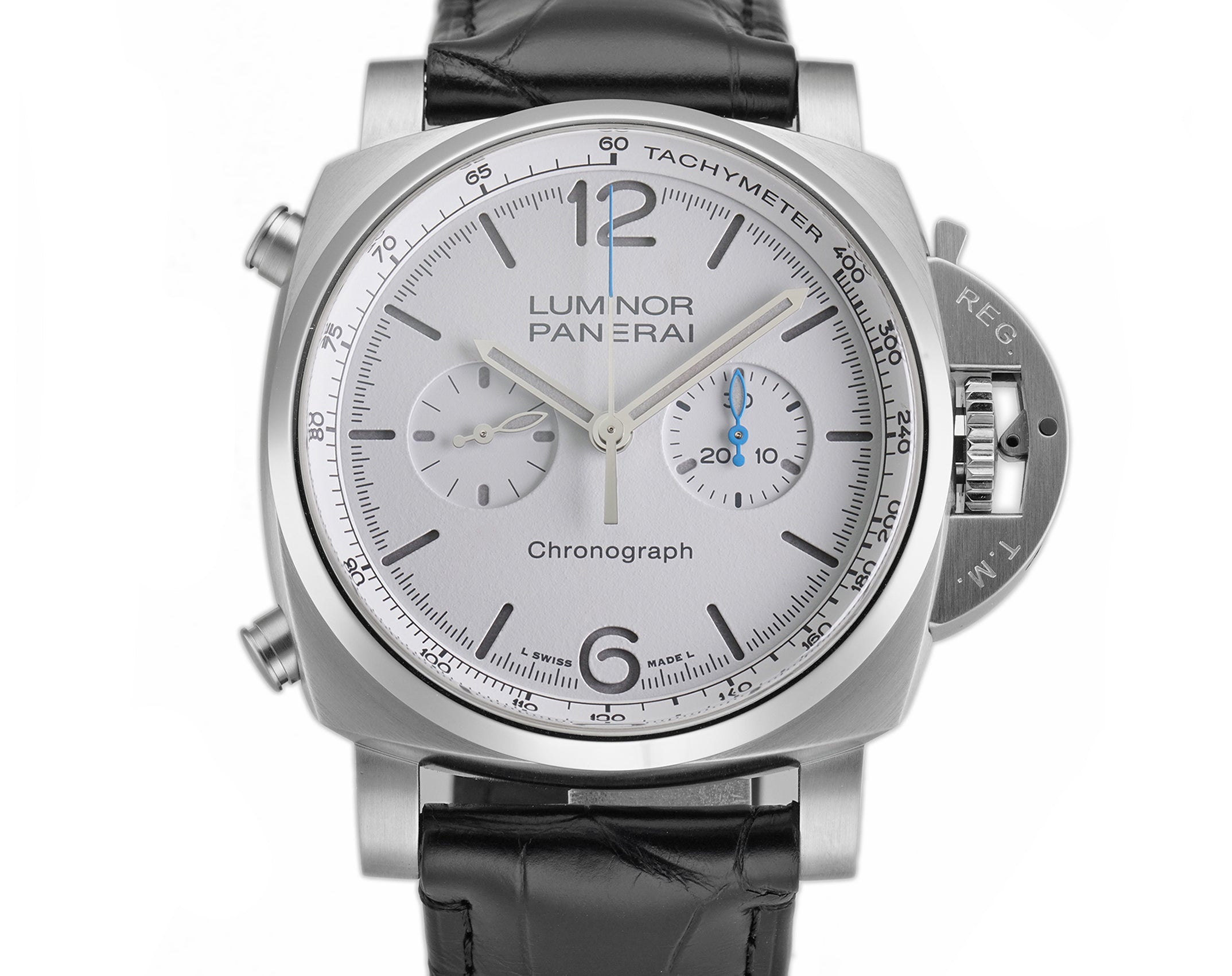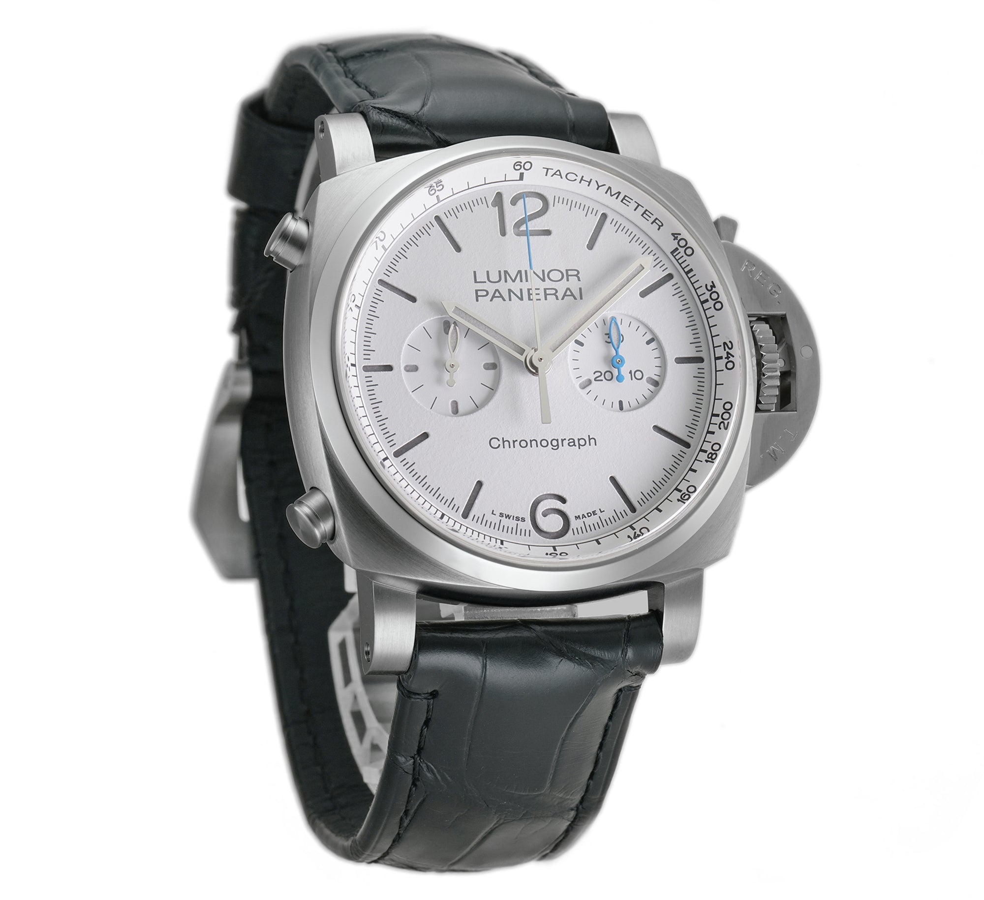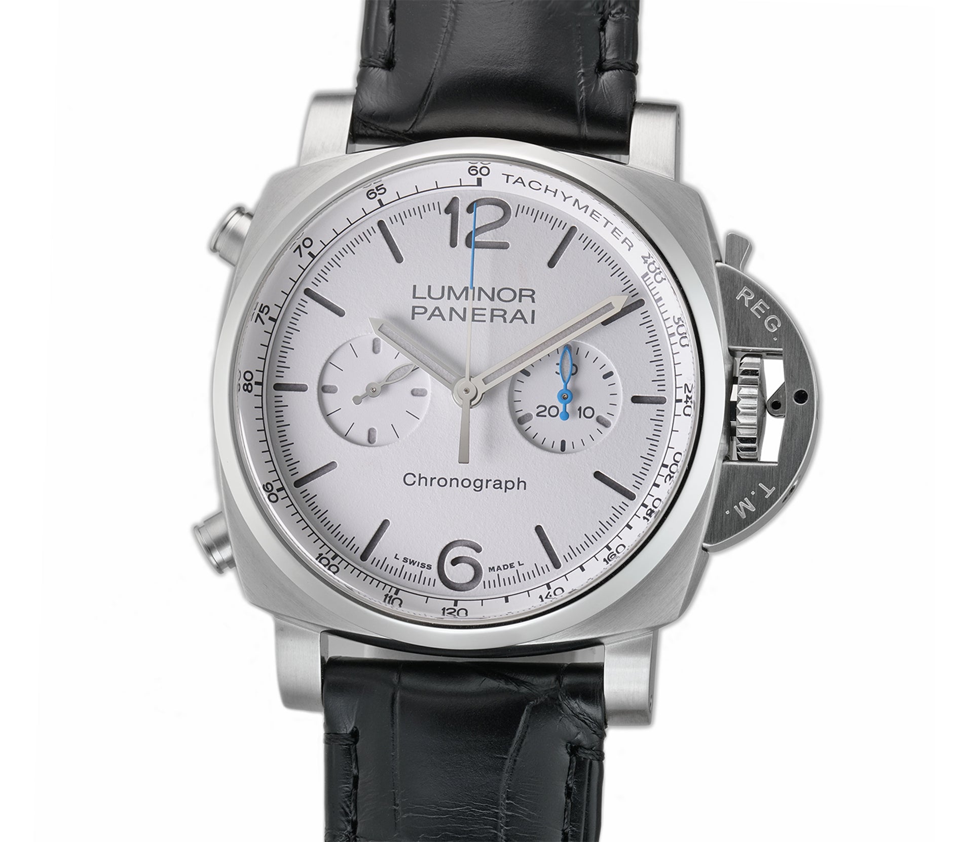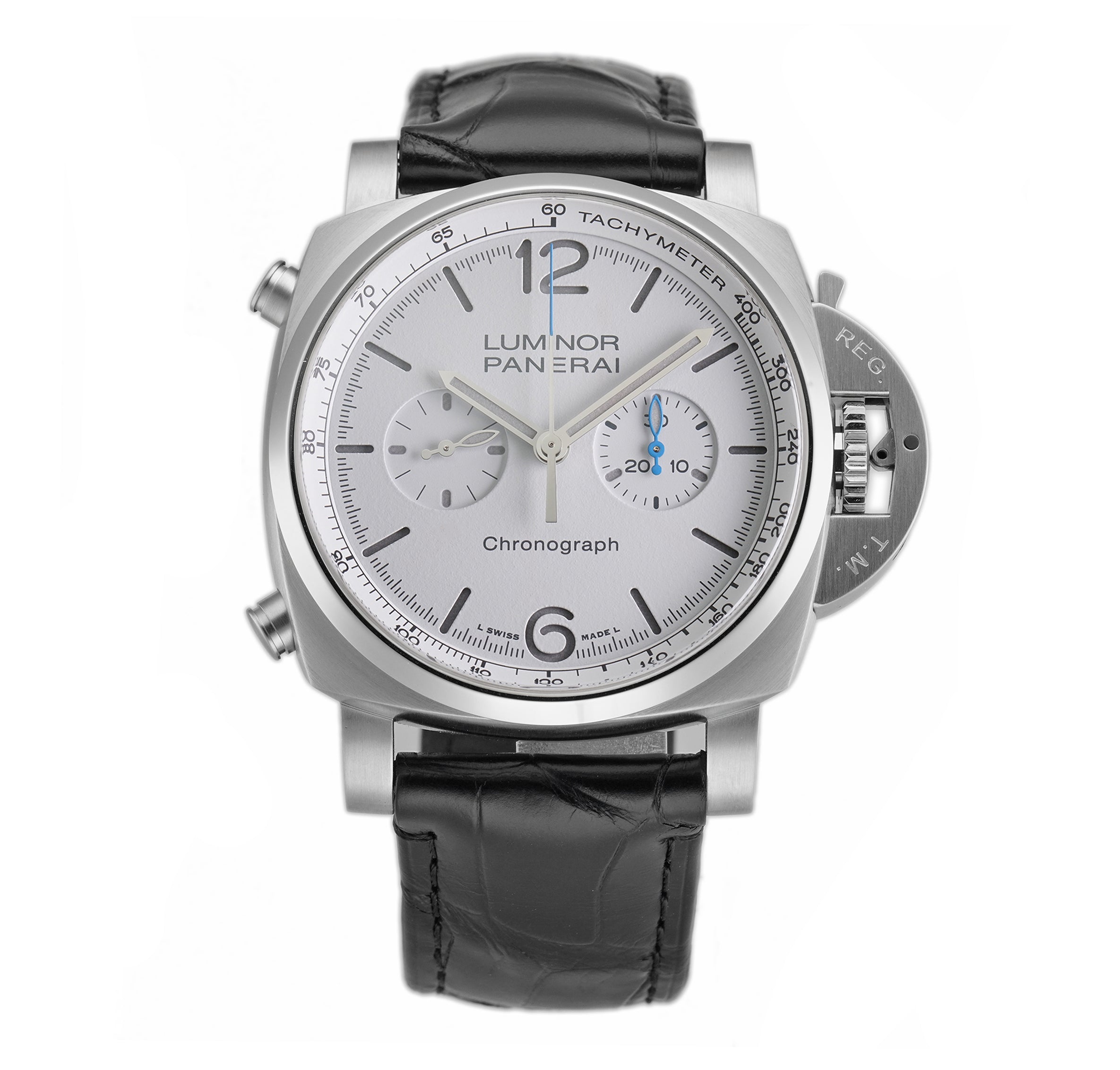 Hours, minutes, sub-seconds and a two register chronograph are displayed on a white sandwich dial.
