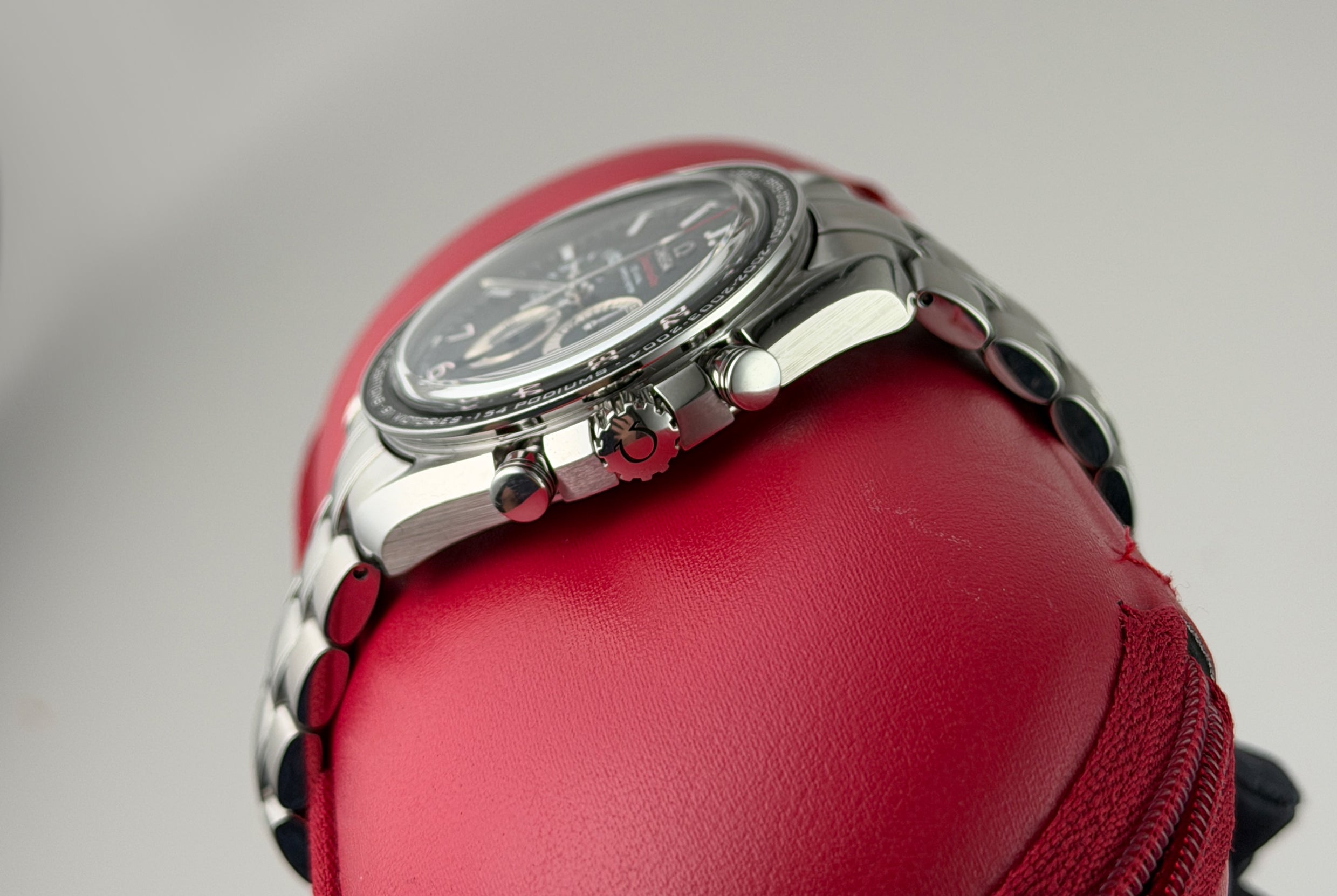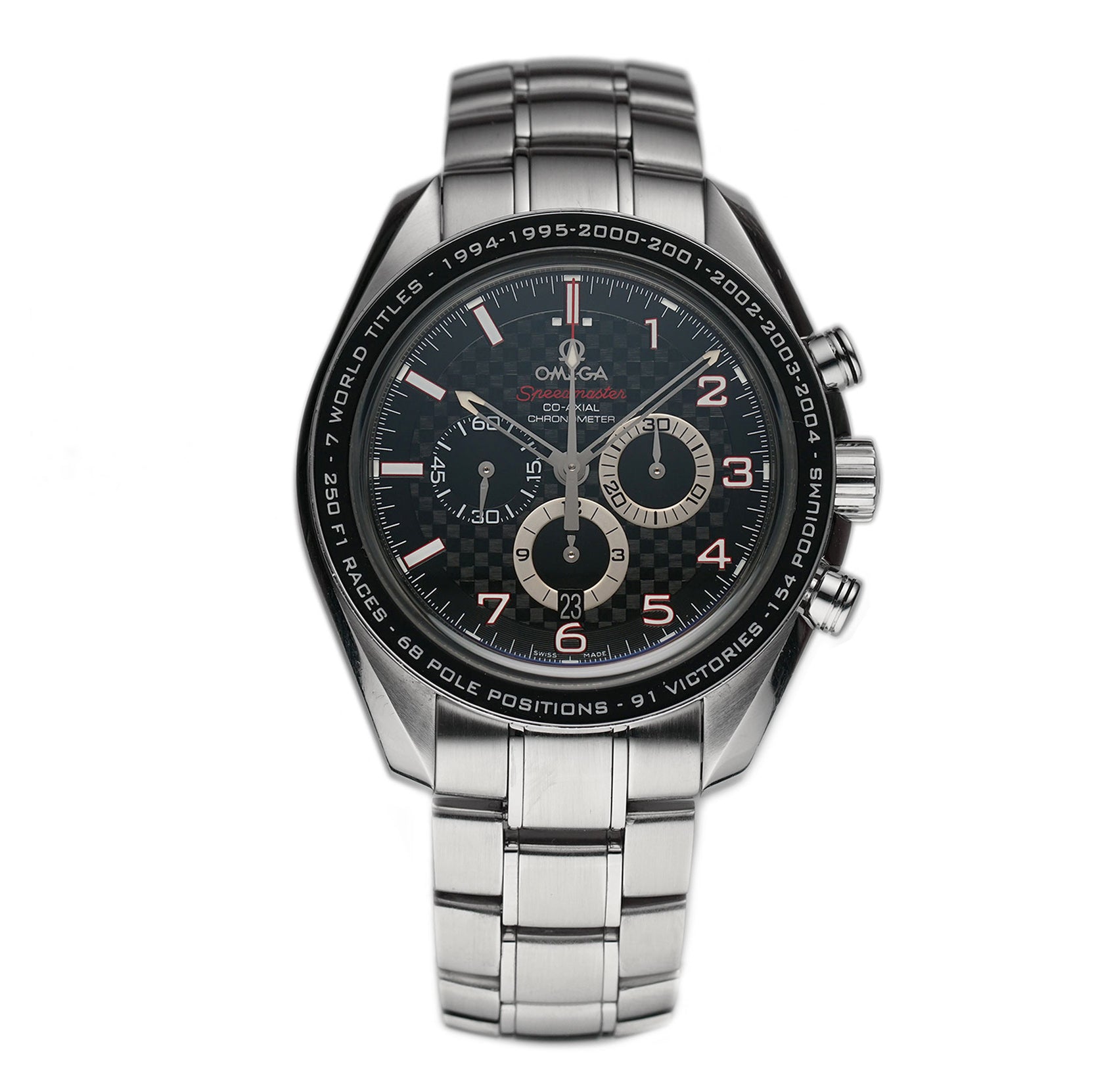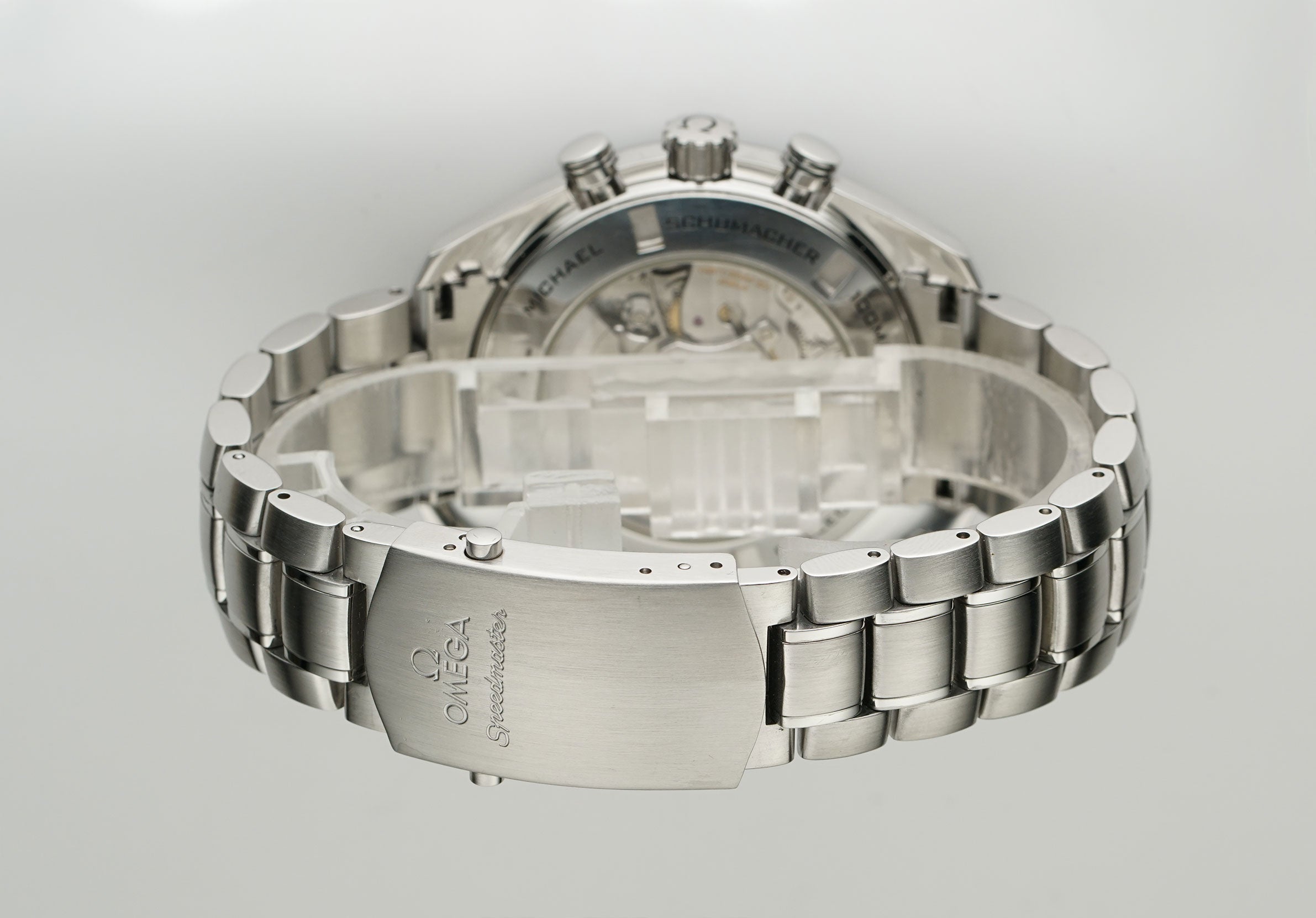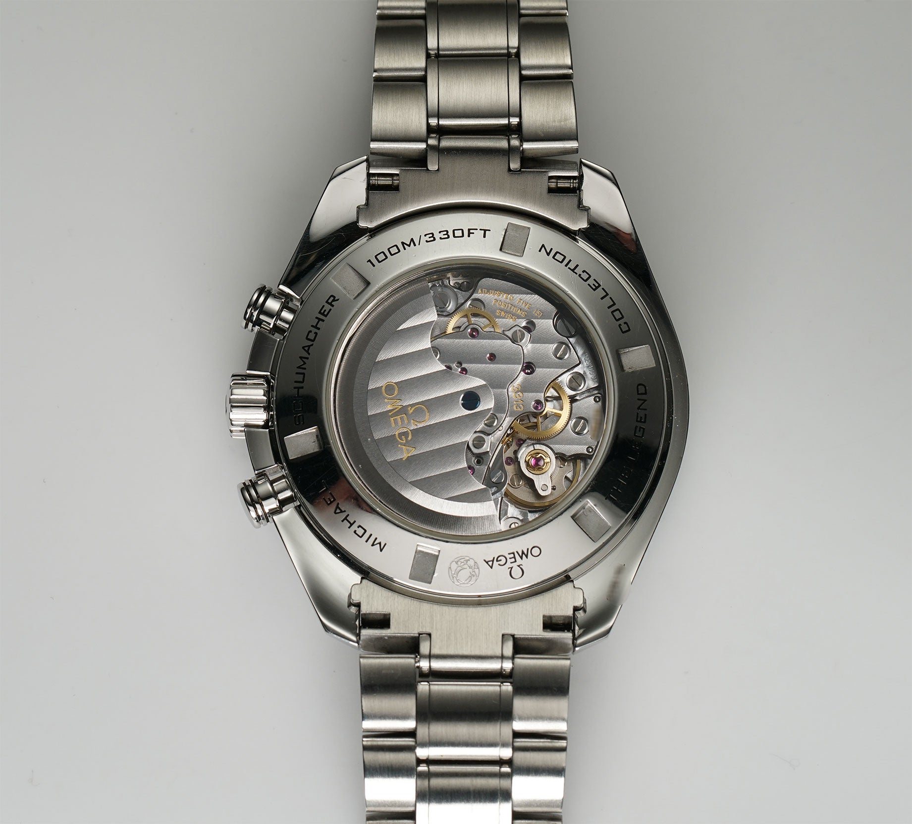 The case is made of stainless steel, displaying a combination of satin and mirror finishes. Mounted atop the case is a stainless steel bezel equipped with a black bezel insert with the stats of legend F1 racer Michael Schumacher. It is paired with an Omega stainless steel bracelet (fits up to an approximate 7.75 inch wrist) which is mostly of satin finish, but with some hints of mirror finish as well.