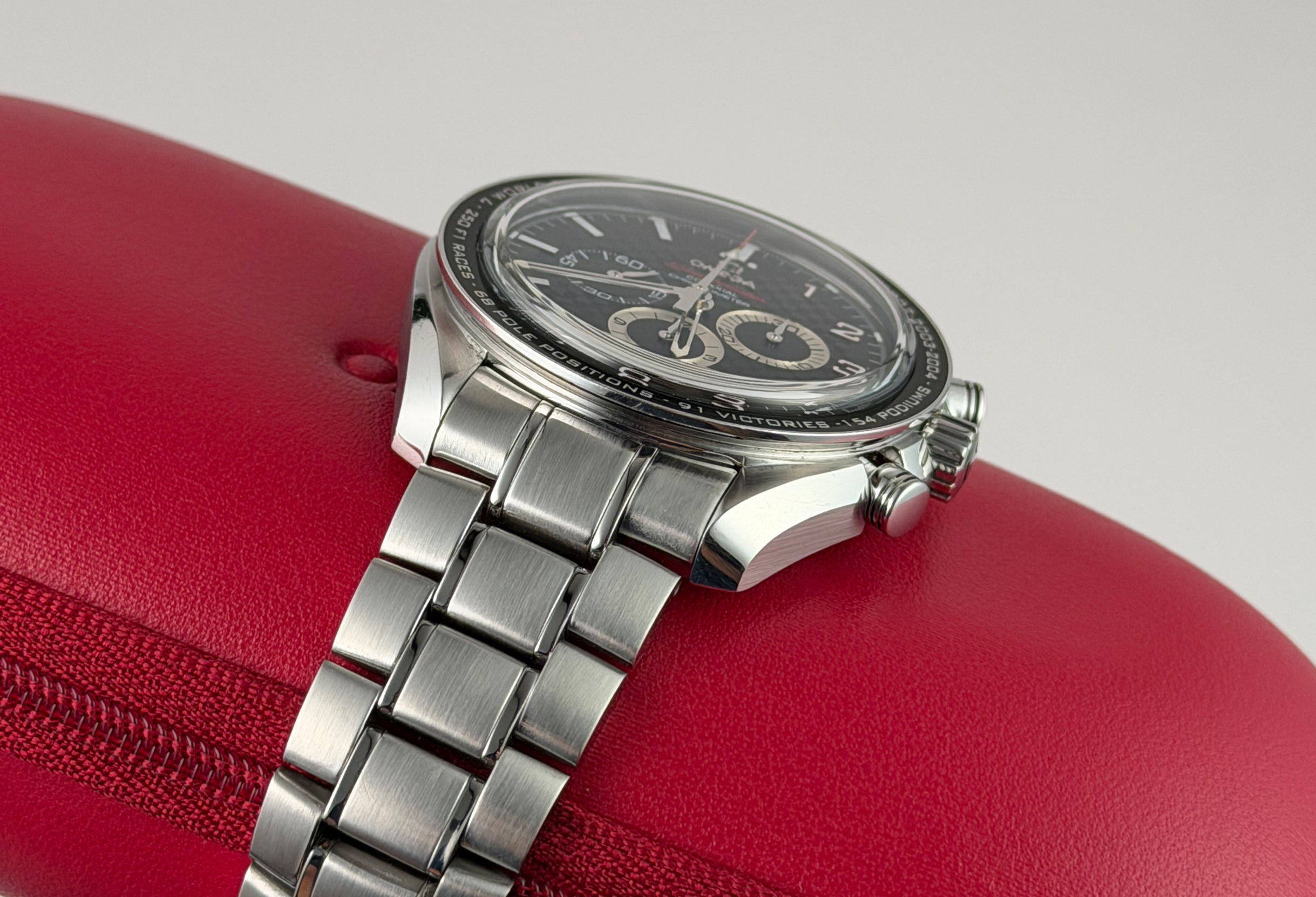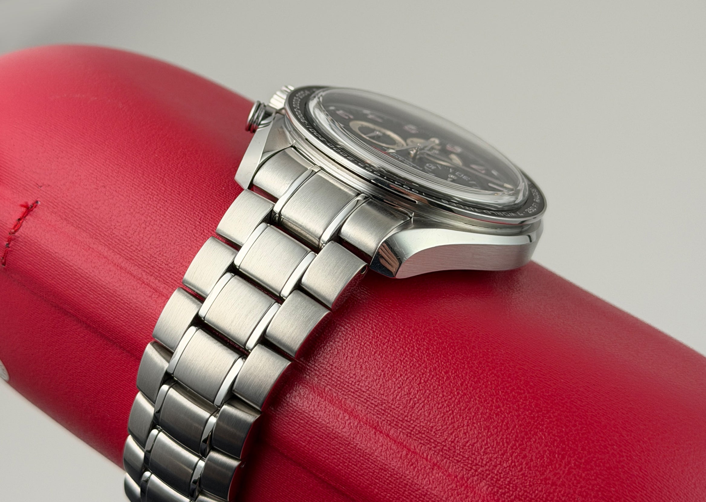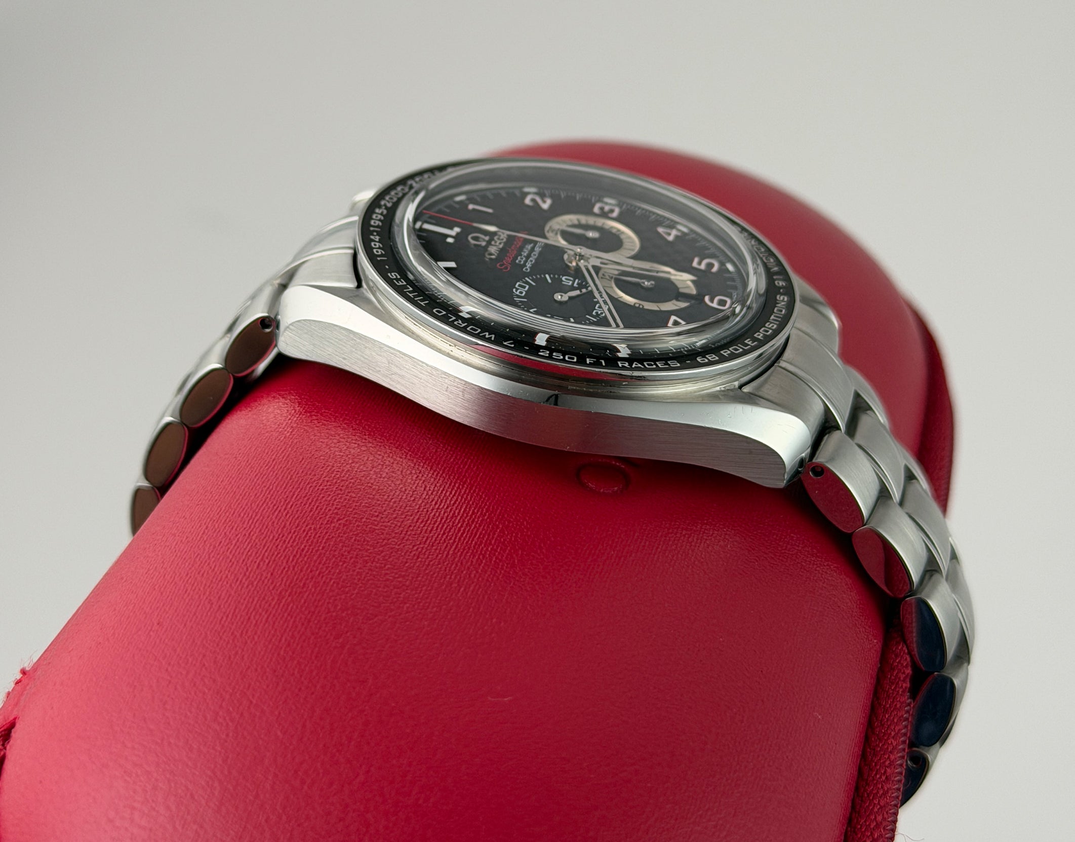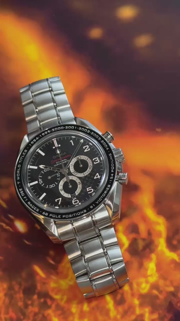 The case is made of stainless steel, displaying a combination of satin and mirror finishes. Mounted atop the case is a stainless steel bezel equipped with a black bezel insert with the stats of legend F1 racer Michael Schumacher. It is paired with an Omega stainless steel bracelet (fits up to an approximate 7.75 inch wrist) which is mostly of satin finish, but with some hints of mirror finish as well.