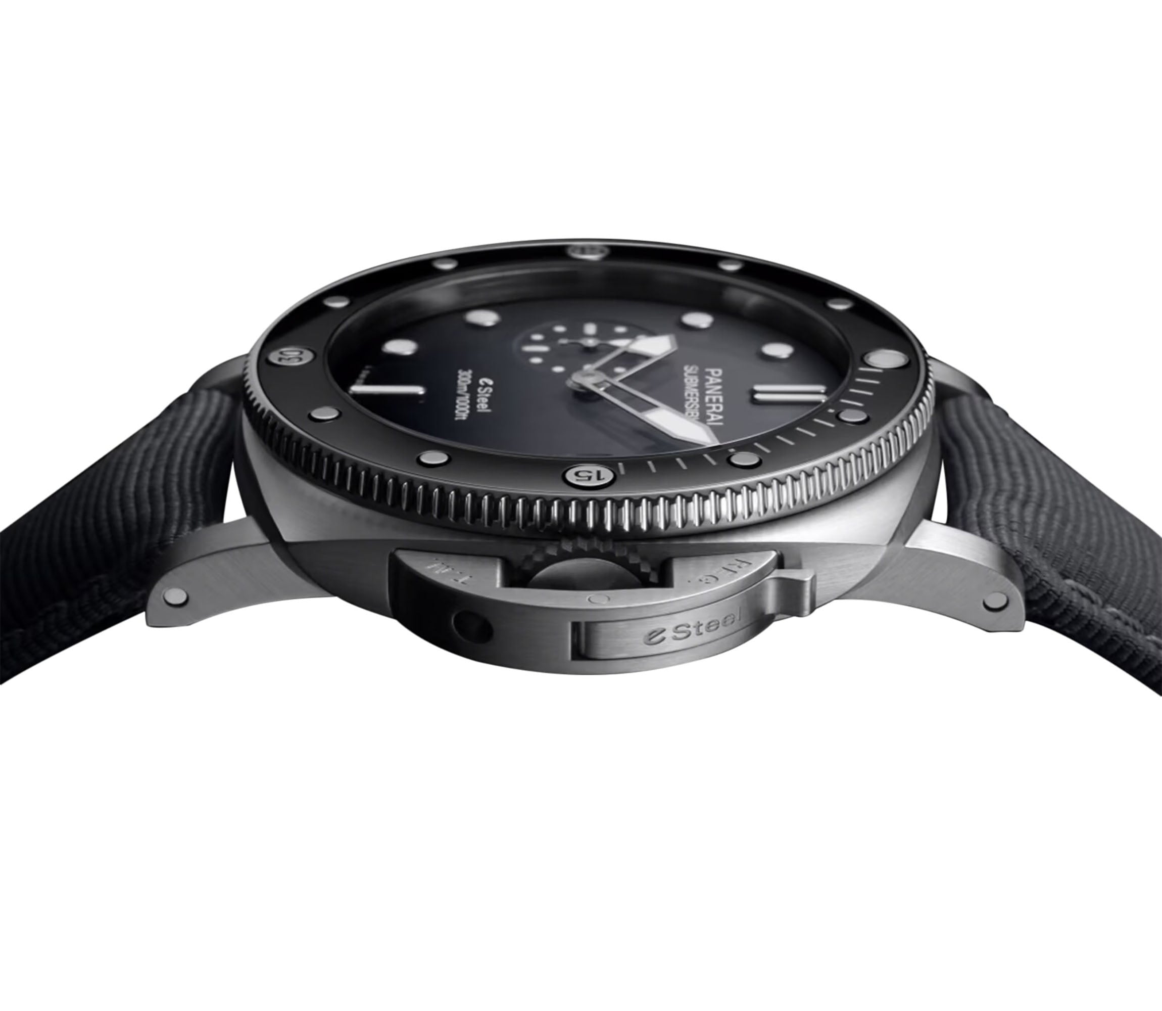 The case is made of a satin finished stainless steel case including the crown and crown guard. Mounted atop the case is a satin finished stainless steel bezel with a black ceramic bezel insert. Paired with the watch is a grey textile strap with a stainless steel tang buckle.