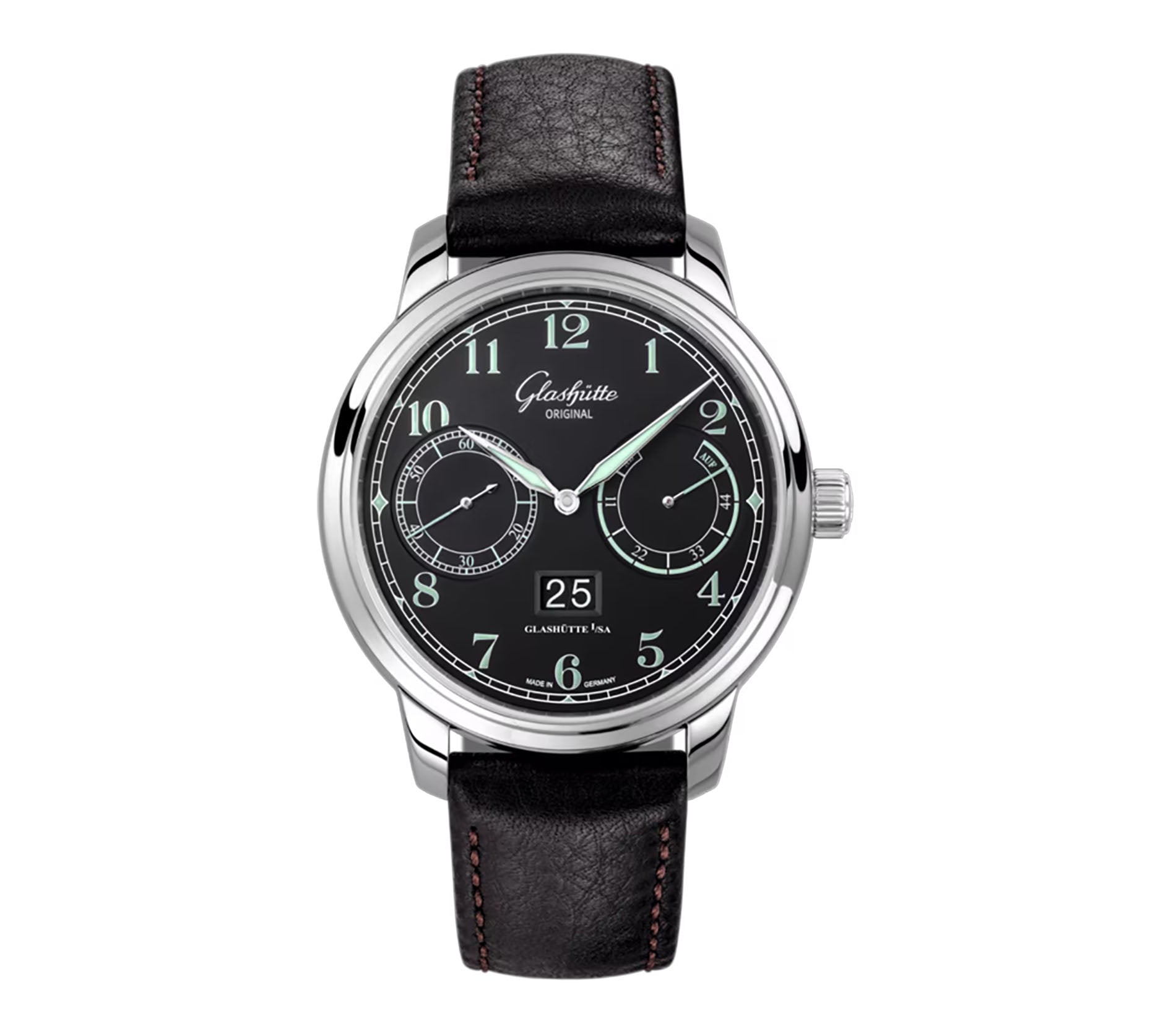 Functions are shown on a black dial with luminous hours and hour markers. These functions include hours, minutes, sub-seconds, date, alarm and power reserve.