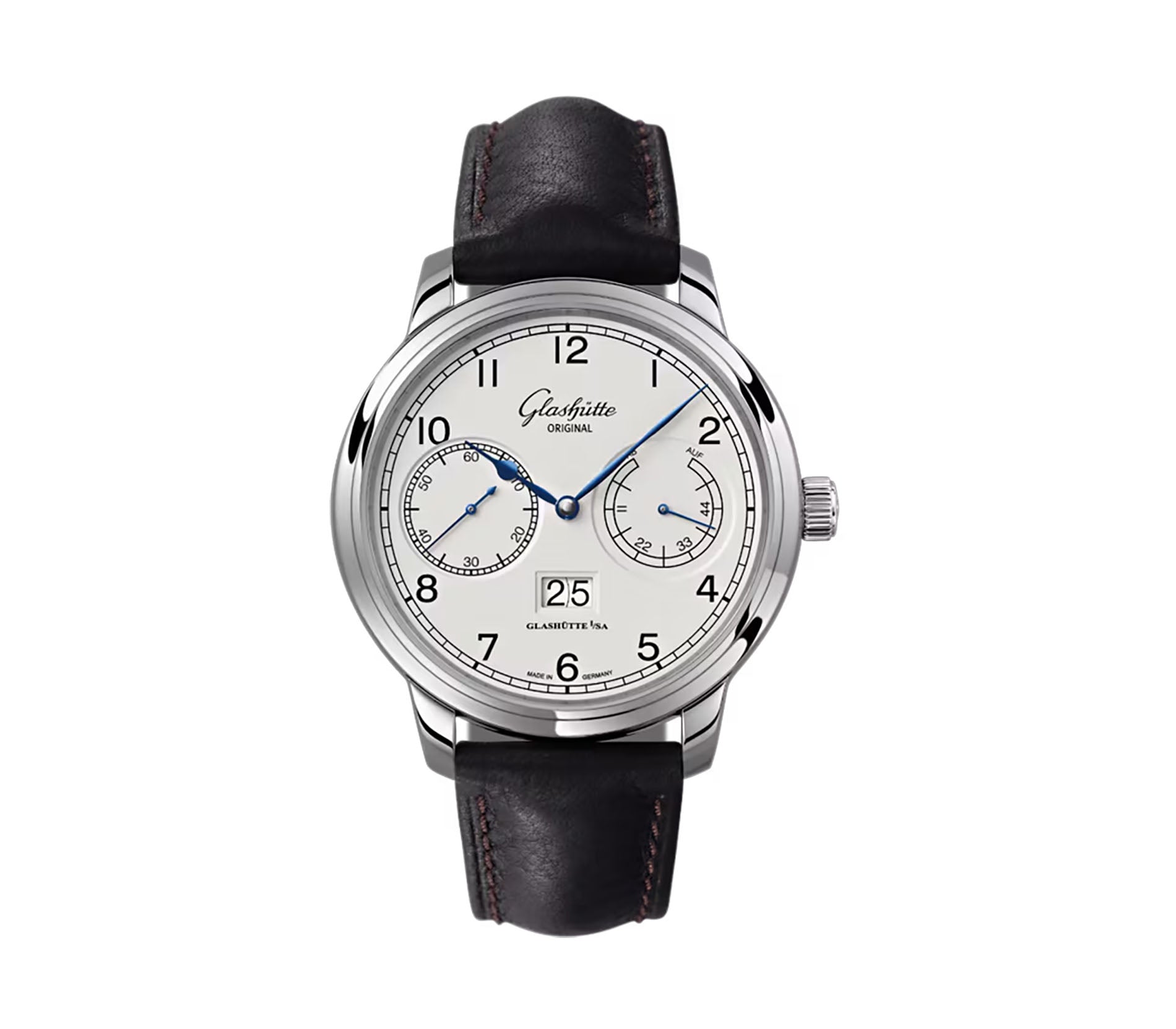 Functions are shown on a silver dial with luminous hours and hour markers. These functions include hours, minutes, sub-seconds, date, alarm and power reserve.