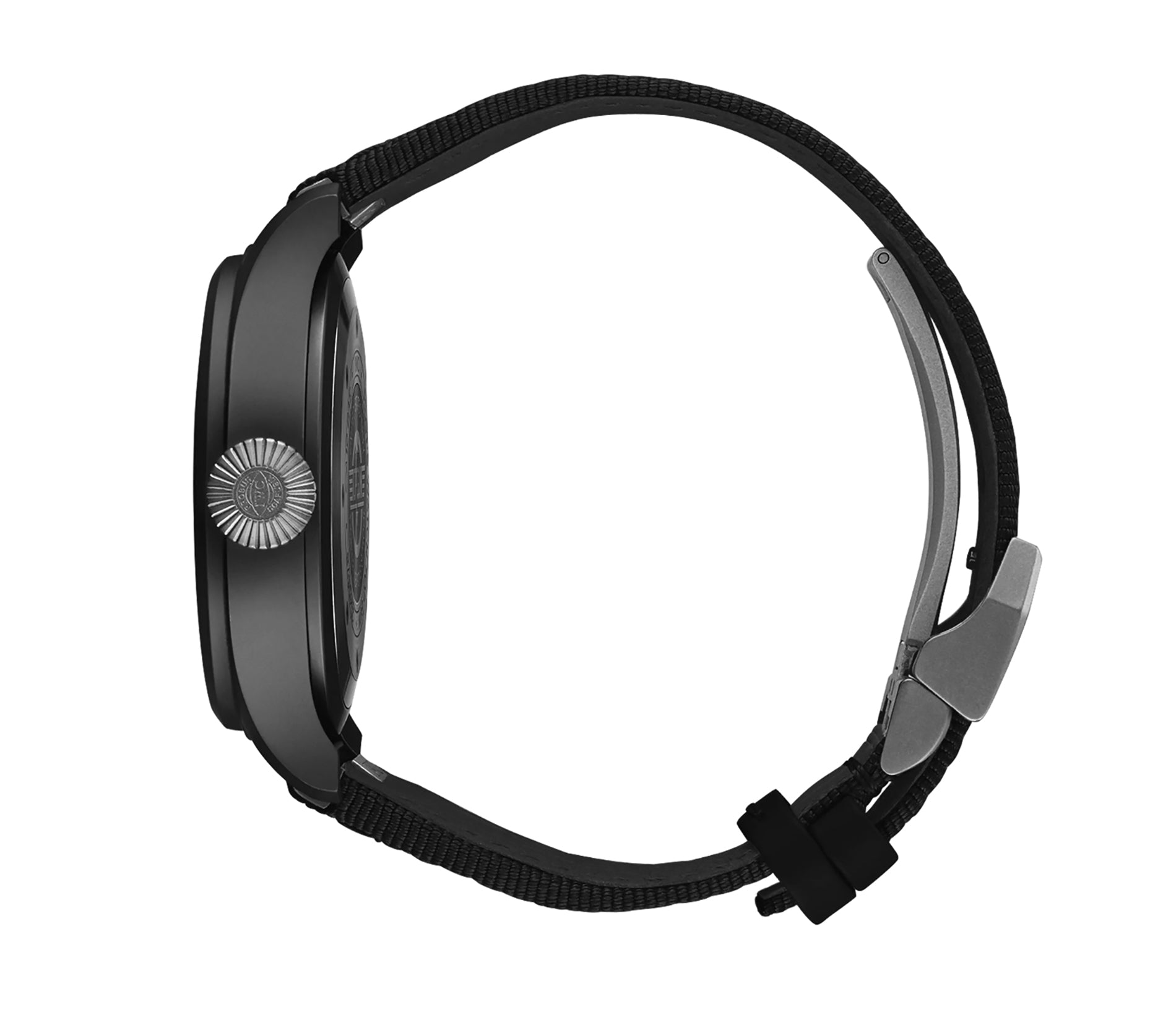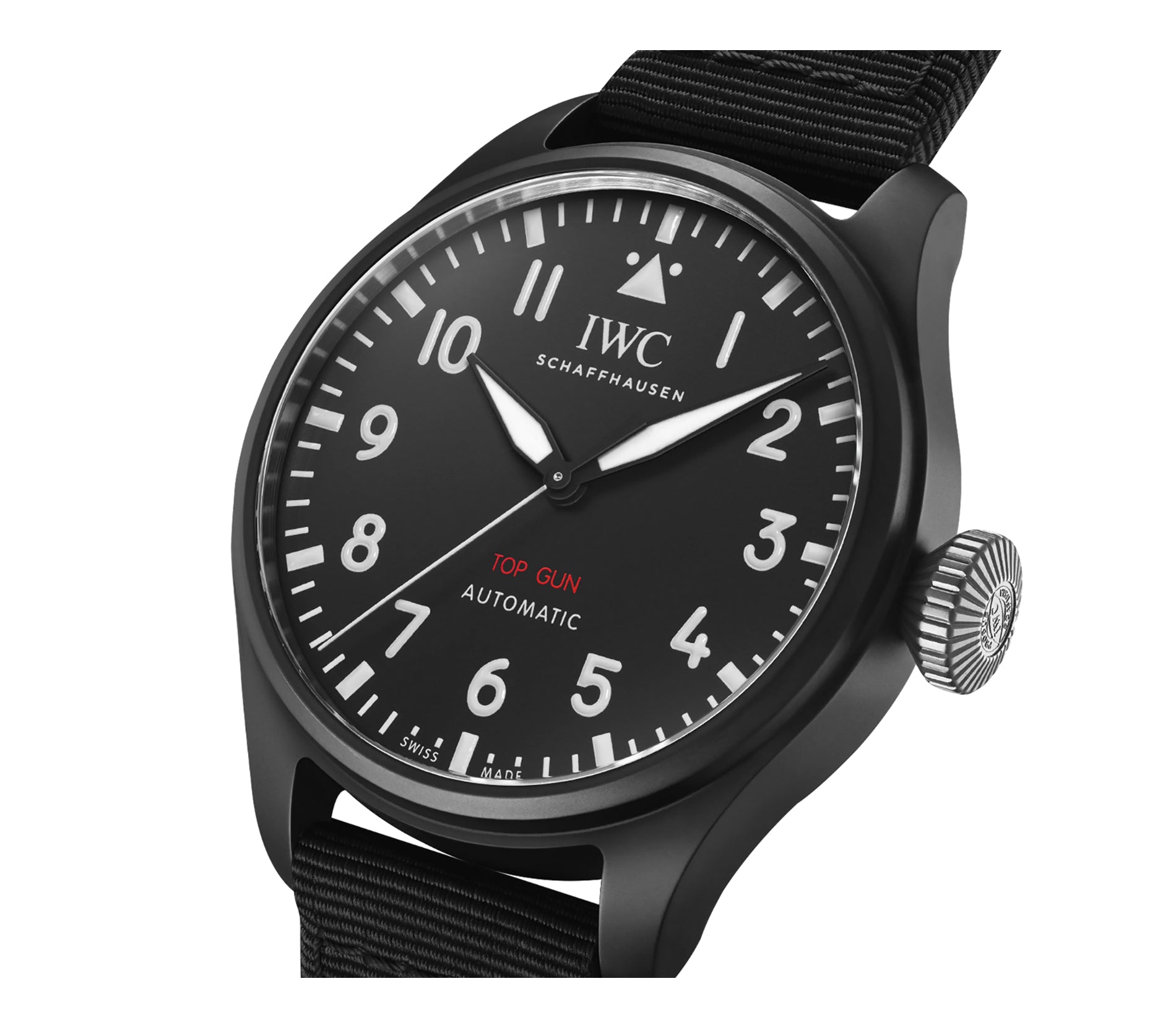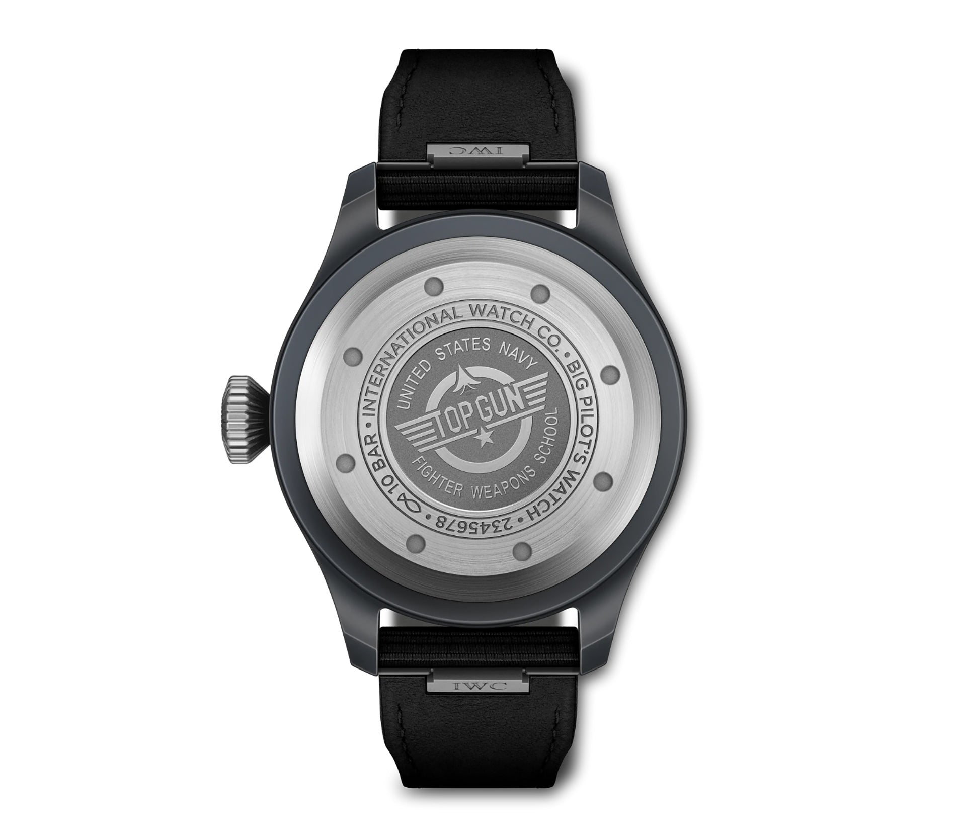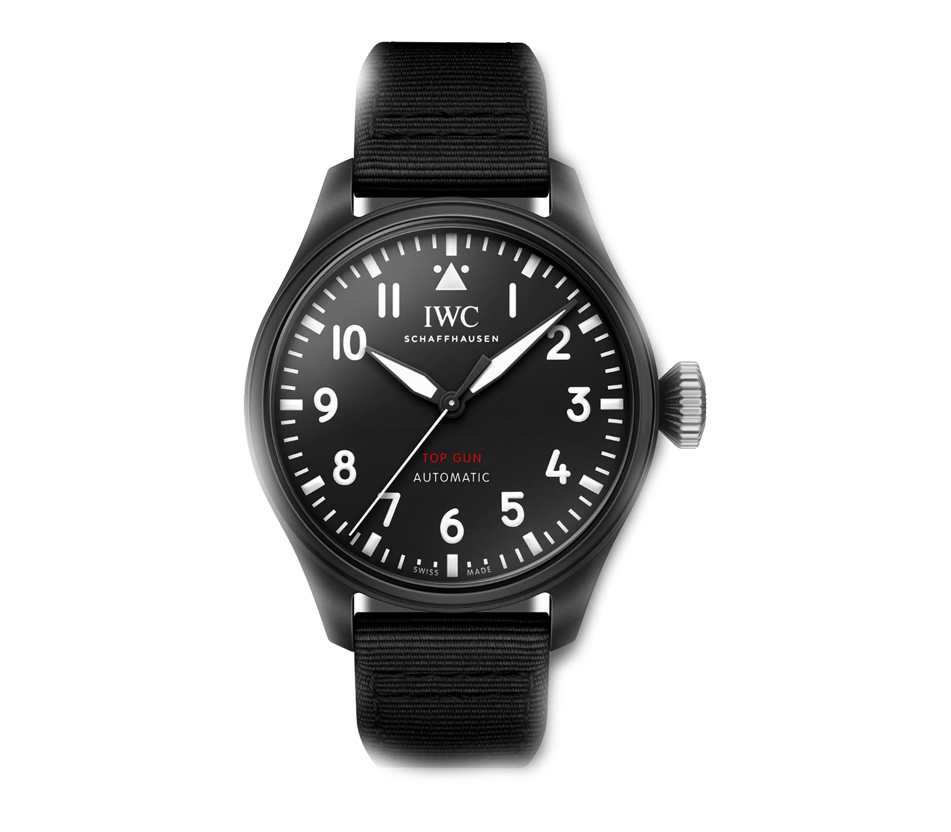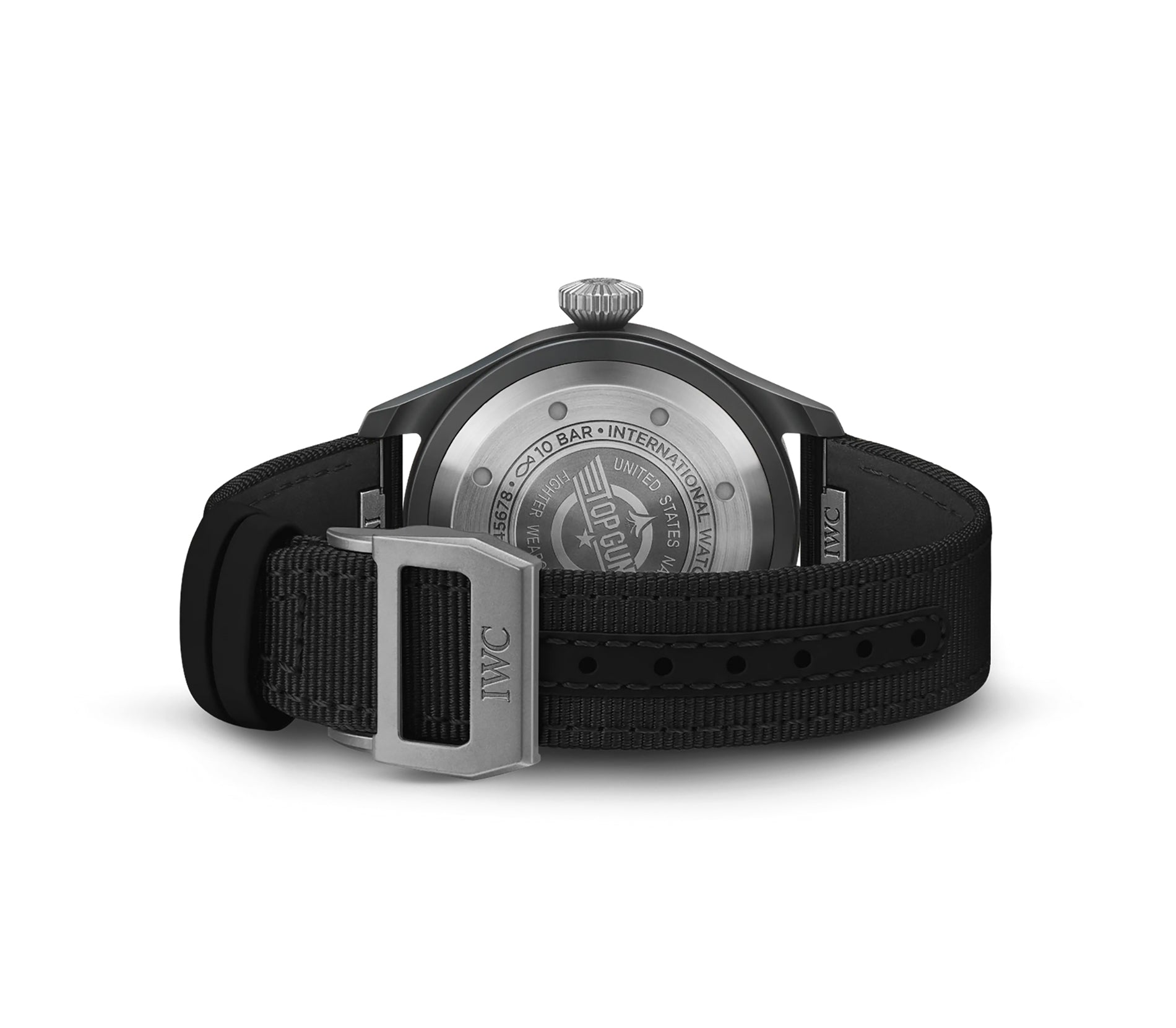 Case is made of black ceramic as is the bezel mounted atop. Watch has a titanium caseback. Mounted on the watch is a black textile strap with a IWC titanium folding clasp.