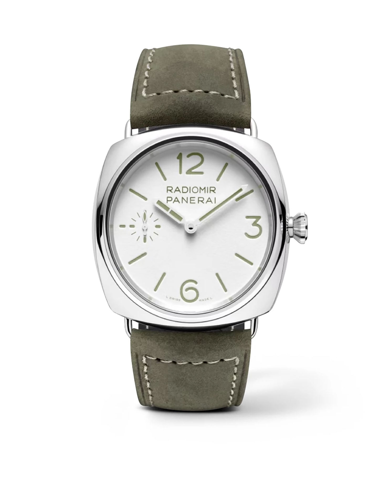 Functions are shown on a white dial with luminous hands and hour markers. These functions include hours, minutes, and sub-seconds.