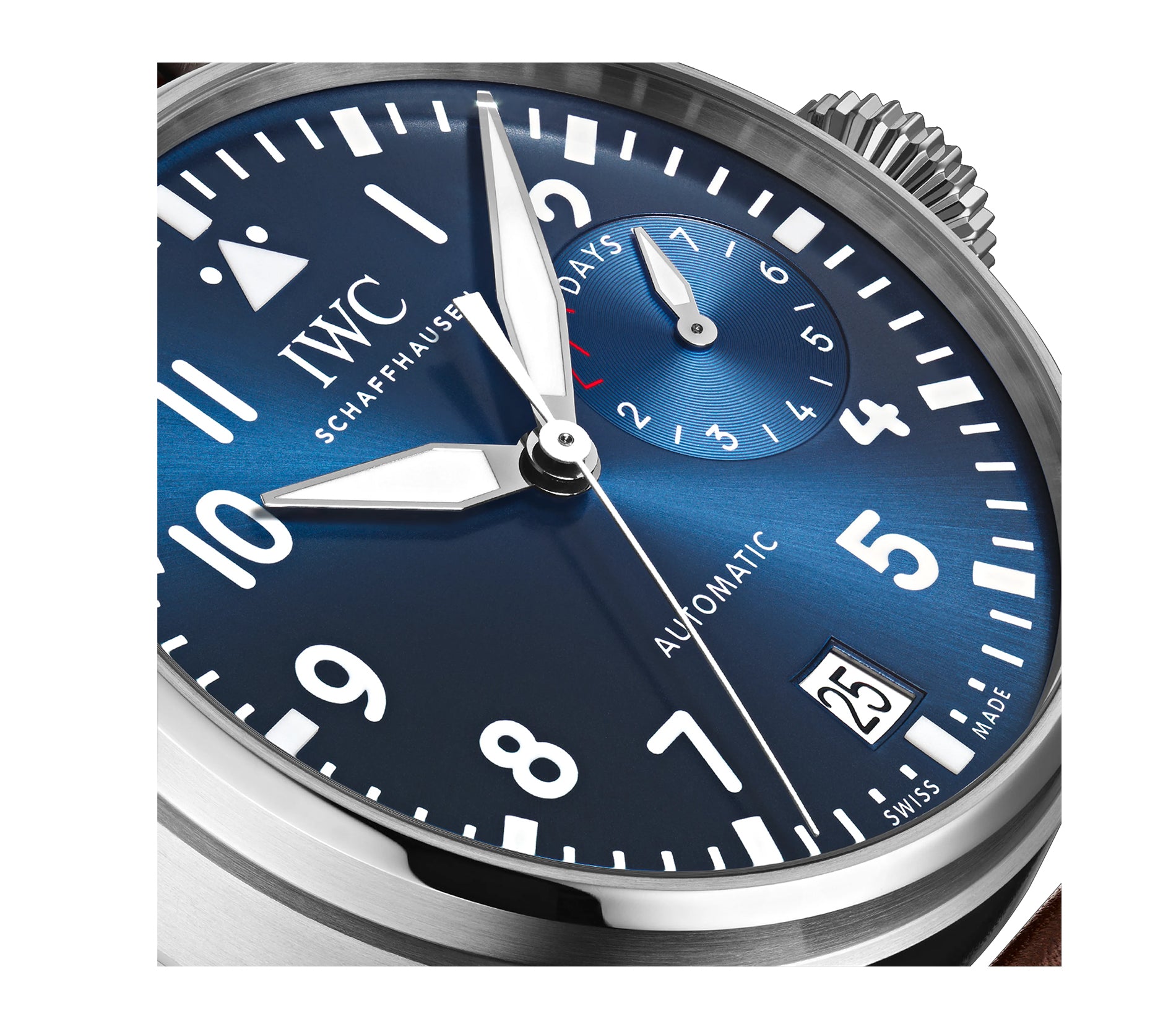 Functions are displayed on a blue dial with white luminous hands and hour markers. The white colored look gives this big pilot a vintage look. Featured on the dial is a date aperture at the 6 o'clock position as well as a 7 day power reserve indicator at the 3 o'clock position.