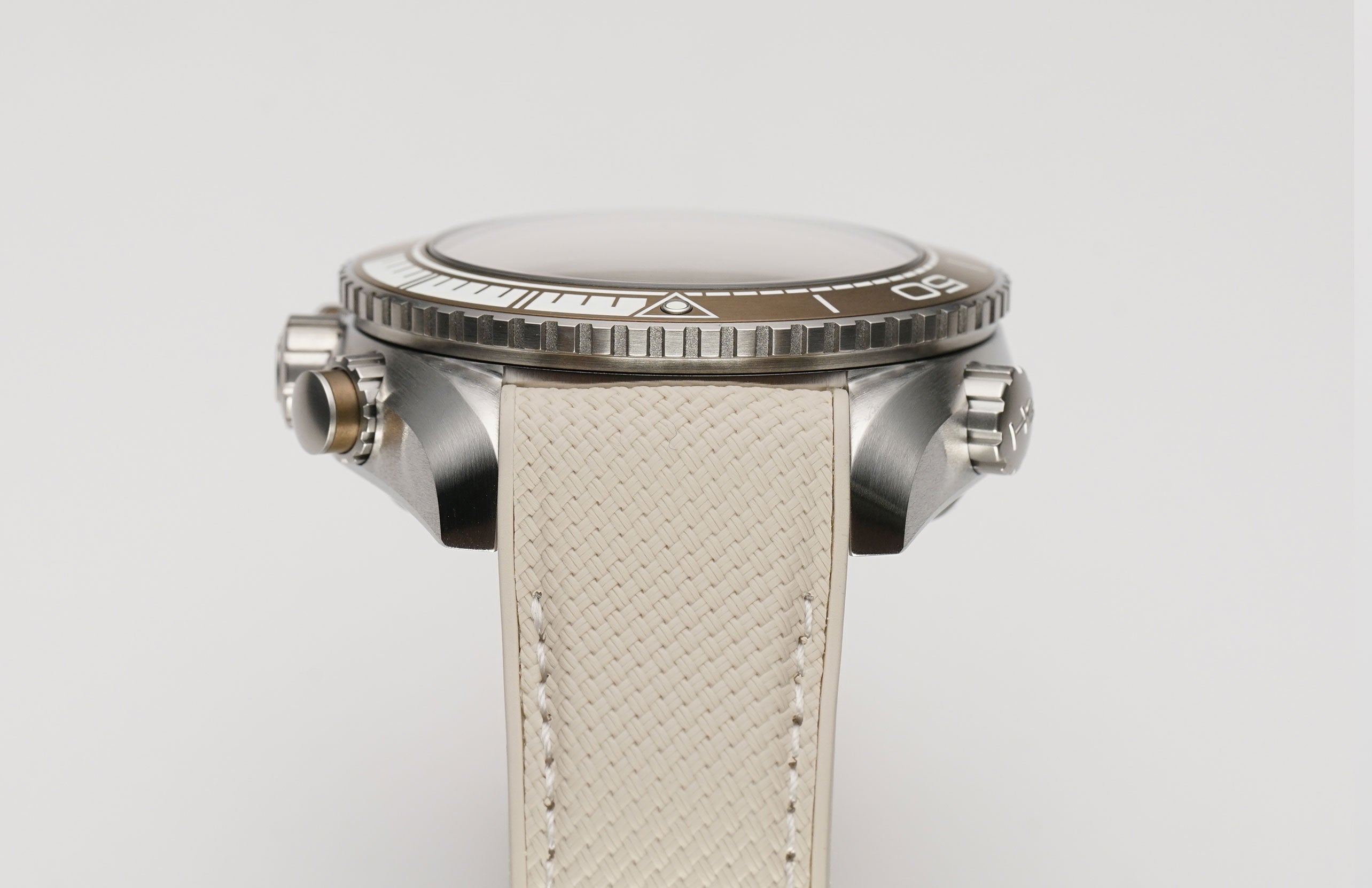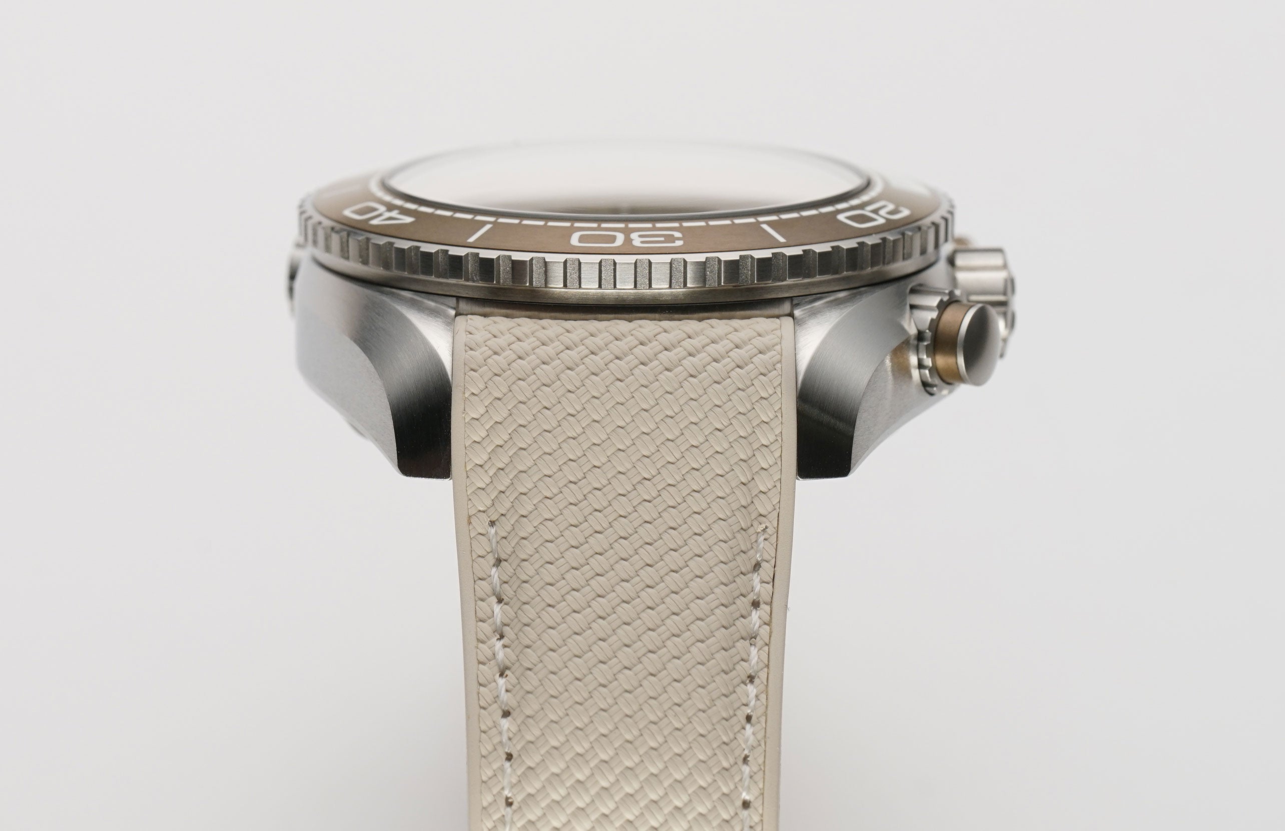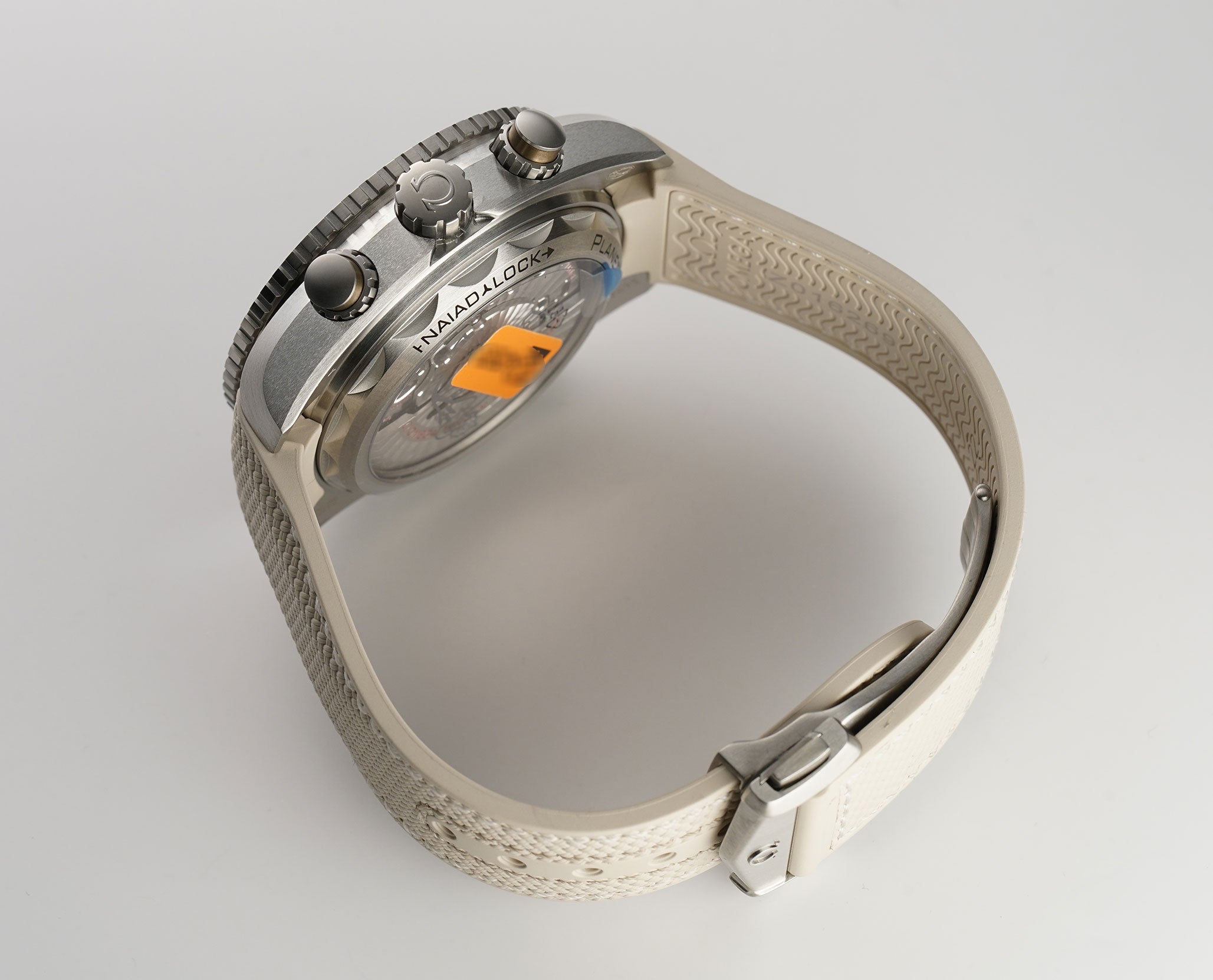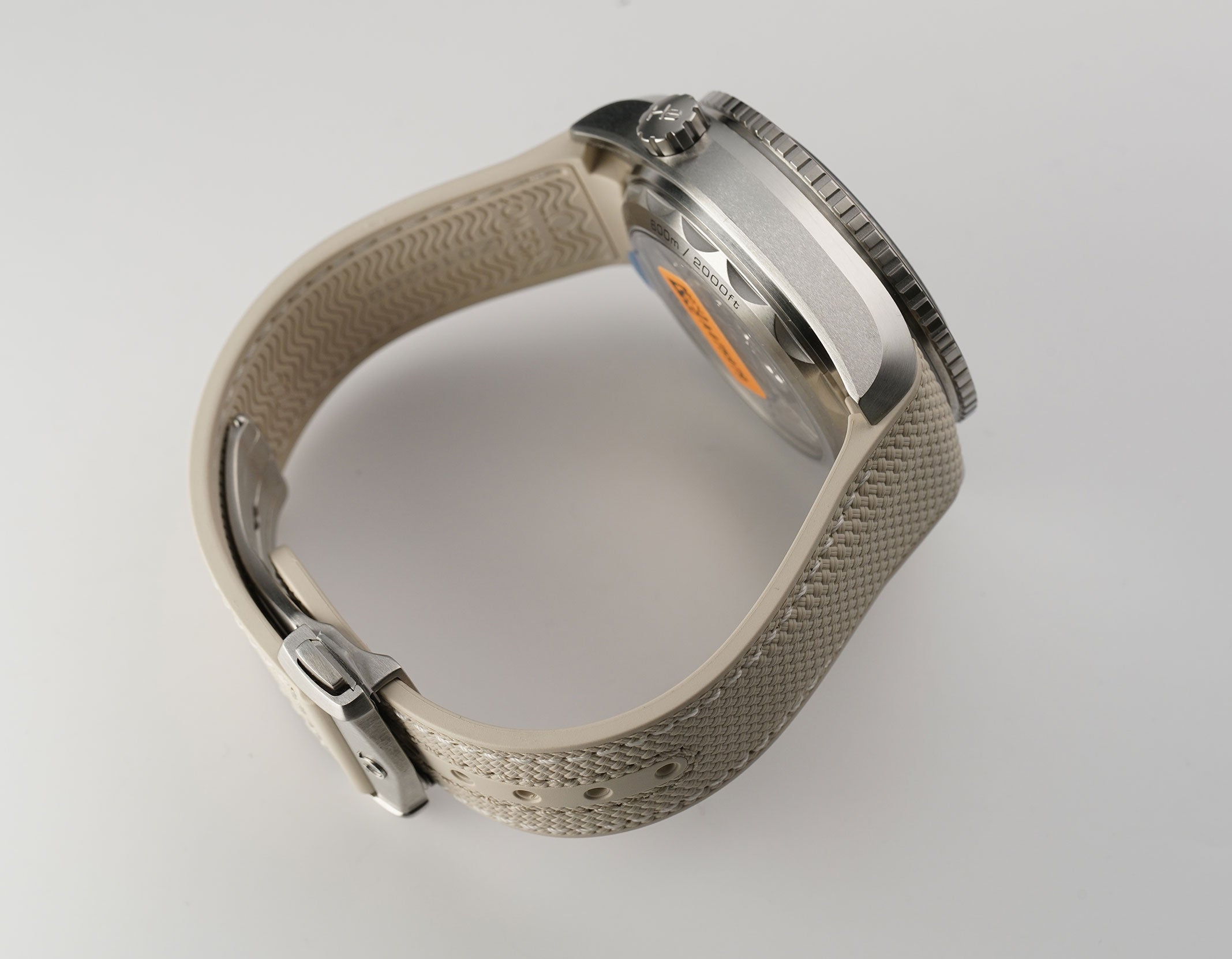 The case is made of a satin finish stainless steel including the crown and pushbuttons. Mounted atop the case is a unidirectional stainless steel bezel with a ceramic bezel insert. Paired with the watch is a beige rubber strap and a stainless steel folding clasp.
