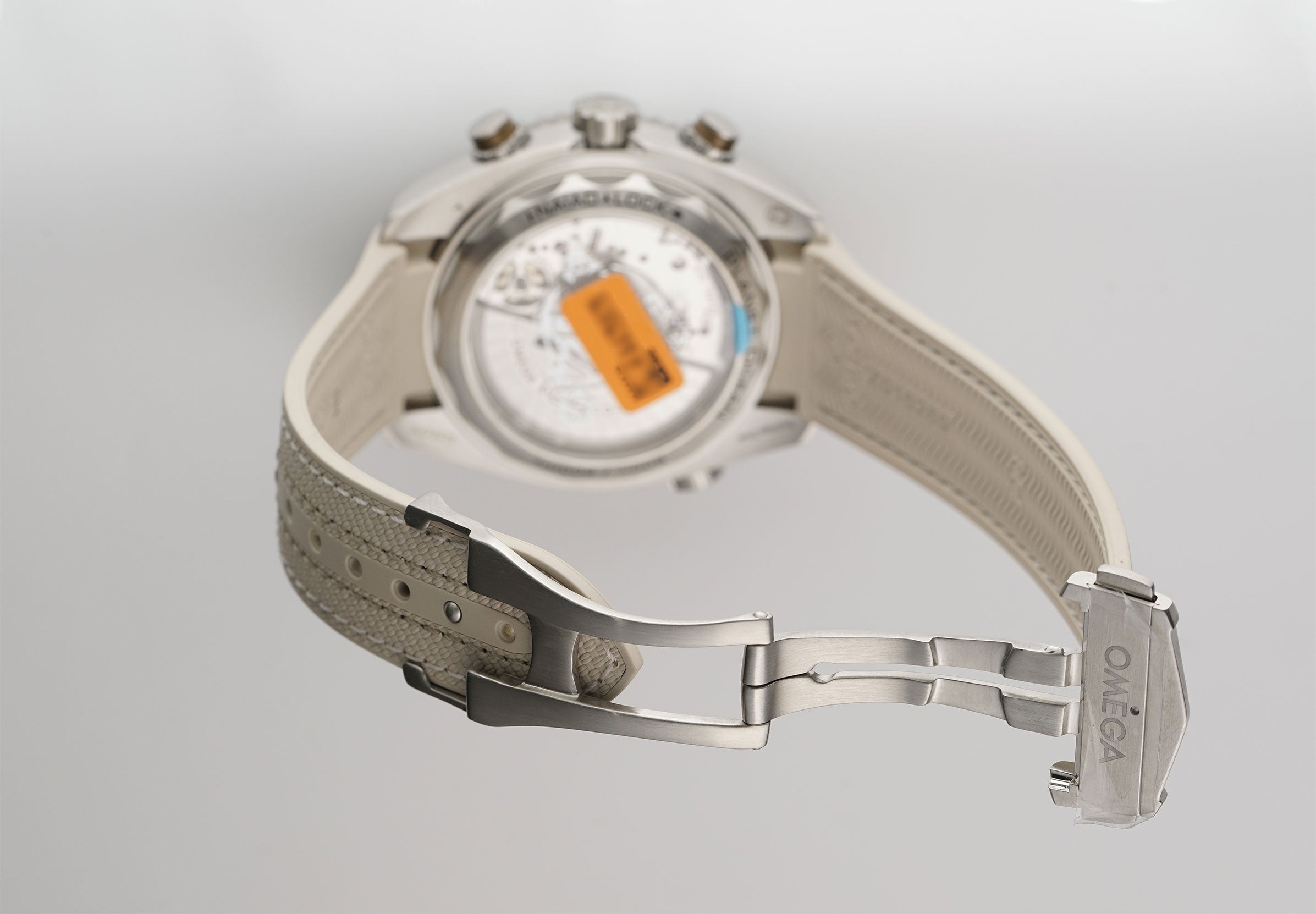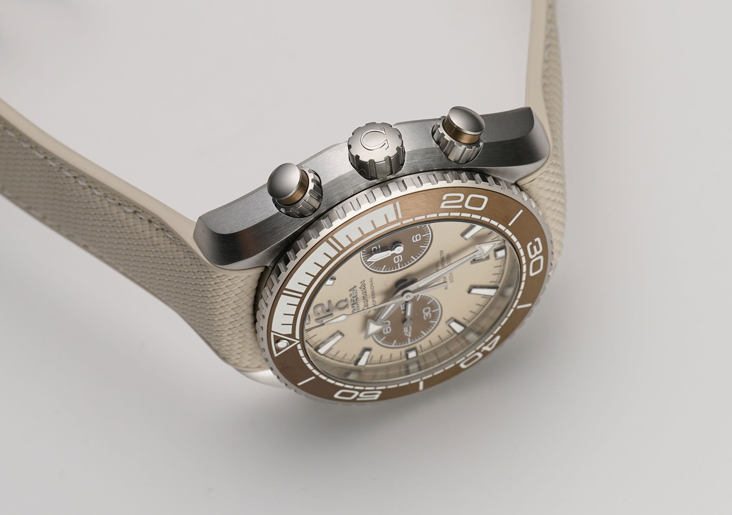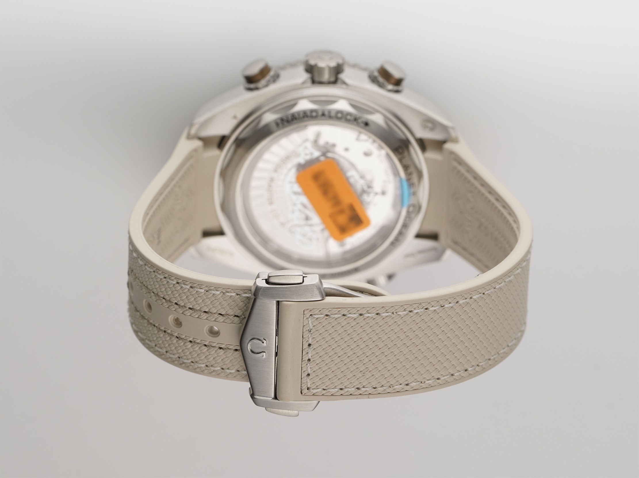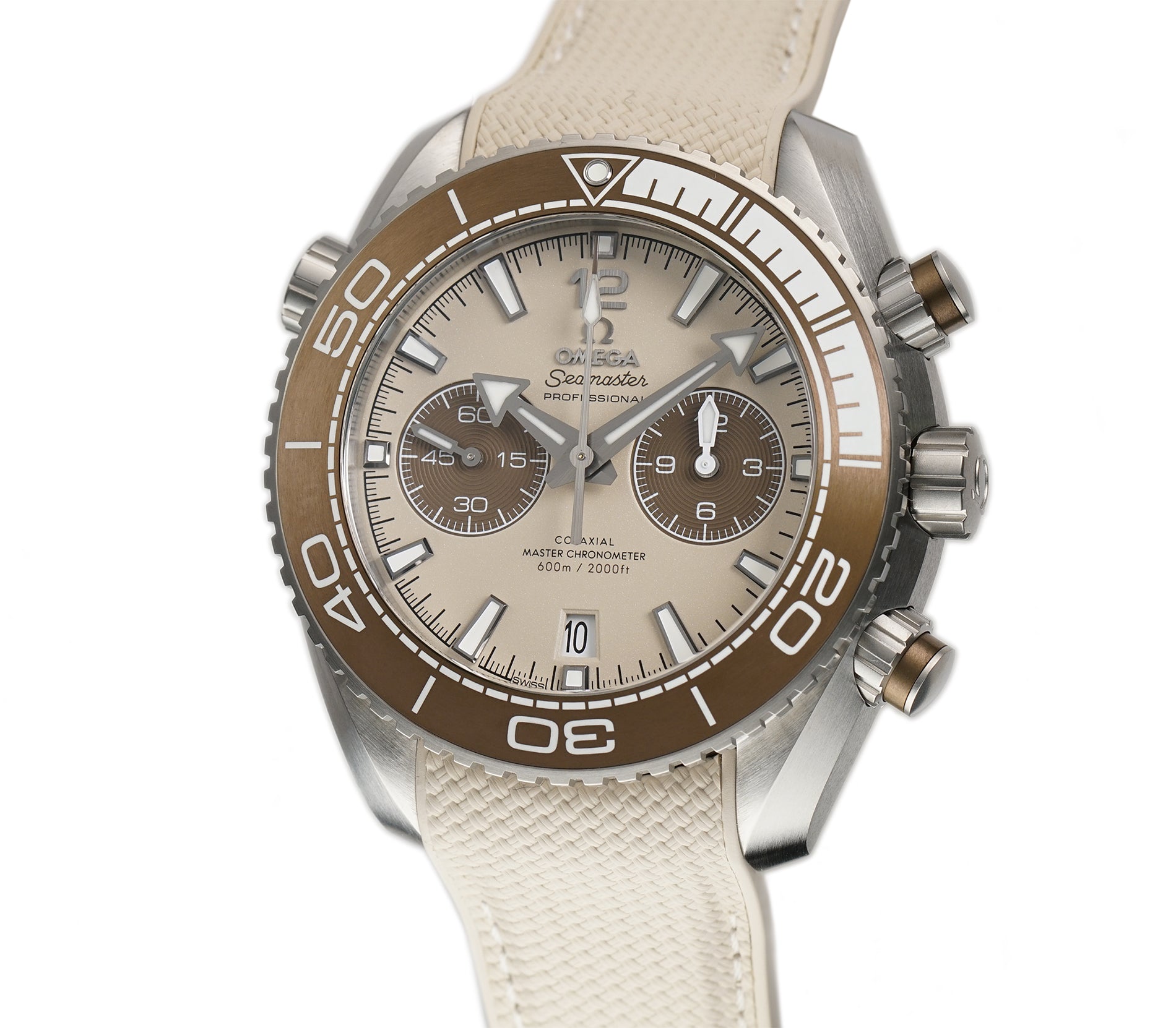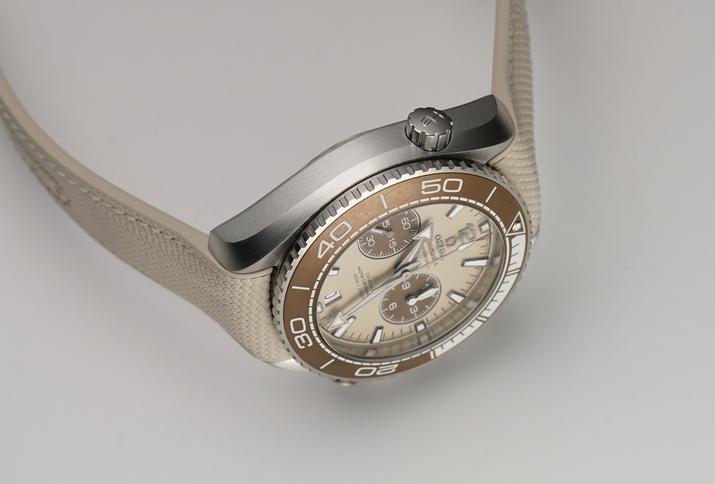 The case is made of a satin finish stainless steel including the crown and pushbuttons. Mounted atop the case is a unidirectional stainless steel bezel with a ceramic bezel insert. Paired with the watch is a beige rubber strap and a stainless steel folding clasp.