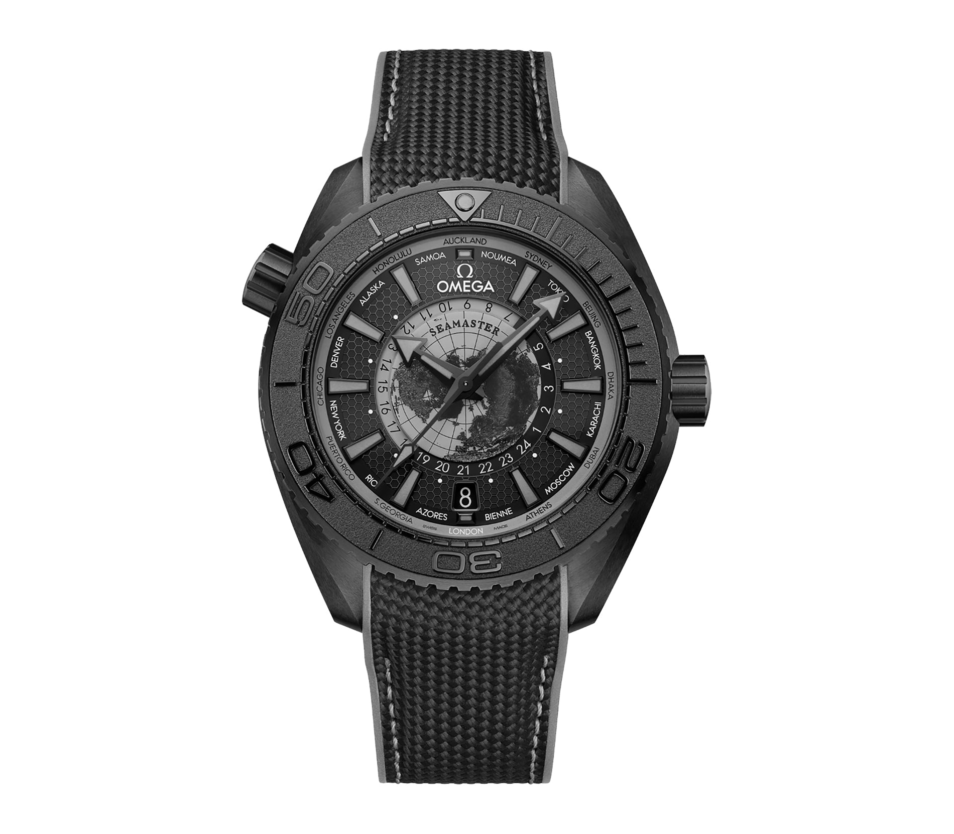 Case is made of black ceramic, at the center of the dial, Omega has created a detailed representation of Earth on a grace 5 titanium surface and seen from above the north pole, the tropical map is made using laser ablation and finished with grey varnish. It is circled by a 24-hour indicator, divided into day and night sections on transparent hesalite.