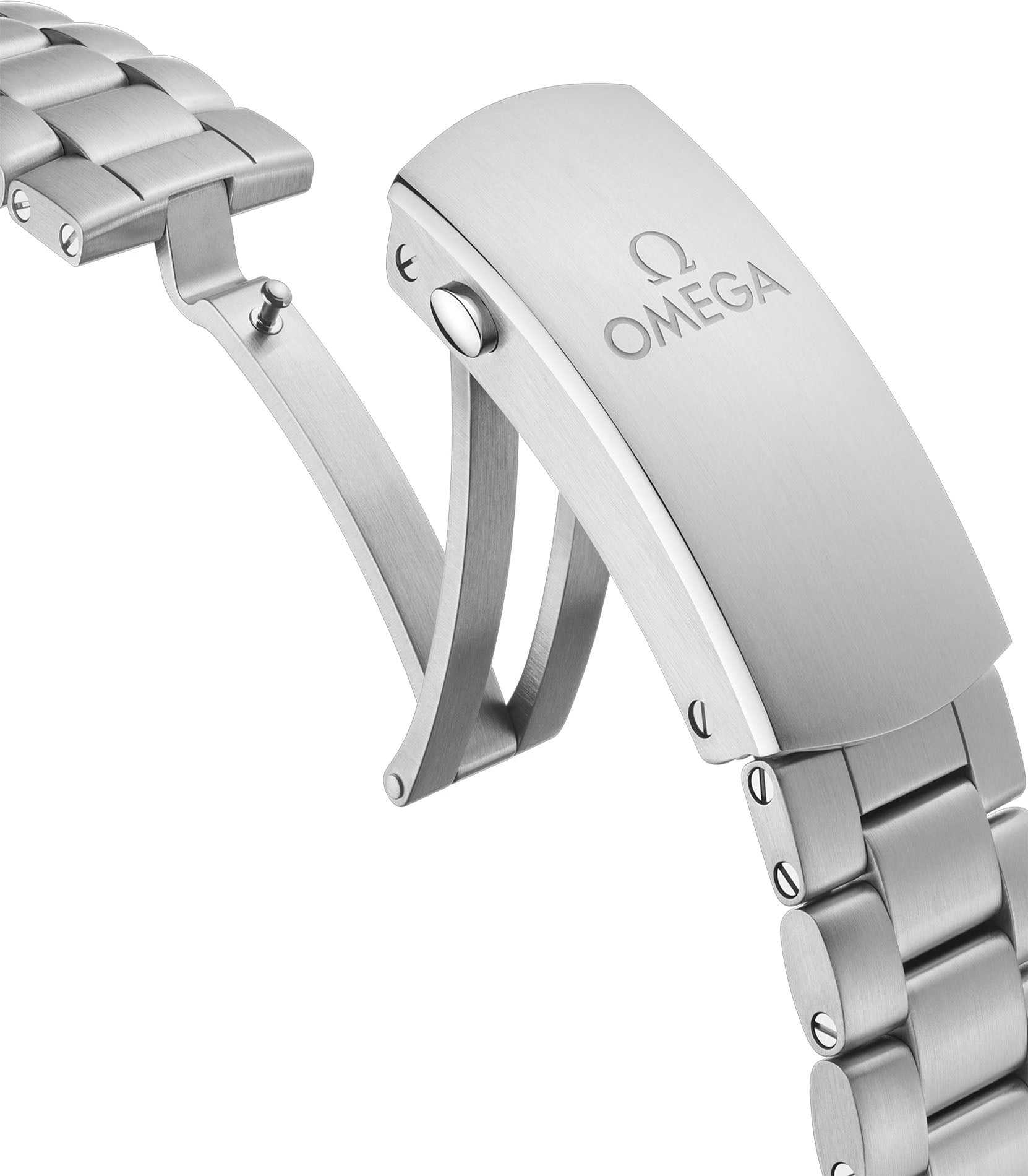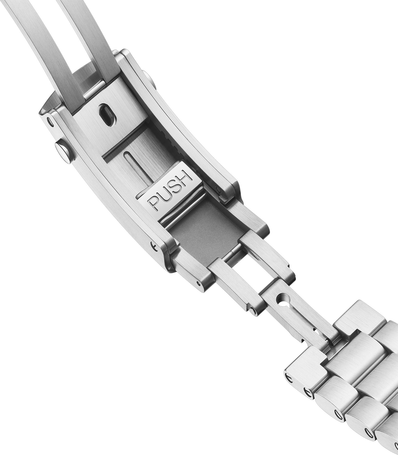The case is made of a satin finish stainless steel including the crown and pushbuttons. Mounted atop the case is a stainless steel bezel with a ceramic bezel insert. Paired with the watch is a brown rubber strap with a stainless steel folding clasp.