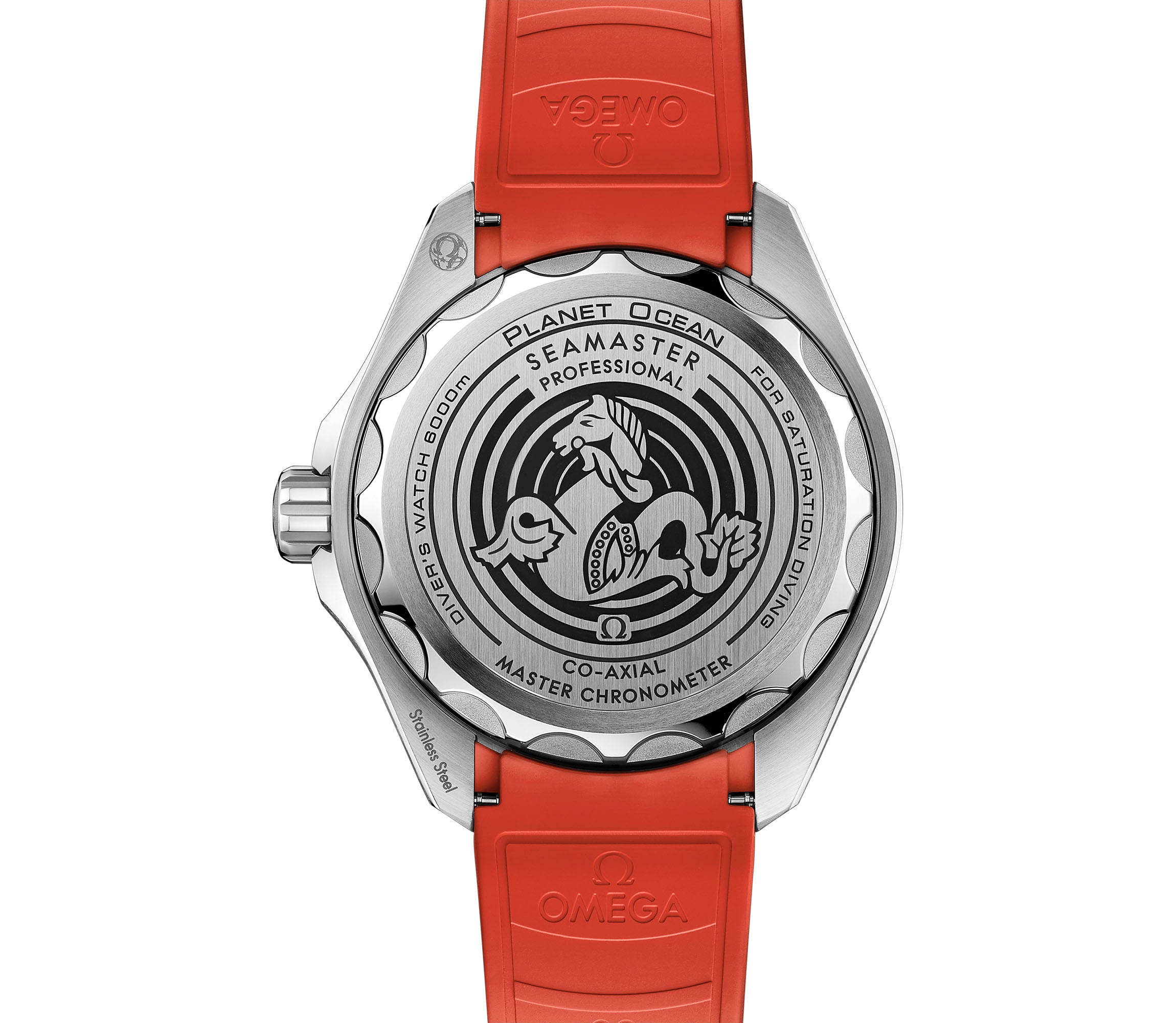 The case is made of a satin finished stainless steel including the crown. Mounted atop the case is a combined mirror and satin finish stainless steel with a ceramic orange divers bezel. Paired with the watch is a black rubber strap with a stainless steel tang buckle.