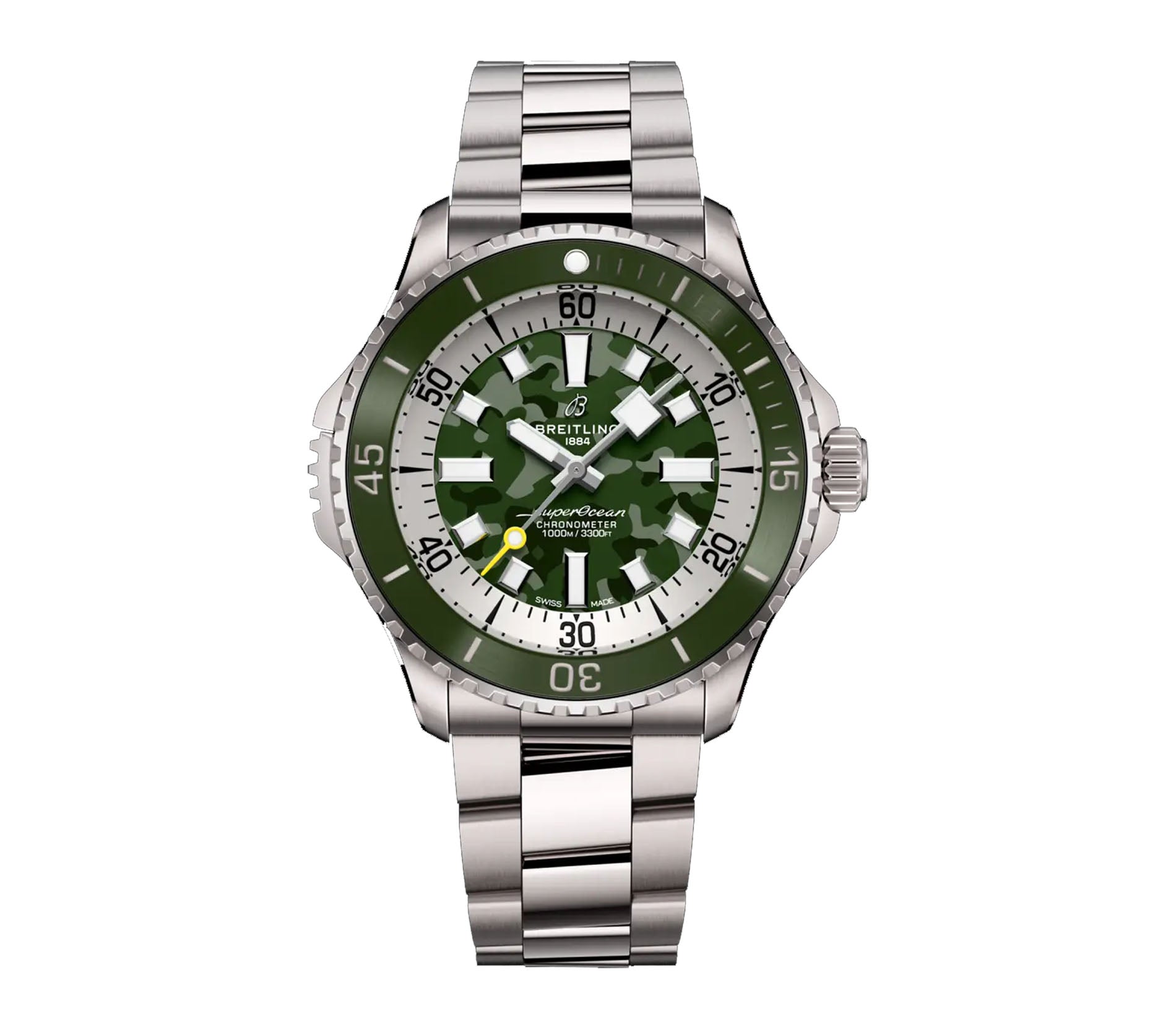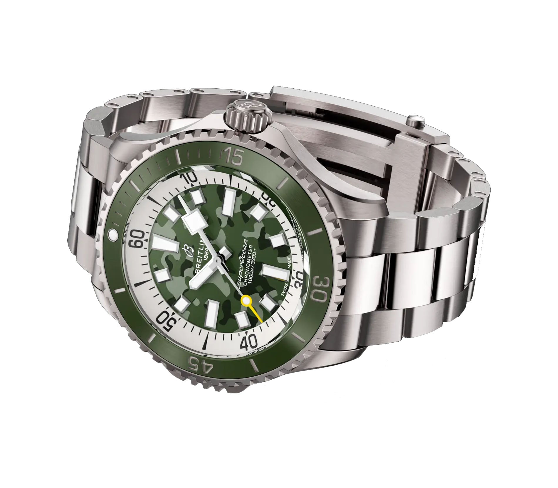 Functions are shown on a green camouflage dial with, white luminous hands and white index hour markers. These functions include hours, minutes and seconds