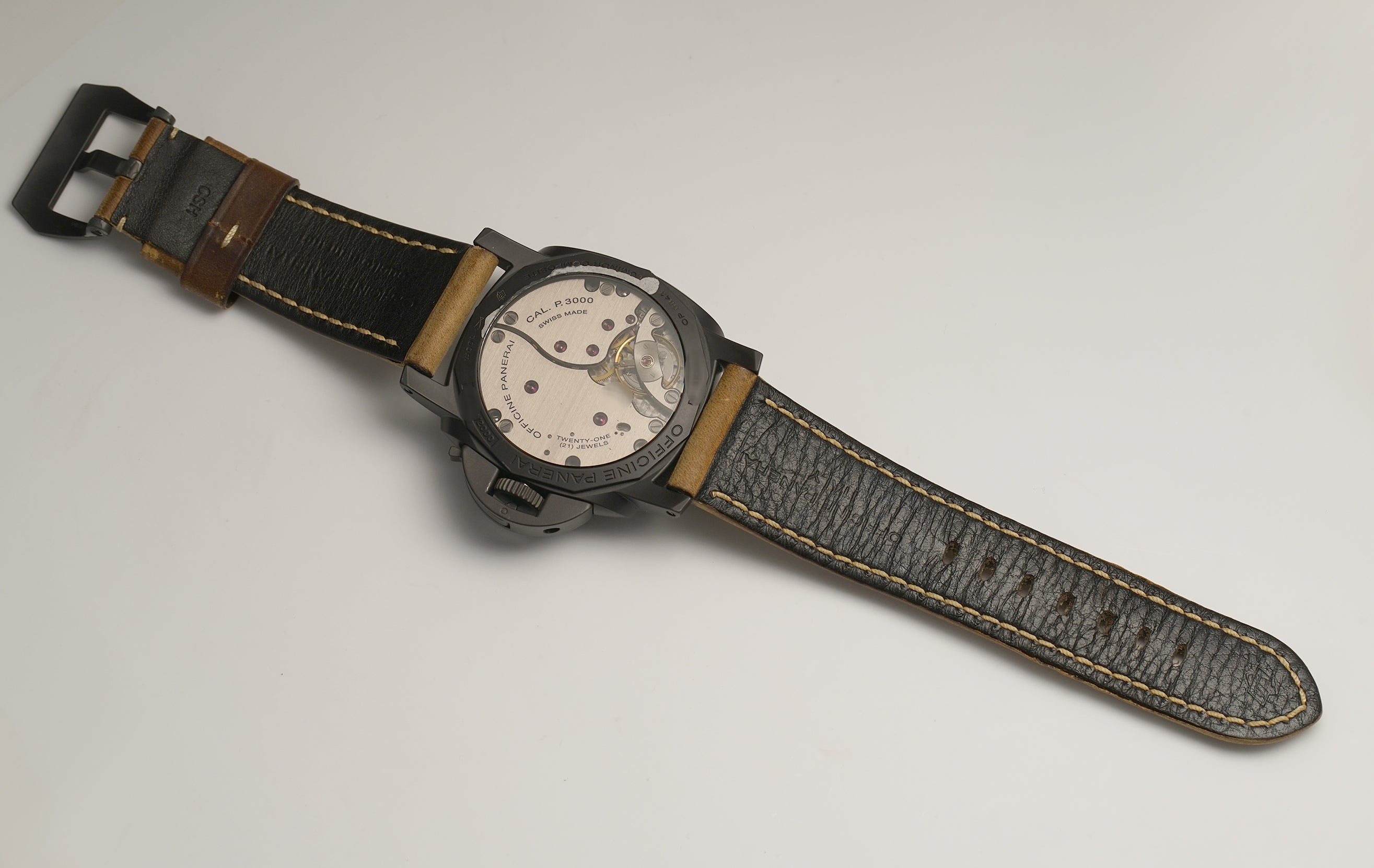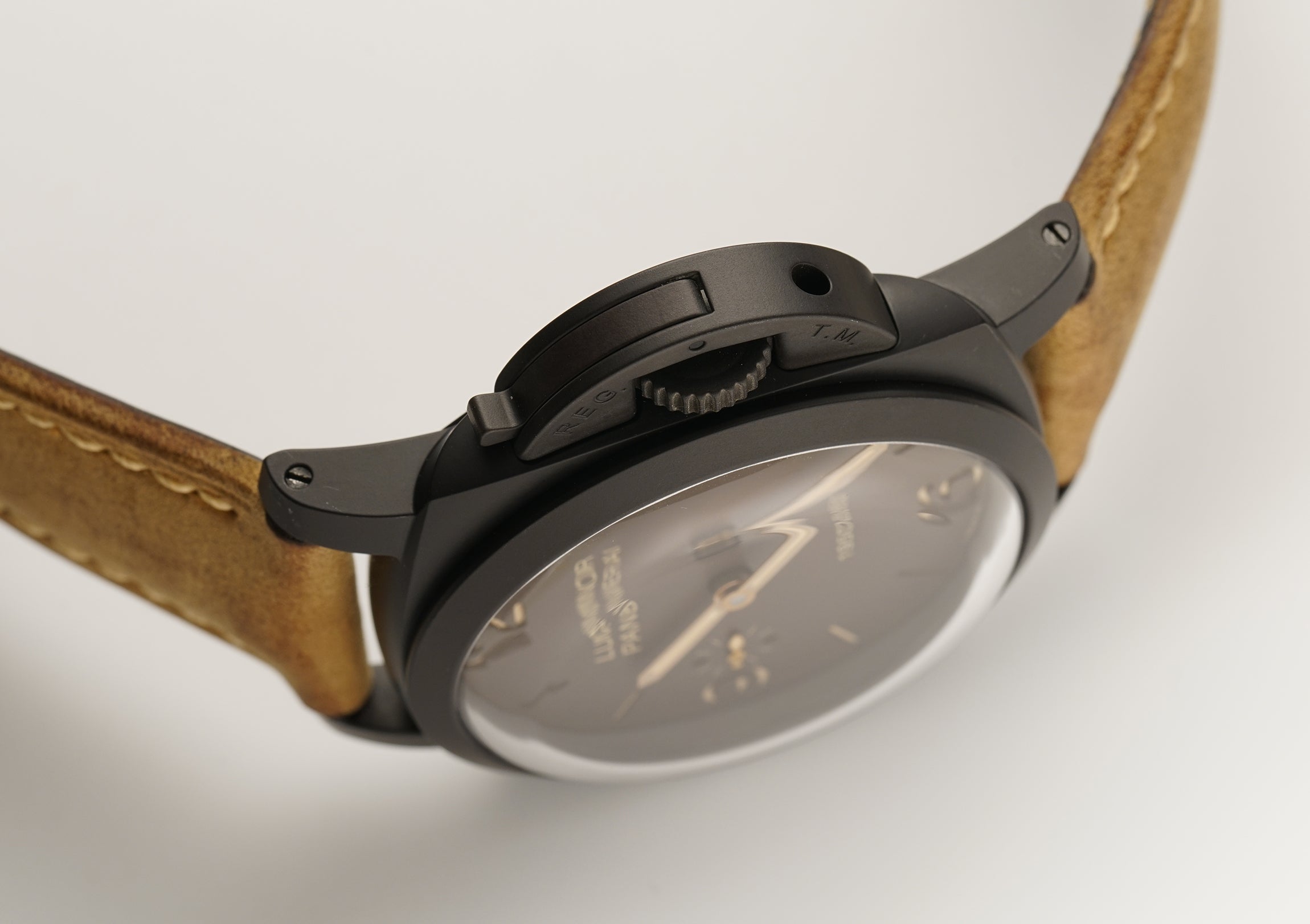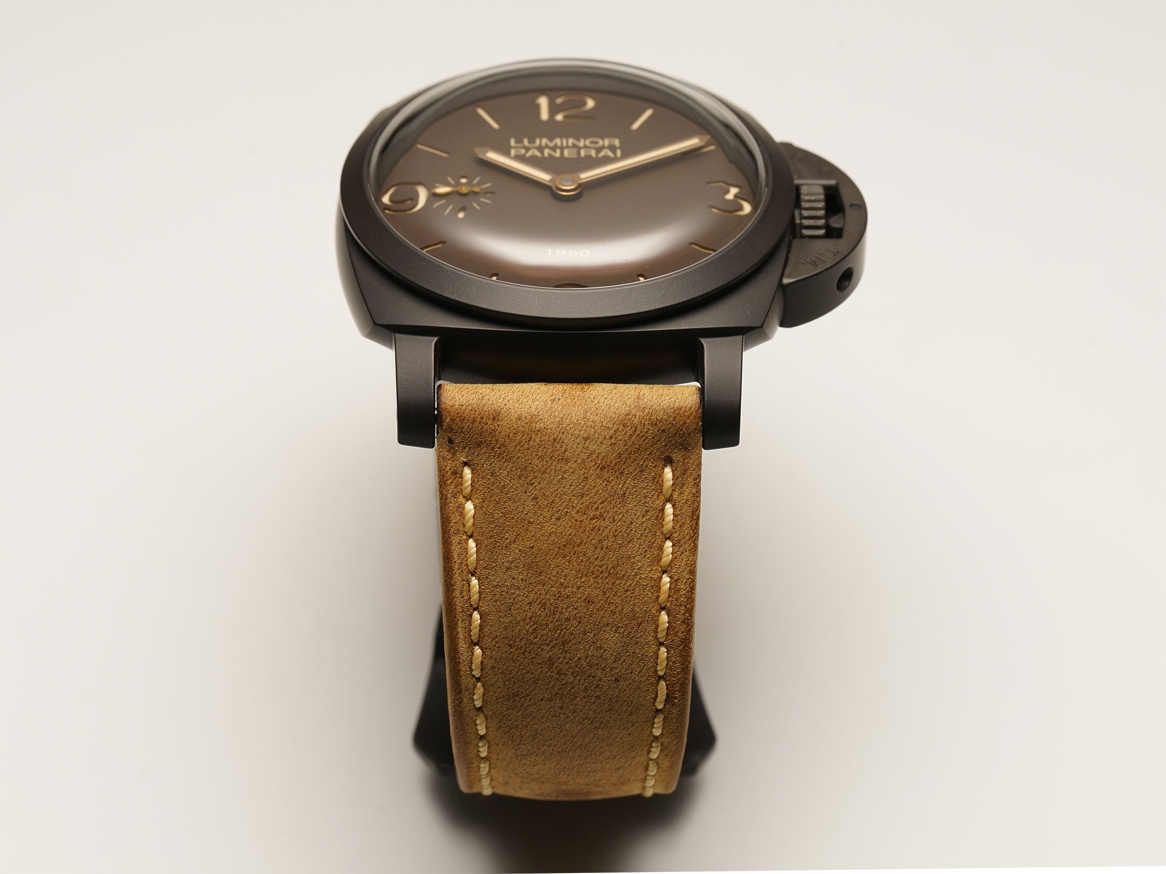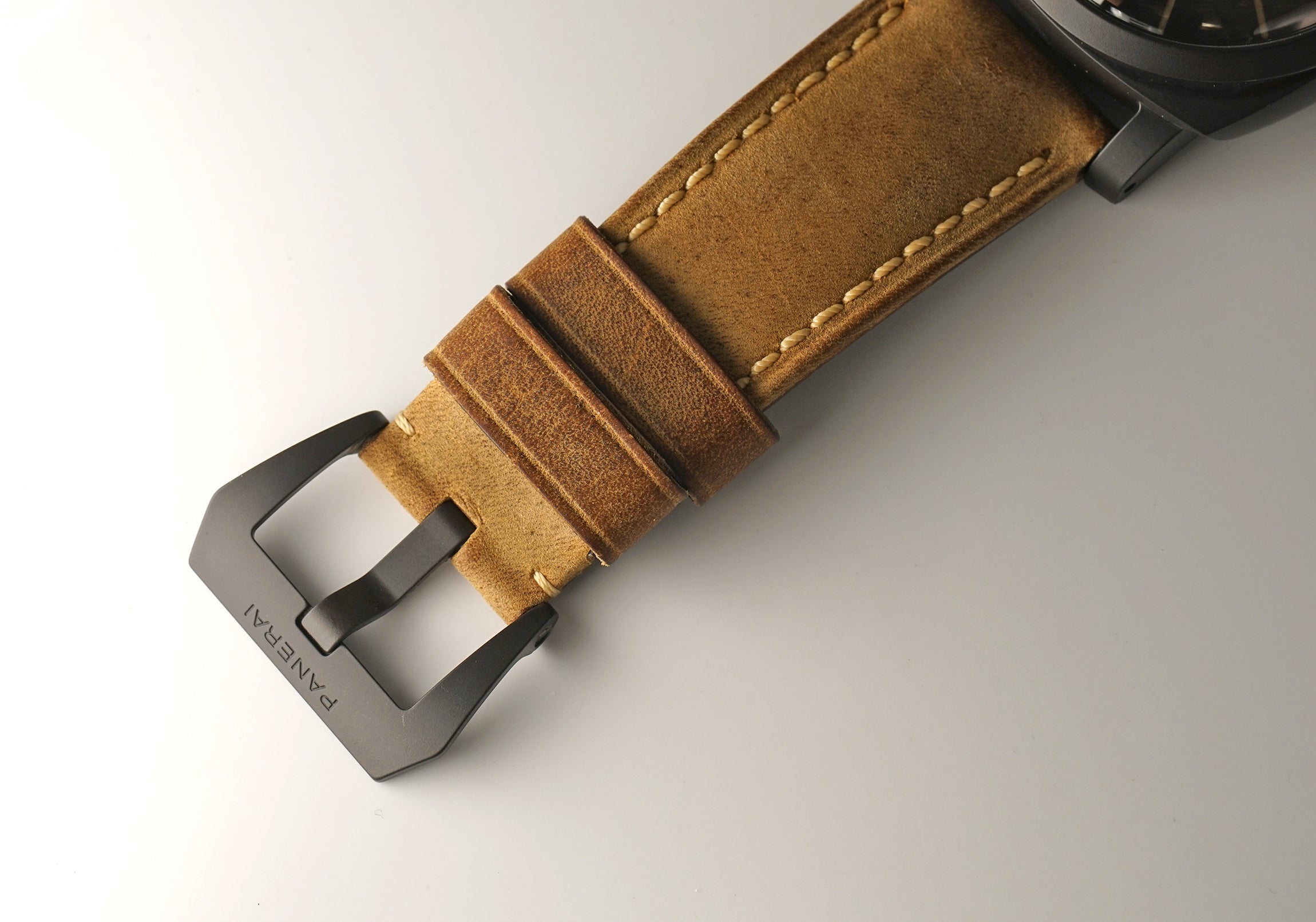 The case is made of a composite material, as is the bezel and crown guard. It is currently mounted on a Panerai tan leather strap (approximately 75% condition, so plenty of life) and that is paired with a Panerai composite tang buckle.
