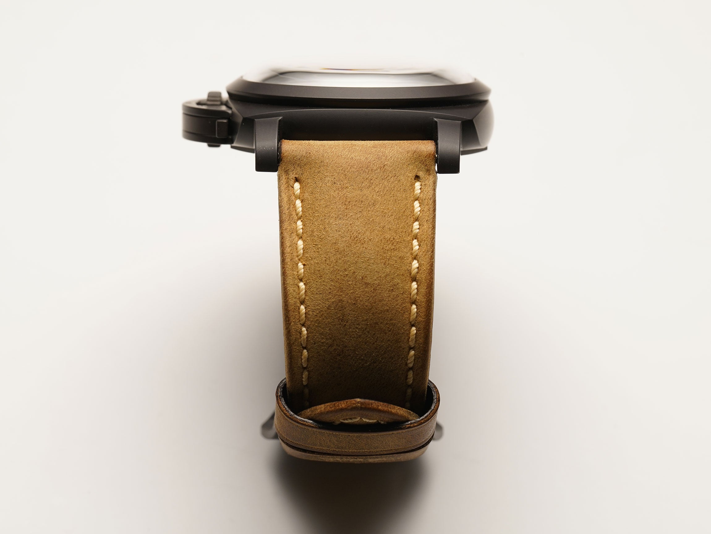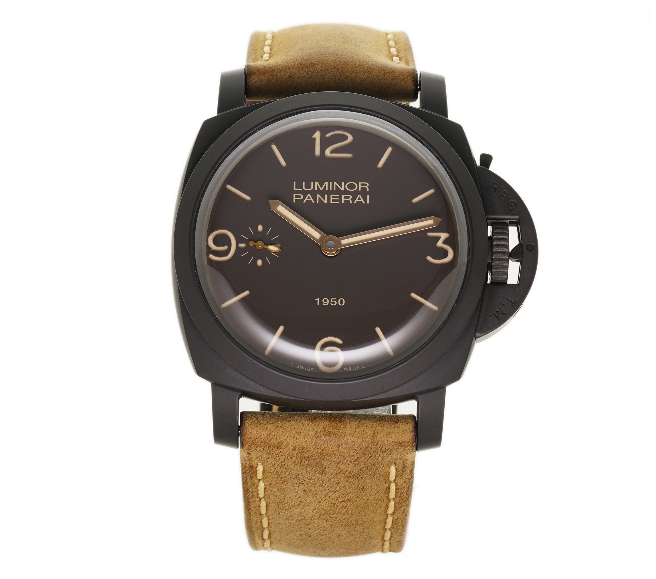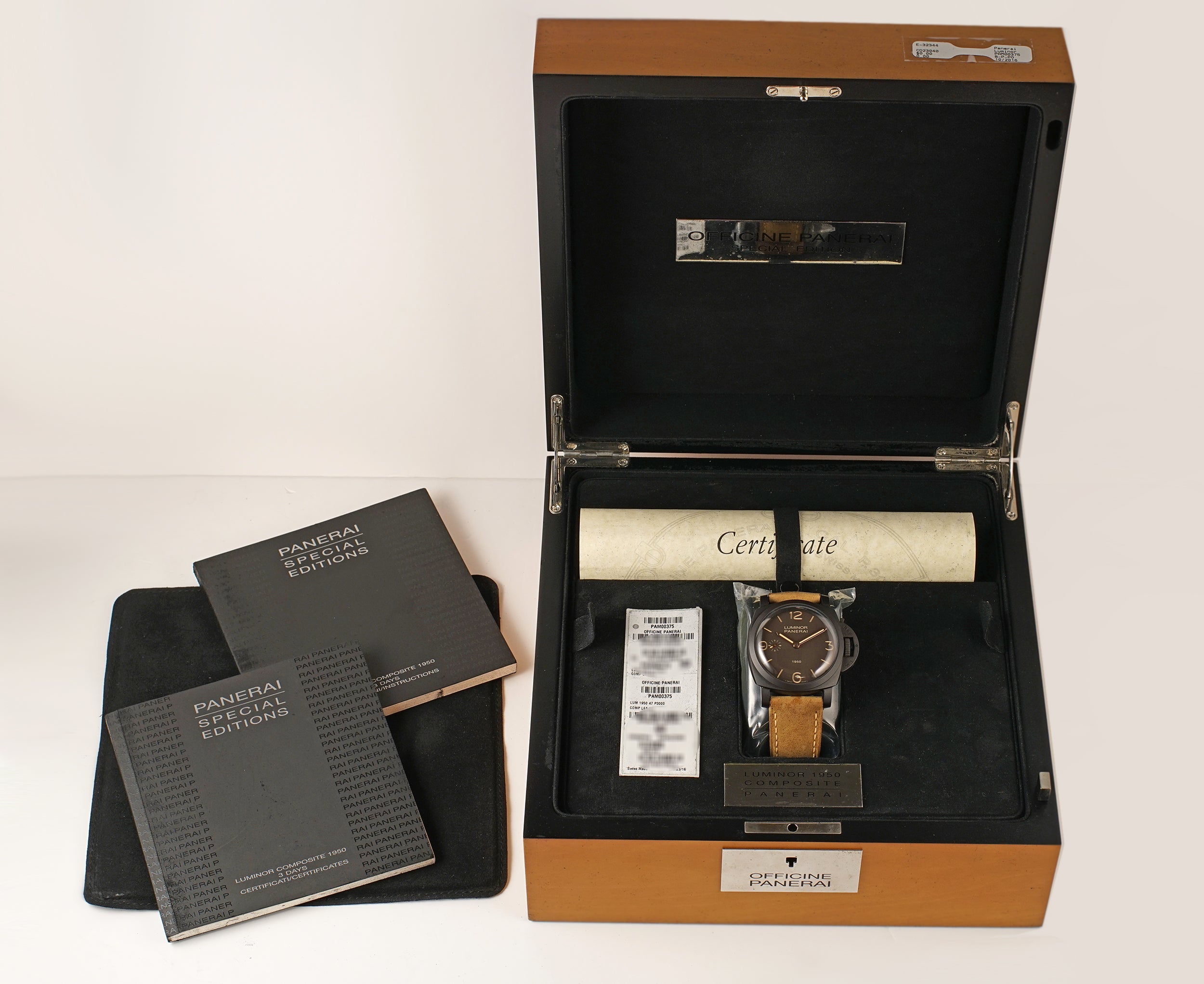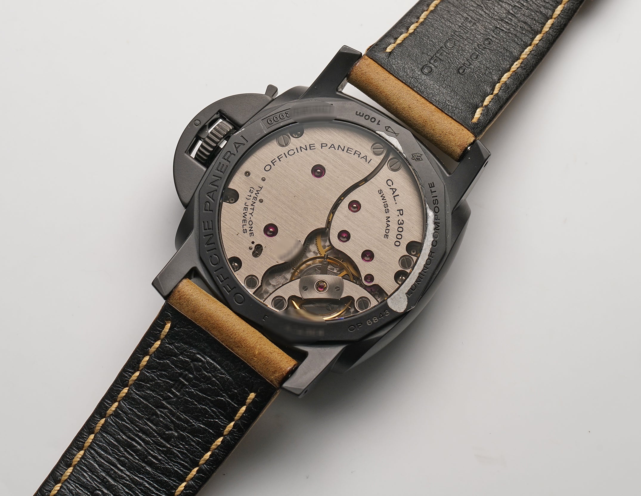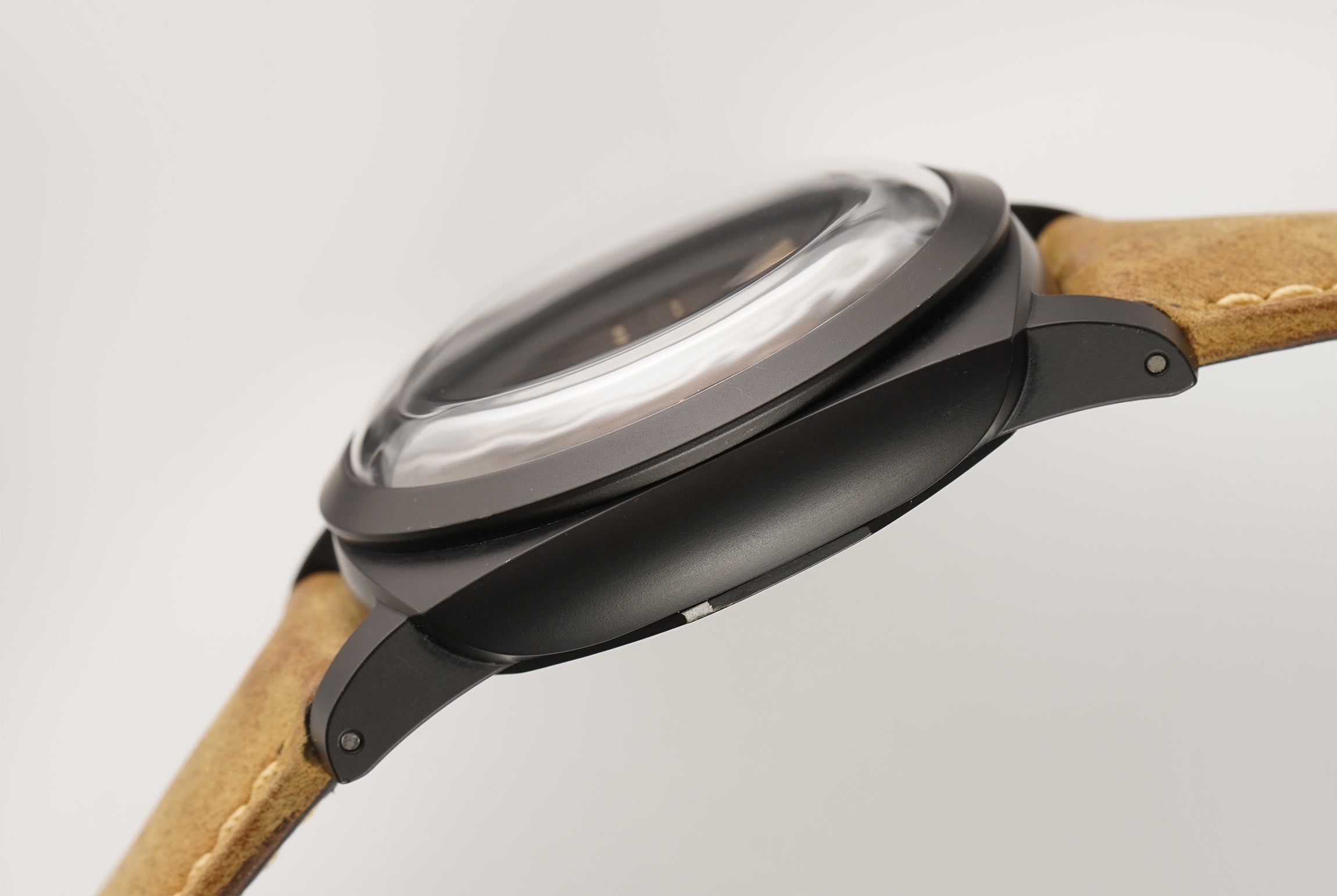 The case is made of a composite material, as is the bezel and crown guard. It is currently mounted on a Panerai tan leather strap (approximately 75% condition, so plenty of life) and that is paired with a Panerai composite tang buckle.