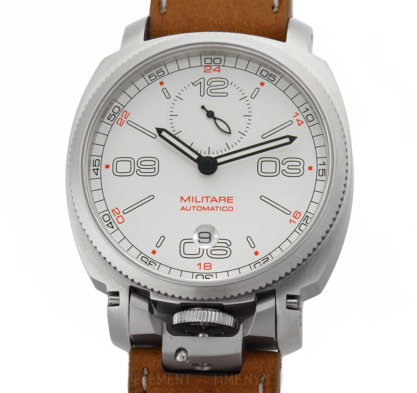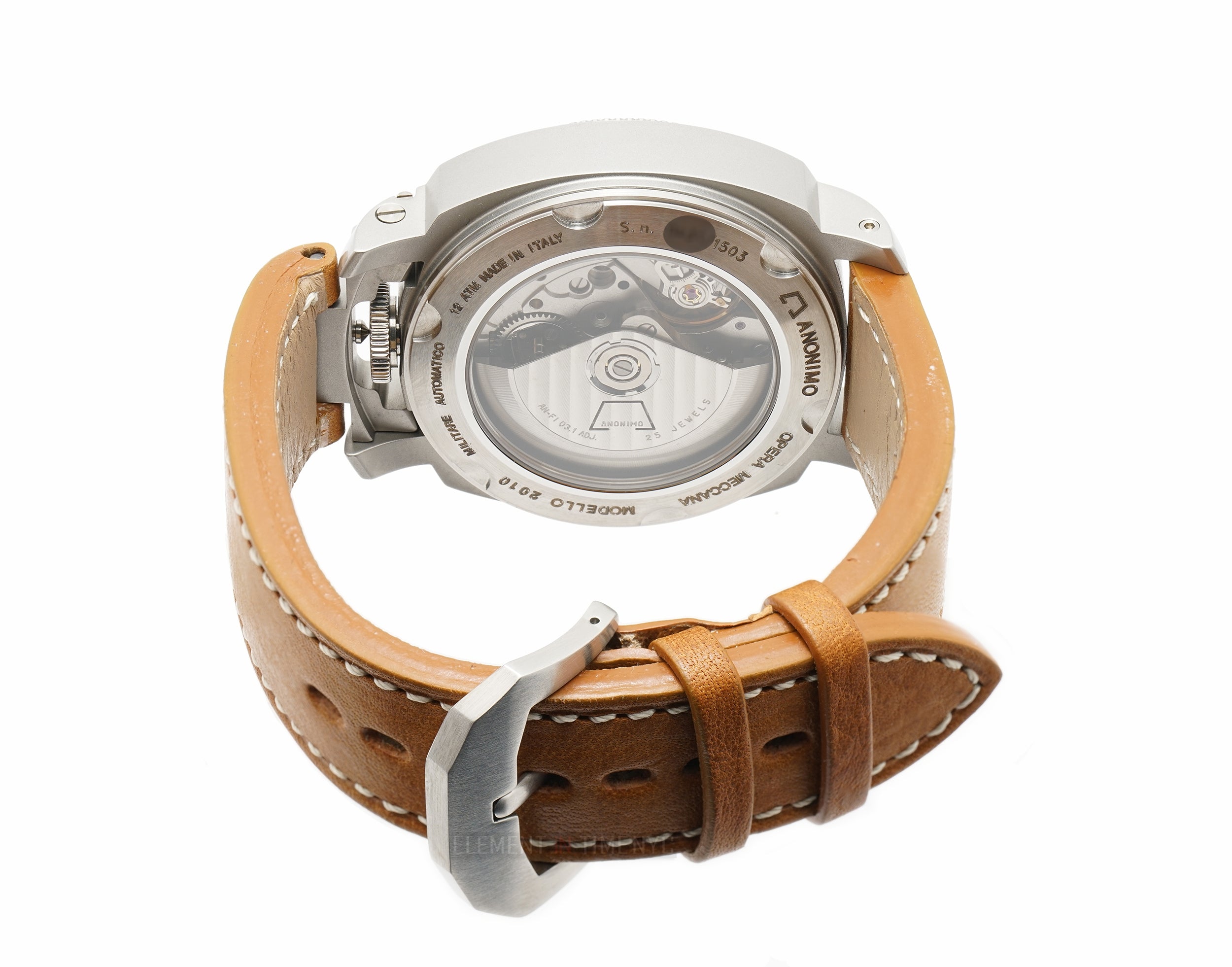 Currently Mounted On The Watch Is An Anonimo Brown Leather Strap. Securing The Watch On The Wrist Is An Anonimo Stainless Steel Tang Buckle.