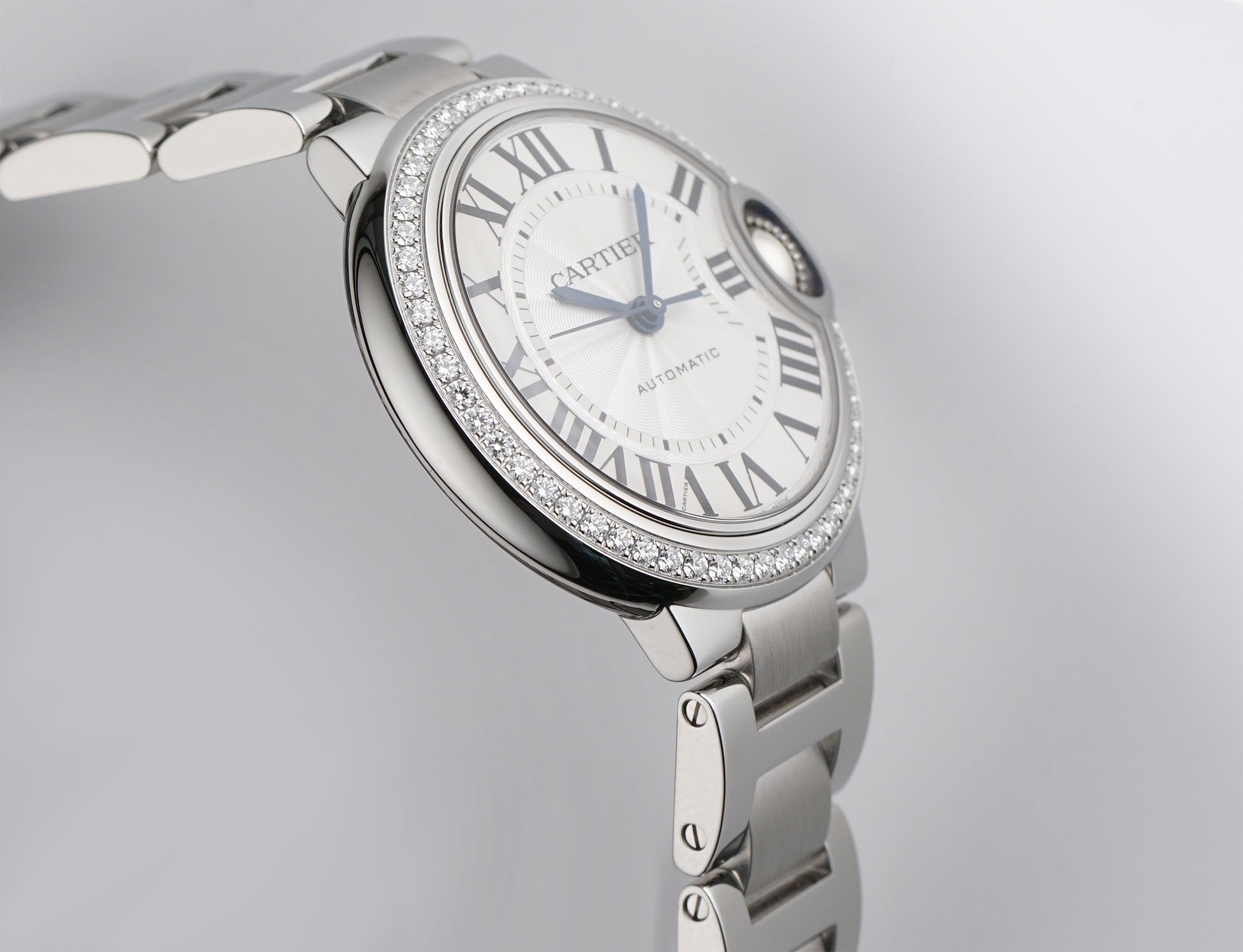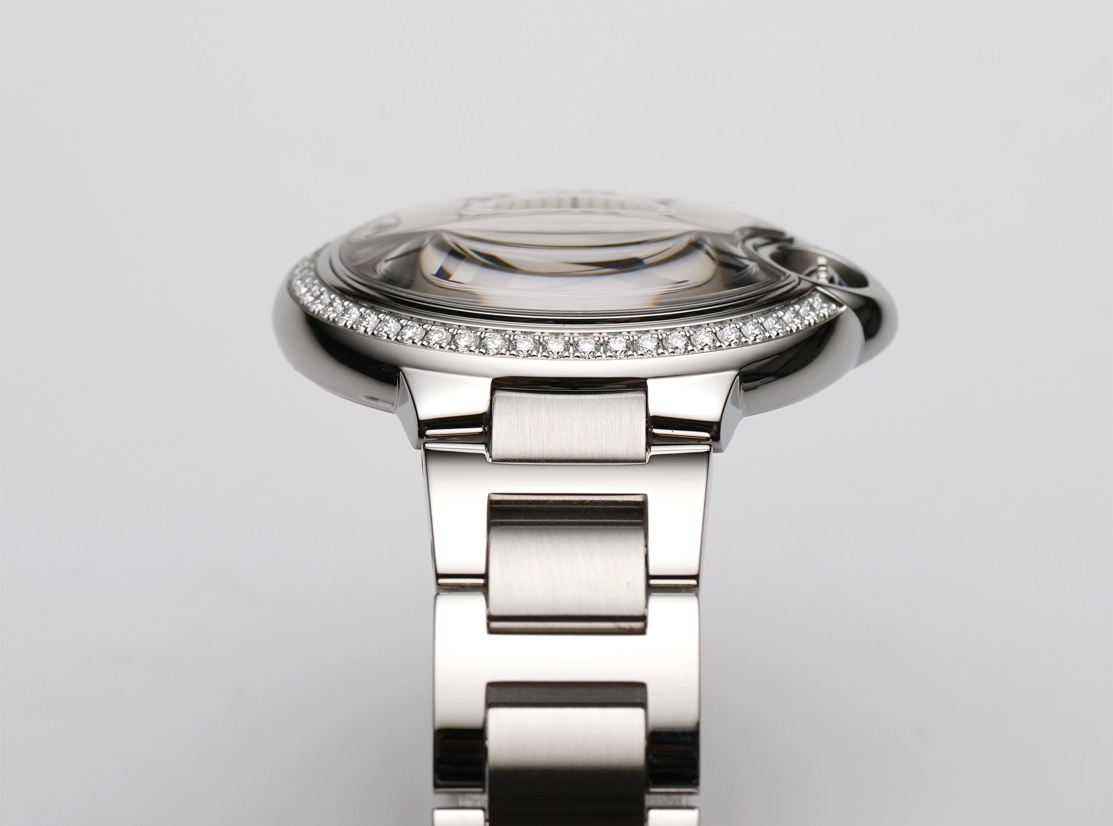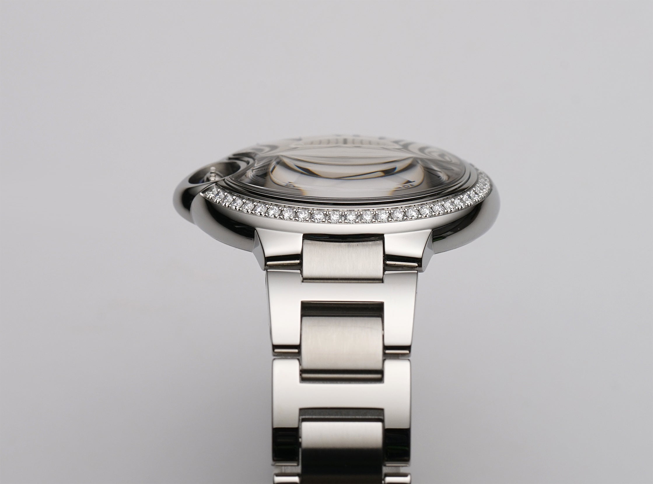 The case is made of a mirror finished stainless steel with a solid case back that has a satin finish to it. Mounted atop the case is a factory set diamond Bezel. It is paired with a stainless steel bracelet that features both mirror and satin finishes.