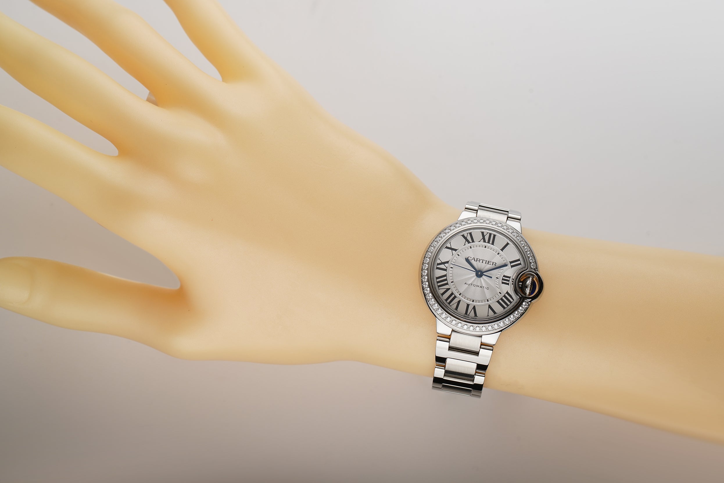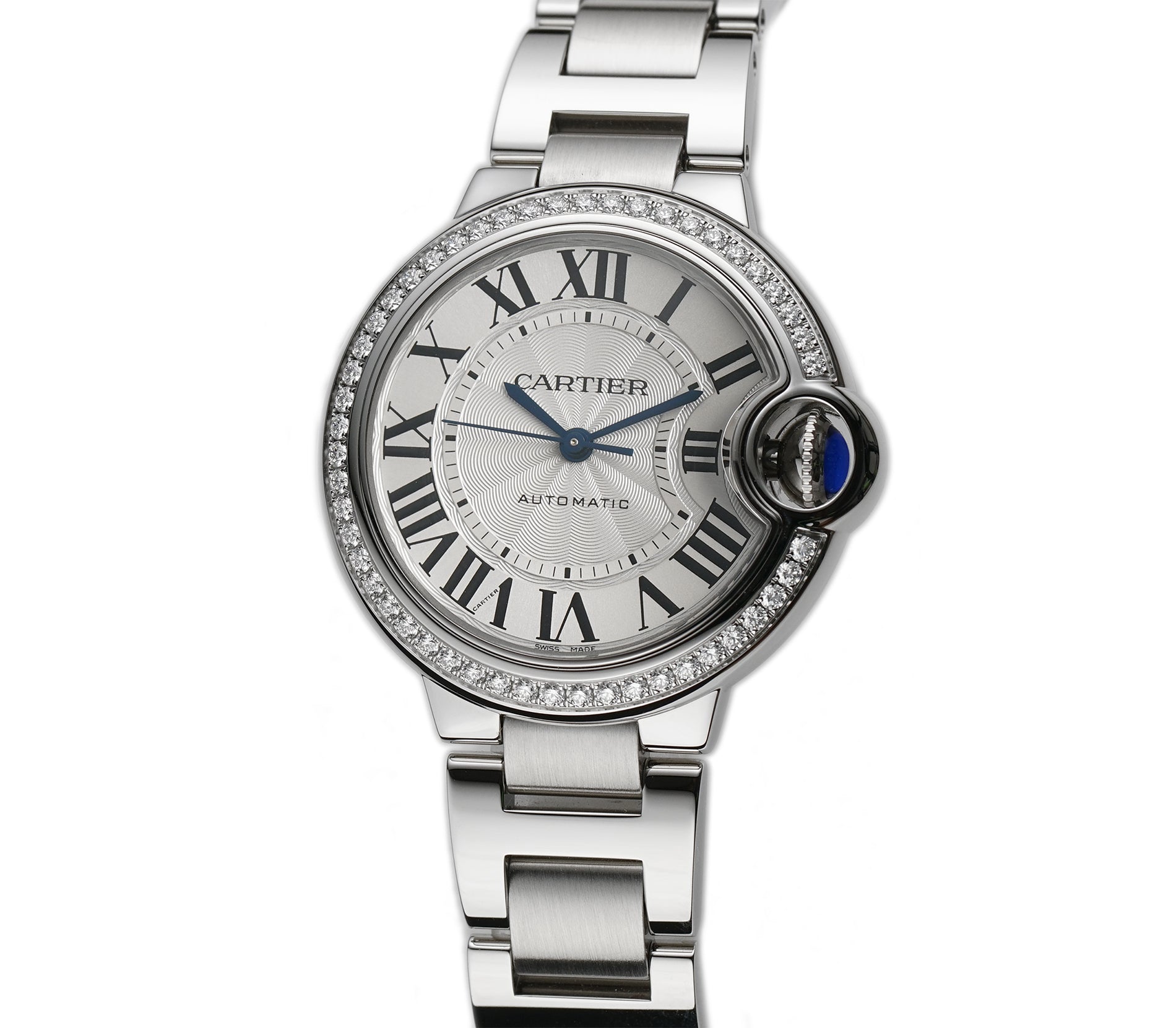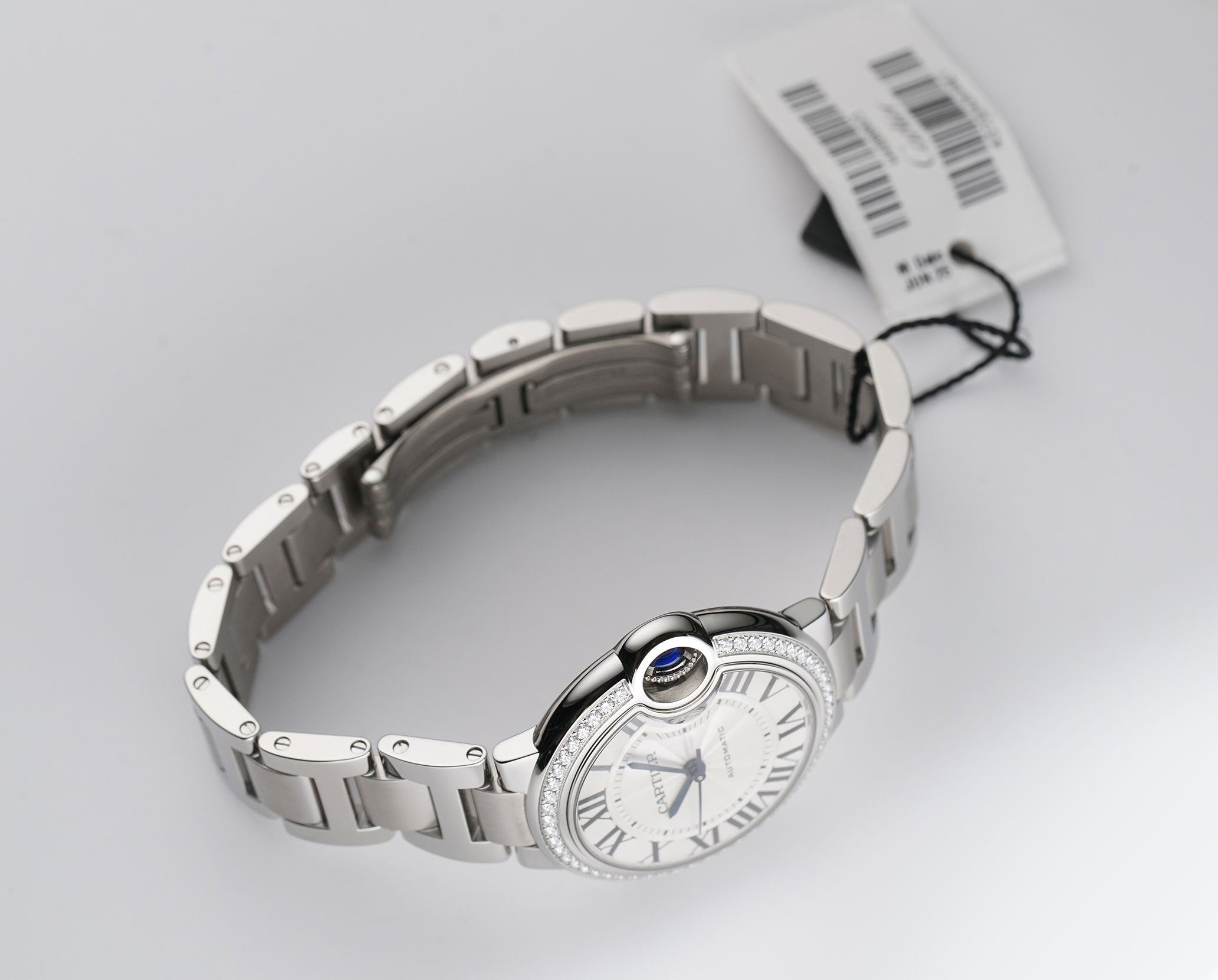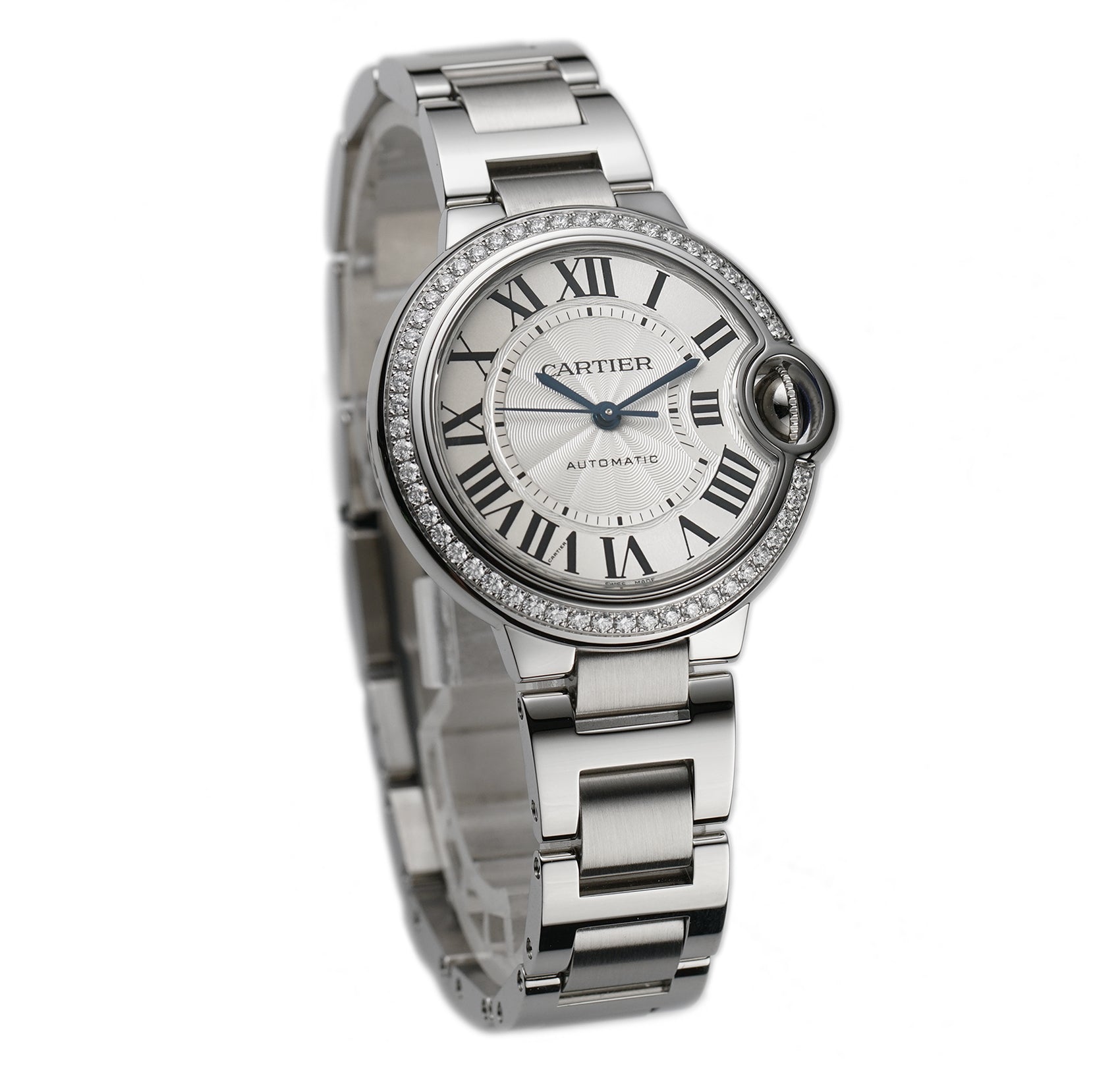 The case is made of a mirror finished stainless steel with a solid case back that has a satin finish to it. Mounted atop the case is a factory set diamond Bezel. It is paired with a stainless steel bracelet that features both mirror and satin finishes.