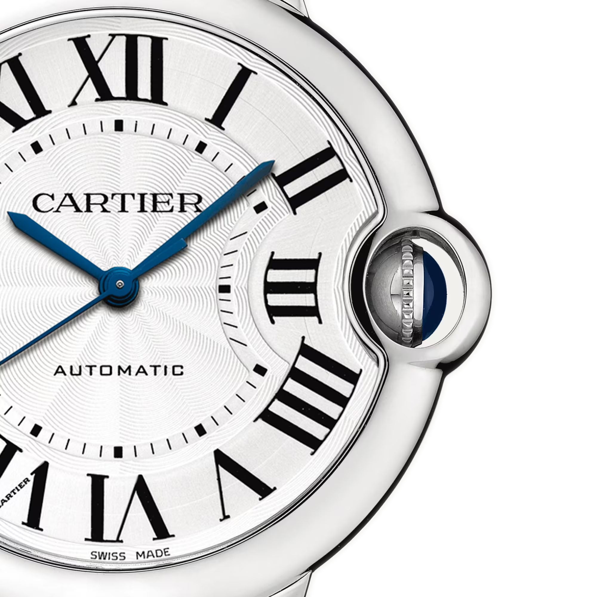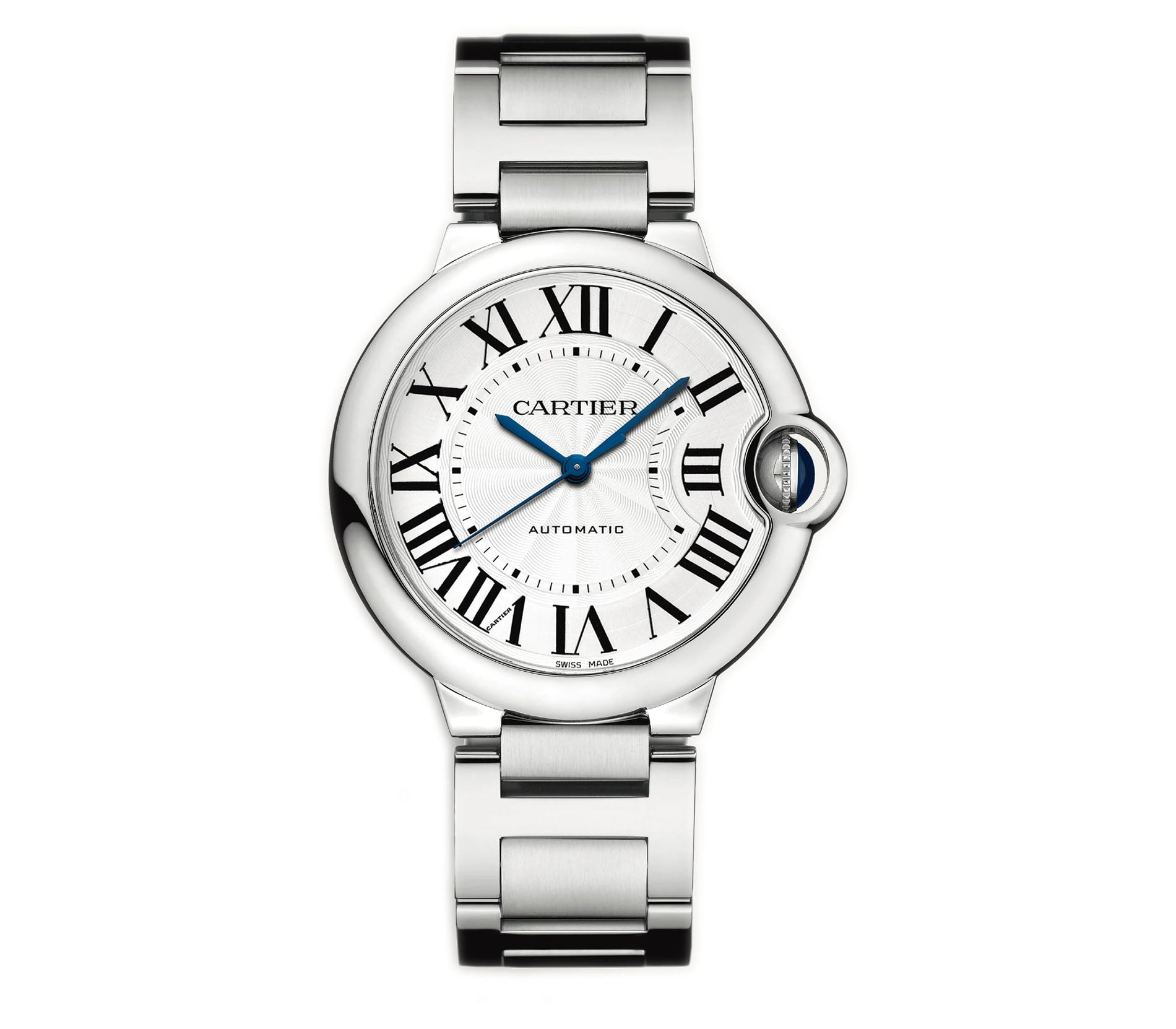 Time is displayed on a silver dial with blued steel hands and black roman hour markers.