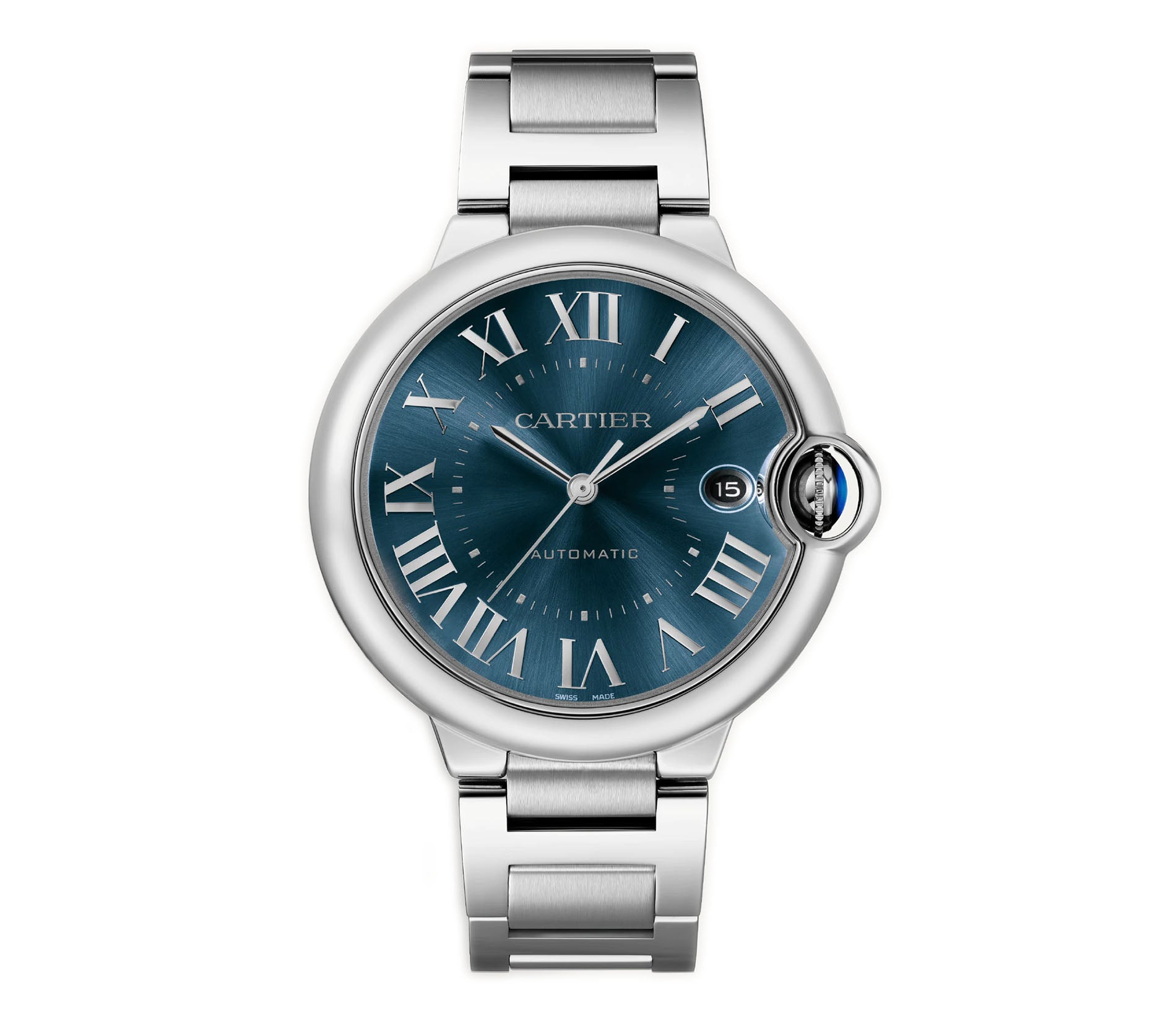 Time is displayed on a blue sunray-brushed dial with blued steel hands and silver roman hour markers. Date aperture is present at 3'o Clock position.