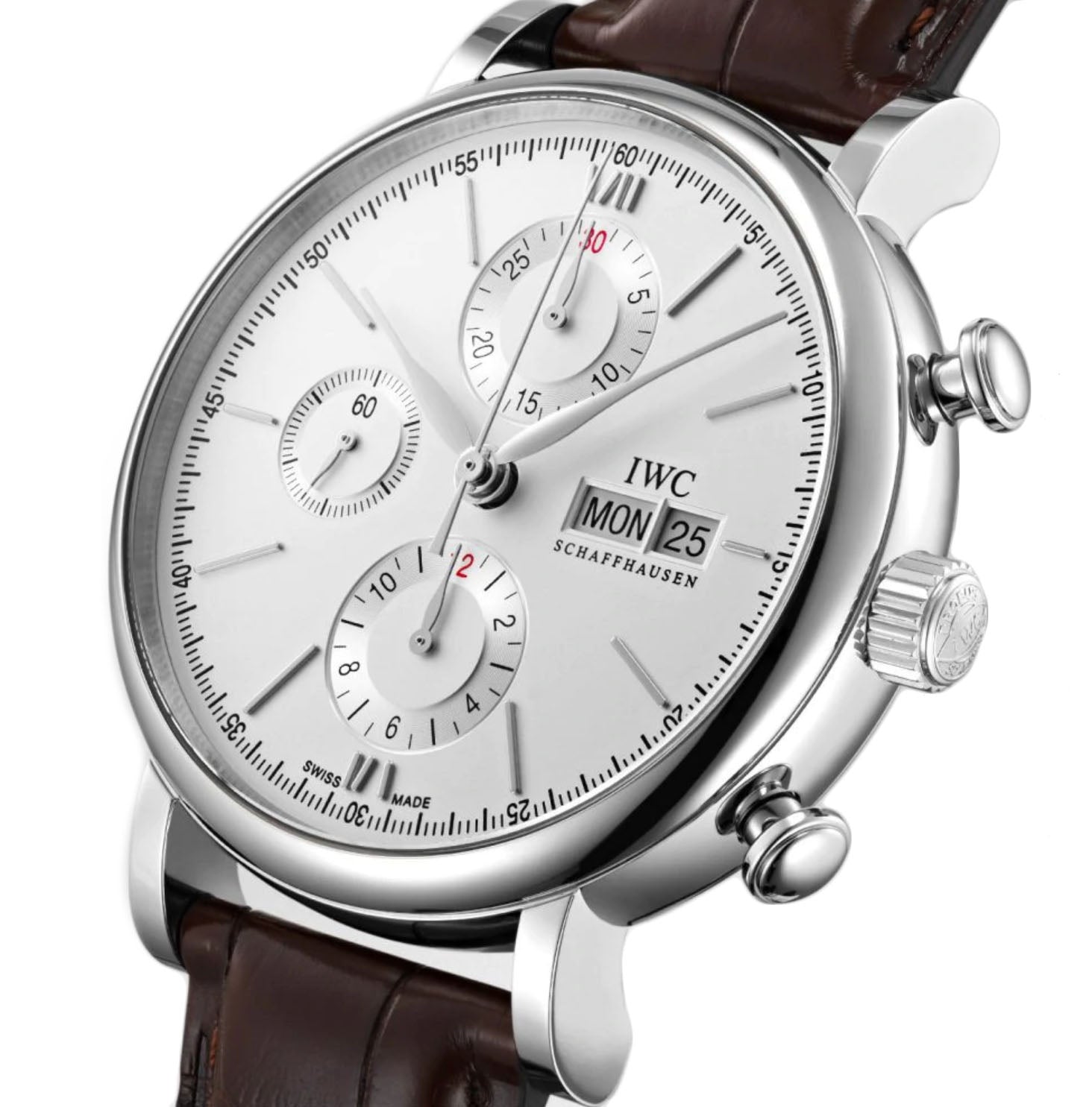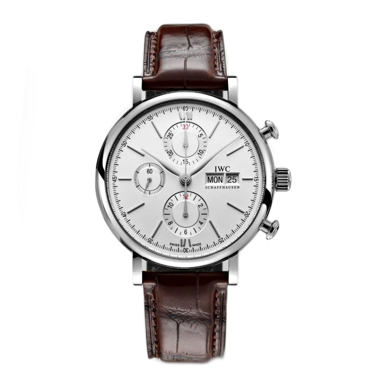 Functions are displayed on a silver dial accompanied by polished steel hands and index hour markers.