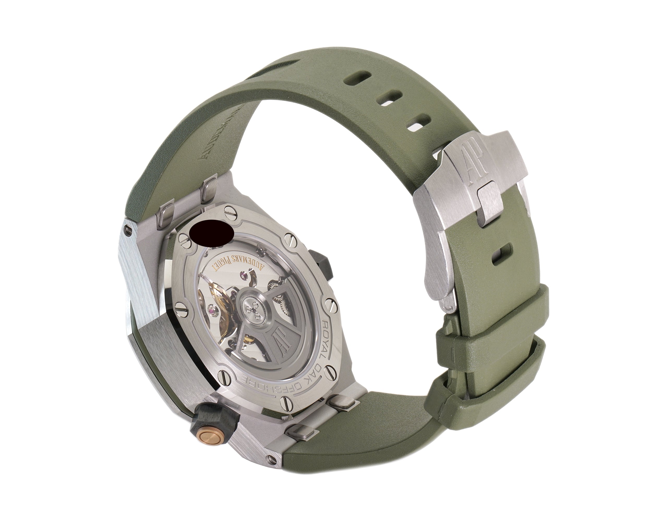Time is displayed on a khaki green dial with “Méga Tapisserie” pattern, rose gold applied hour-markers and Royal Oak hands with luminescent coating, black rotating inner bezel with diving scale and zone from 60 to 15 minutes in beige. A date window is located at the 3 o'clock position.