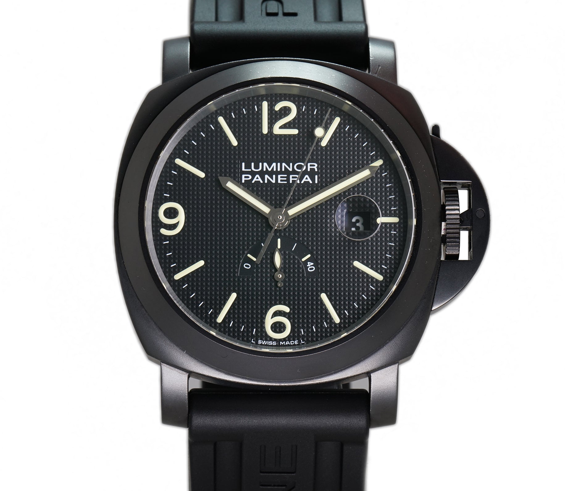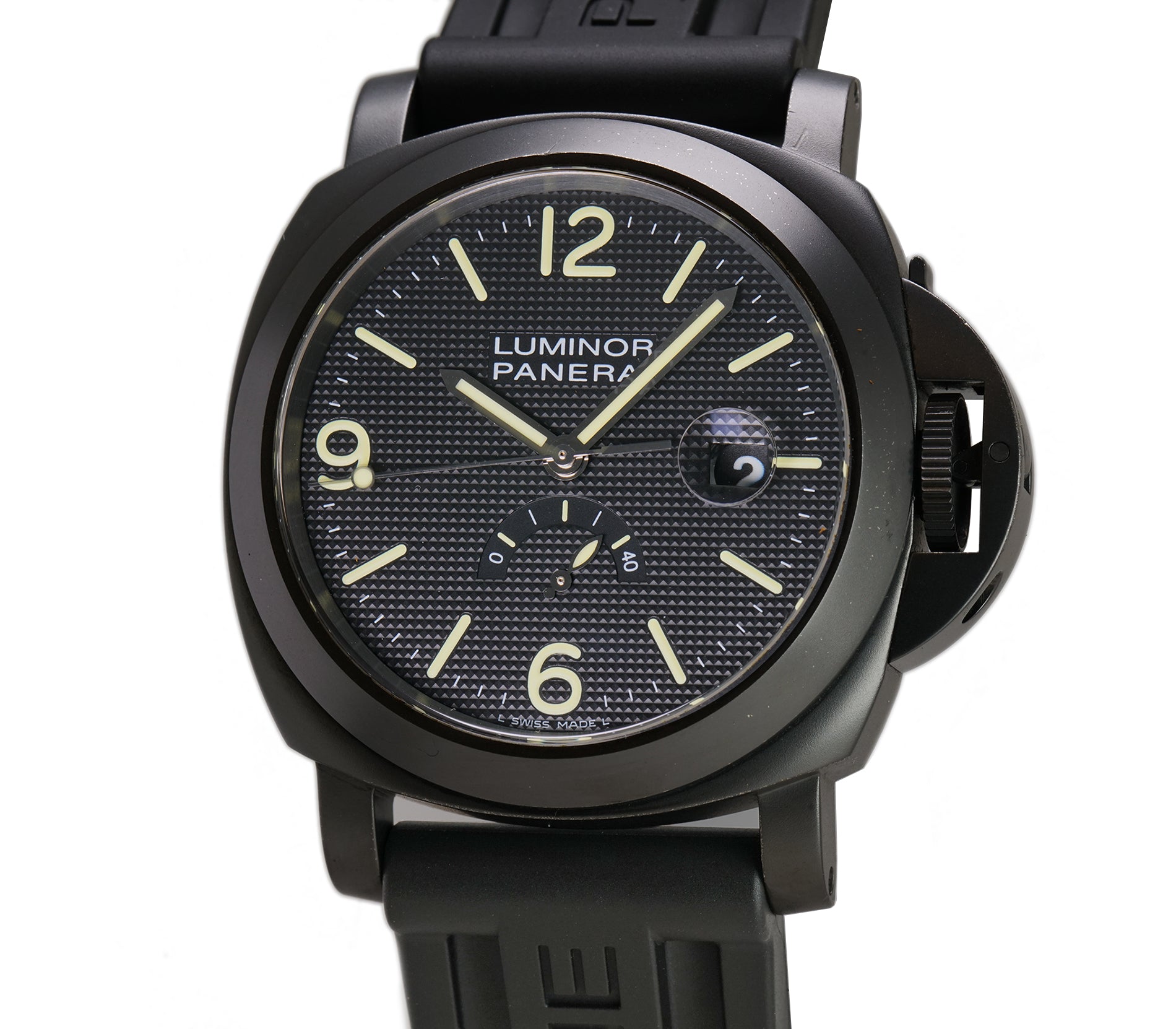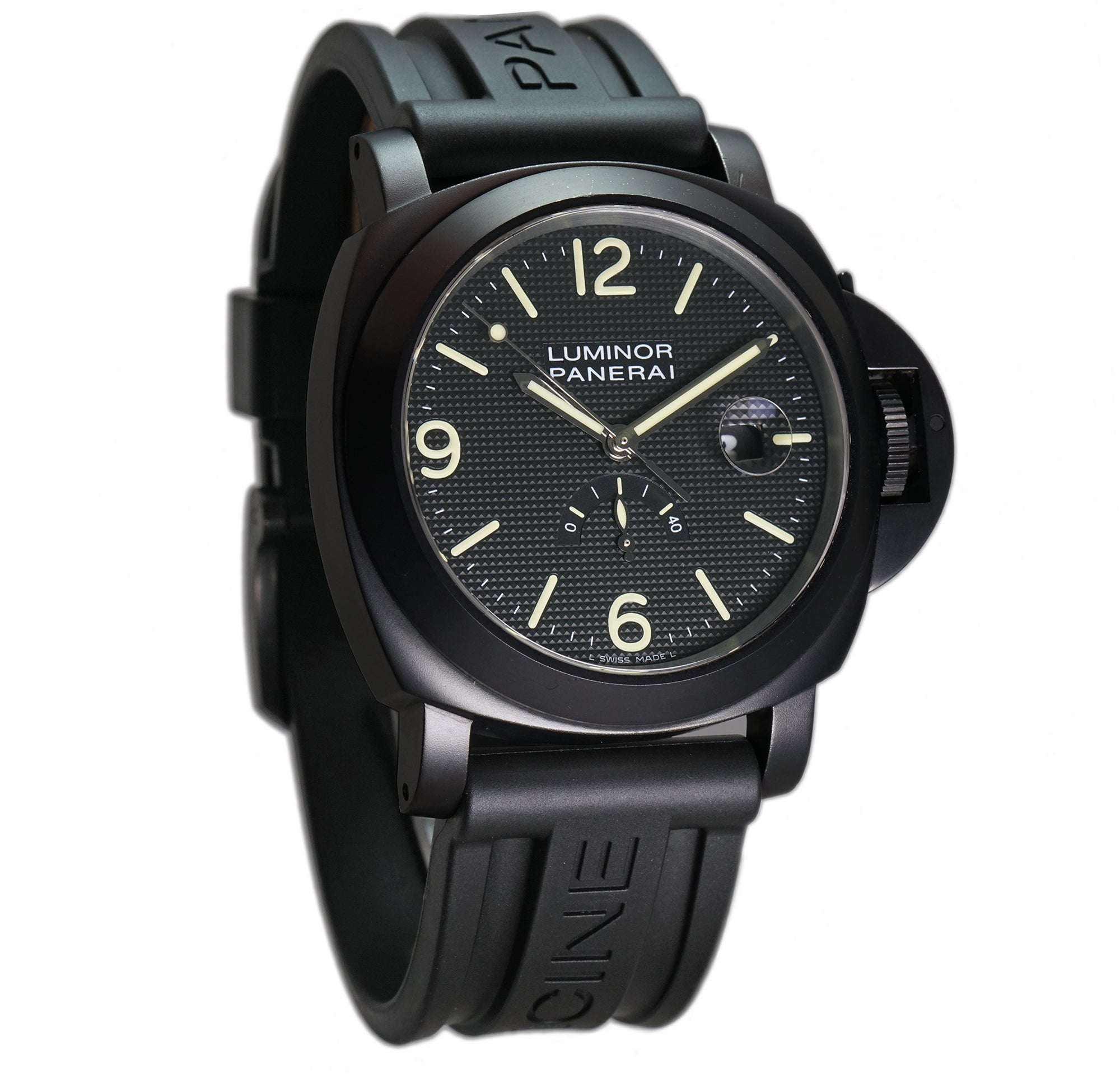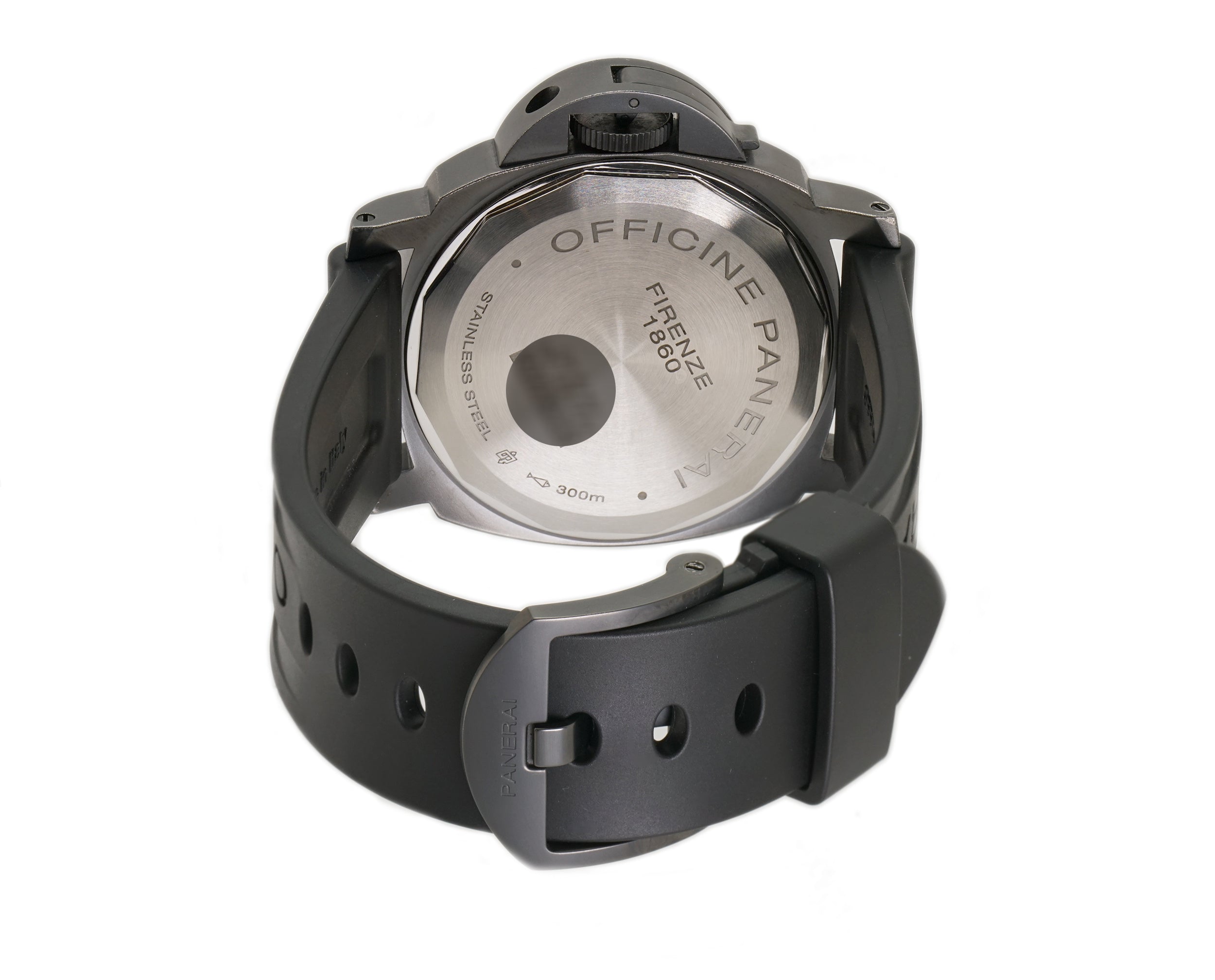 Case, bezel and tang buckle are made of a stainless steel core that has received a black PVD coating. It is currently mounted on a Panerai black rubber strap that is in excellent condition as well.