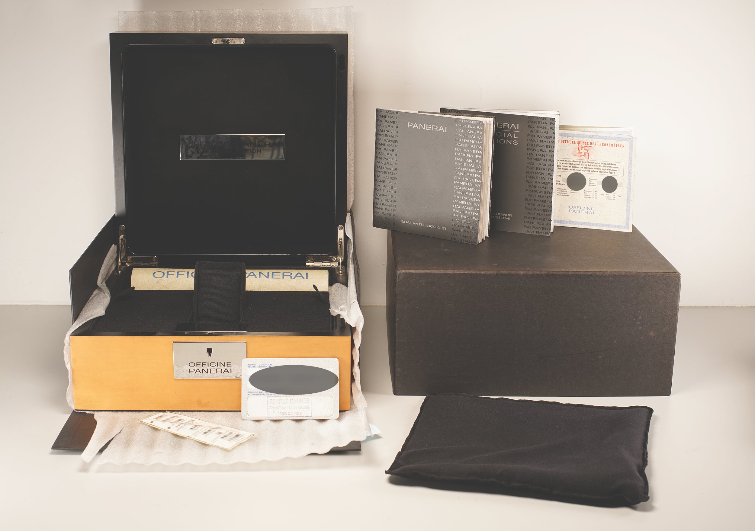 Watch comes with the full set including Panerai special edition double box, limited edition scroll, Instruction manual booklet, guarantee booklet, COSC, warranty card and lastly the stickers. The inner material of the wooden box has begun to deteriorate so there is some loose residue from the fabric.