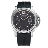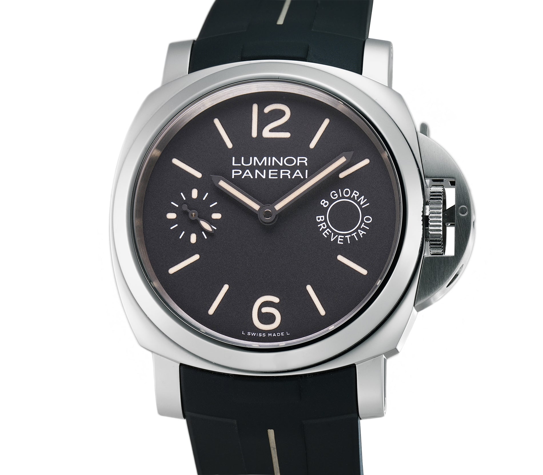 Case is made of high-polish finished stainless steel, as is the bezel mounted atop. The bezel guard is of brush-finished stainless steel and the solid case back is made of stainless steel that has a spun finish to it. Watch is currently mounted on a black RubberB strap that has an ecrue line down the middle which perfect compliments the hands and hour markers. The tang buckle is OEM Panerai, high-polish finished stainless steel.