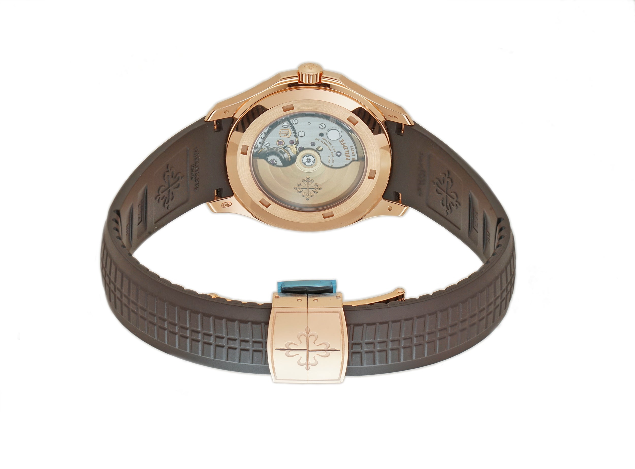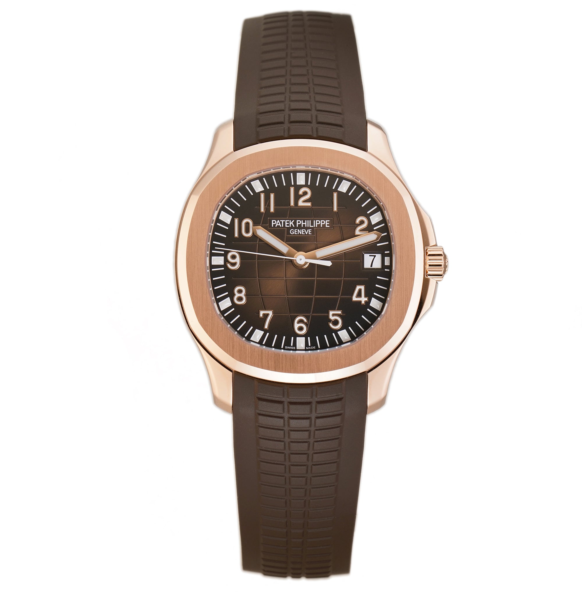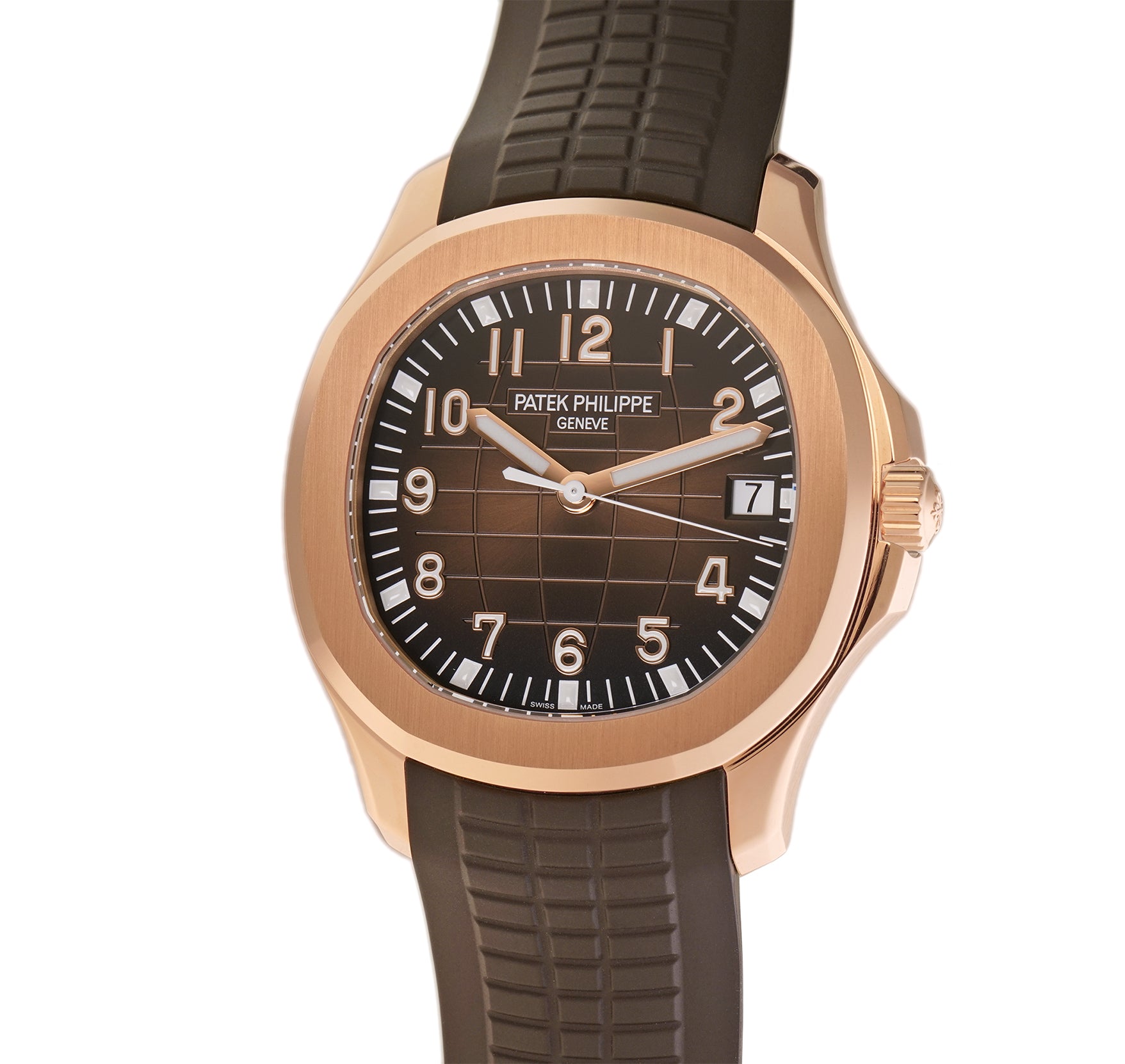 Time and date are displayed on a sunburst brown with black-gradient rim, embossed aquanaut patter dial that is accompanied by luminescent filled gold hands as well as luminescent filled gold applied Arabic numerals and luminescent applied markers on the outskirts.