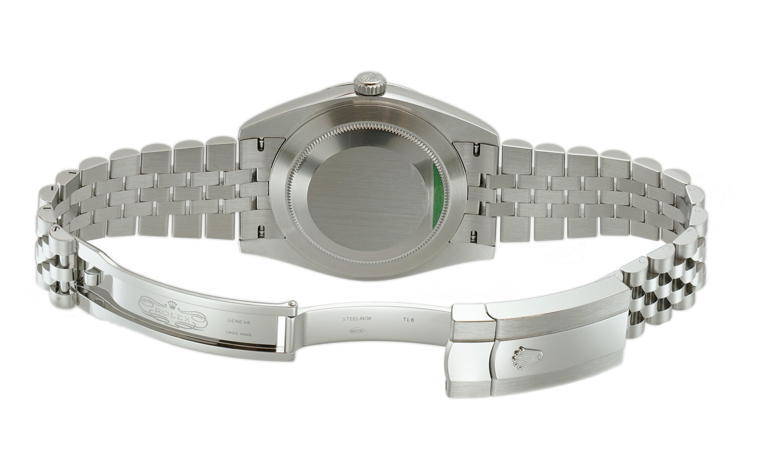 Case is made of high-polish finished stainless steel with the exception of the case back which is combination of satin-finished and high-polish stainless steel. Mounted atop is a stainless steel smooth bezel. The jubilee bracelet is of the same material, with high-polish finished center links and brush-finished outer links.