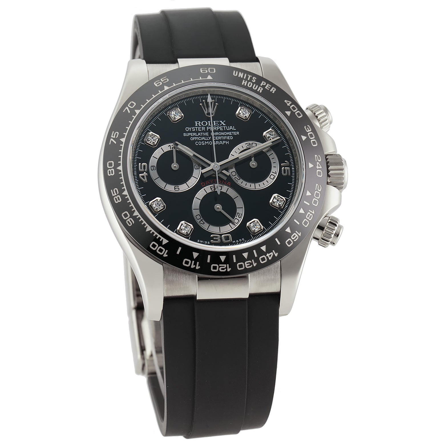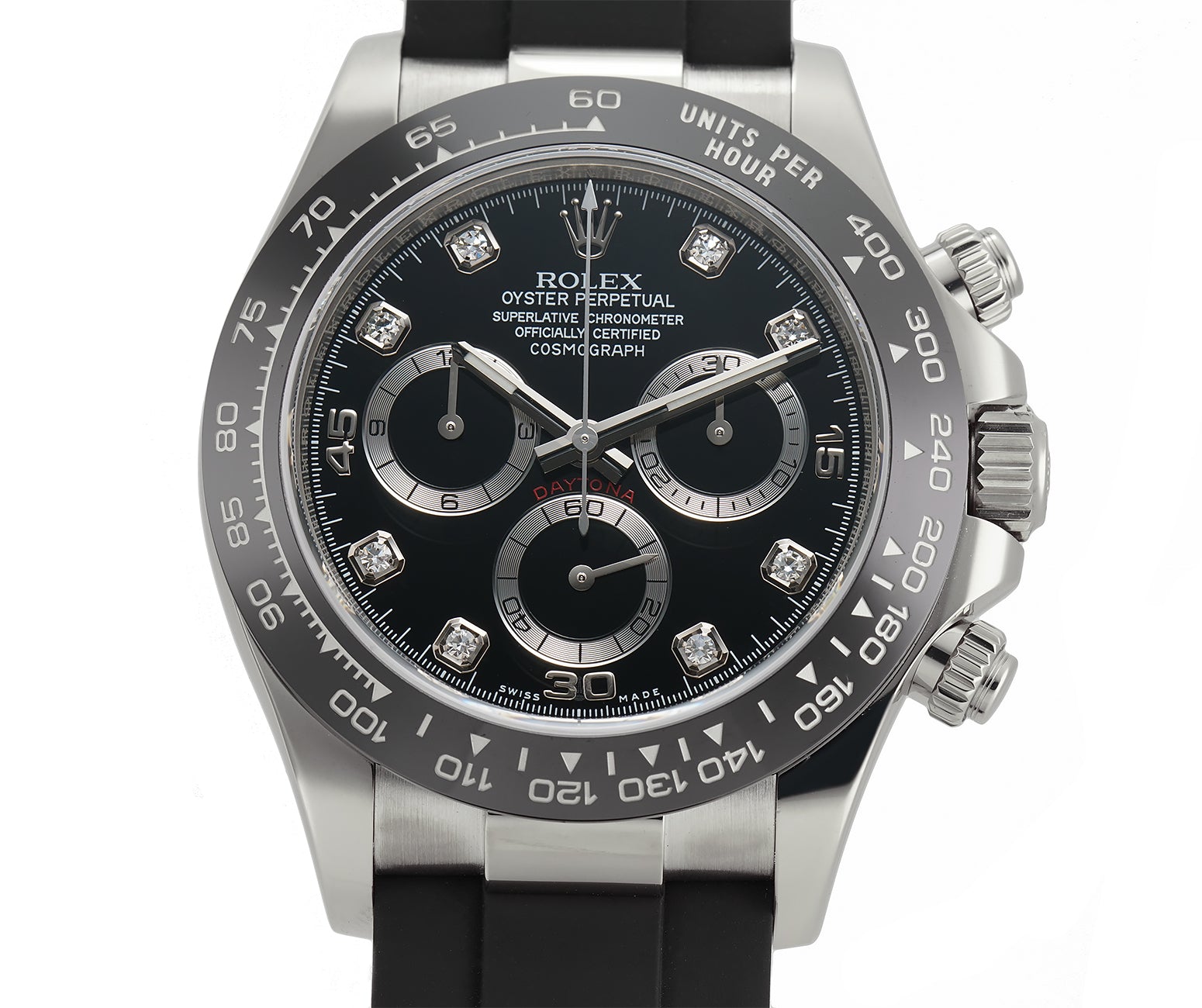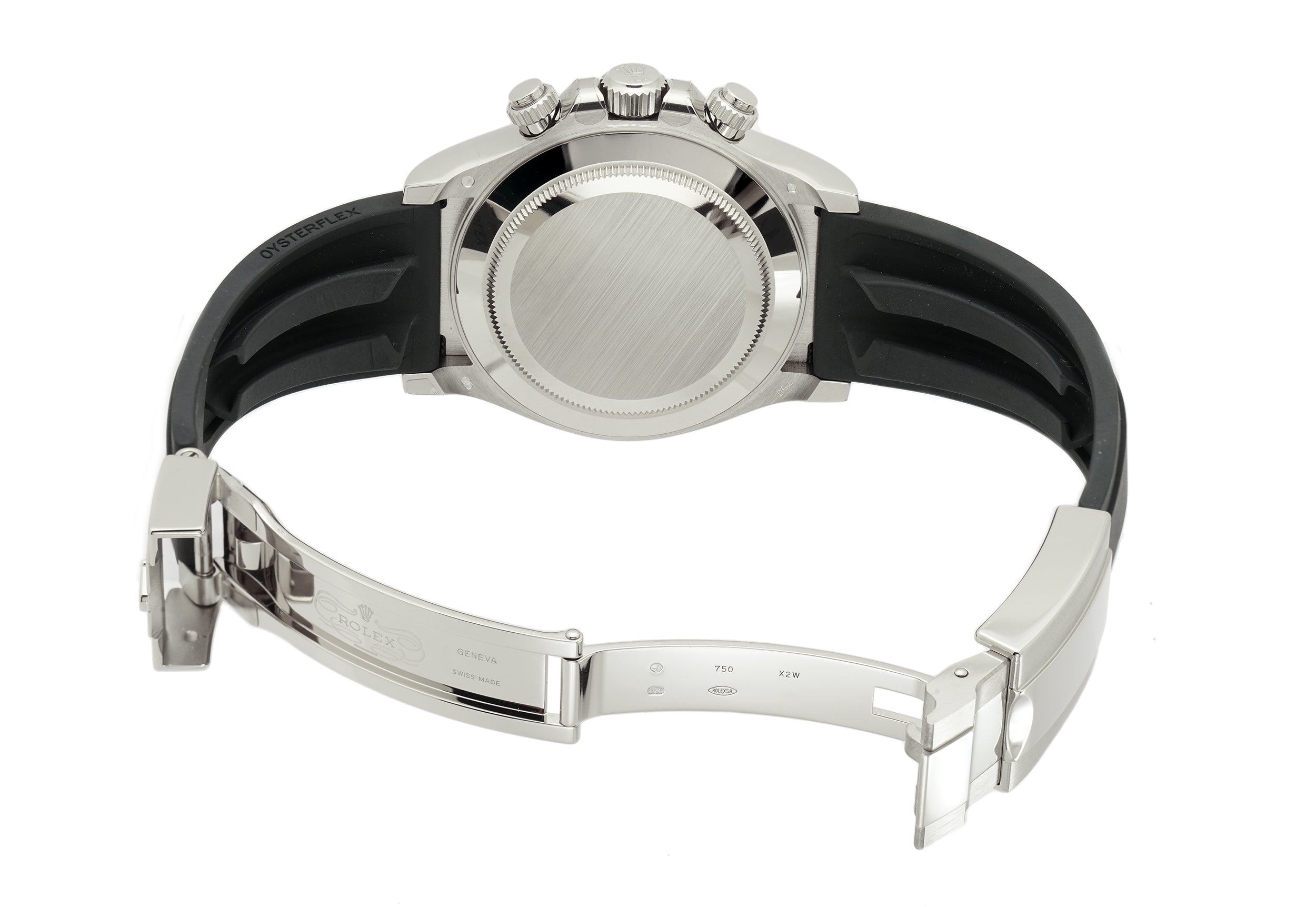 Case is made of high-polish finished 18k white gold as are the push-buttons and crown, but the tachymeter-scaled bezel is made of black ceramic. As for the strap, it comes with a black oysterflex band that is mounted on brush-finished 18k white gold end-pieces.