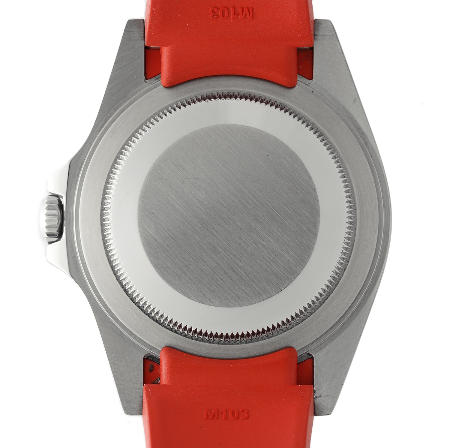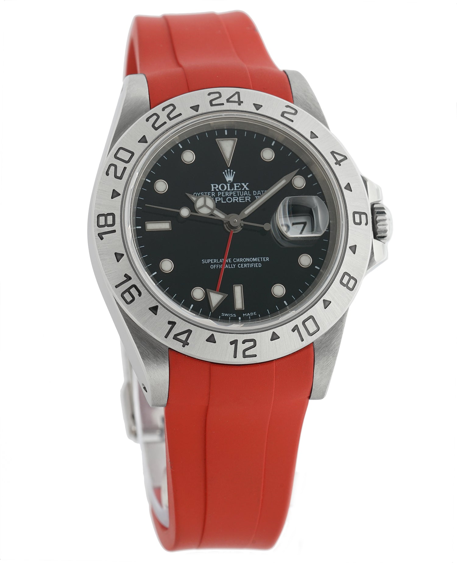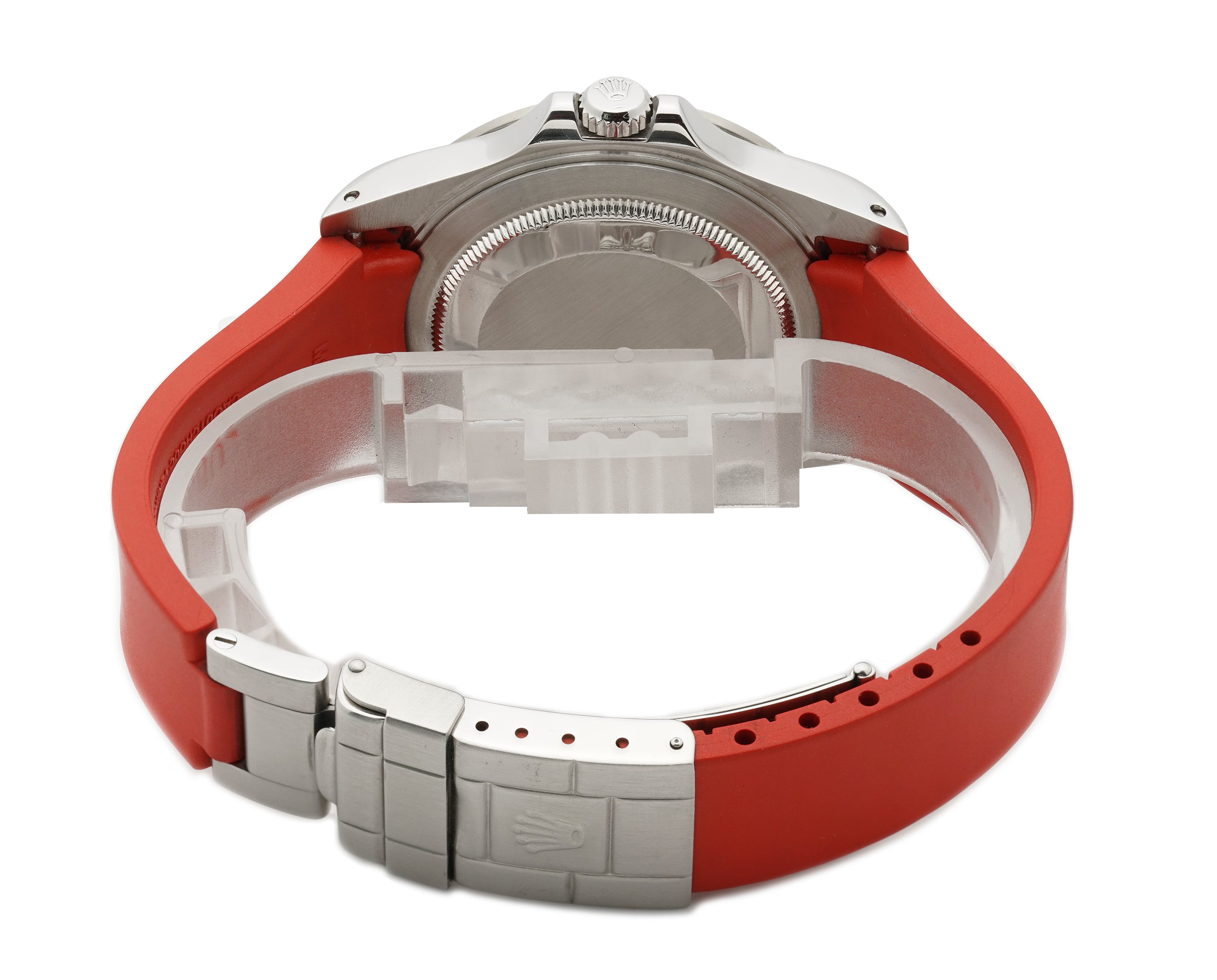 Currently Mounted On The Case Is A New Red Rubber B Strap Which is Secured On To The Wrist With The Help Of The Rolex Stainless Steel Folding Clasp. The Rolex Oyster Stainless Steel Bracelet Is Included With The Watch.