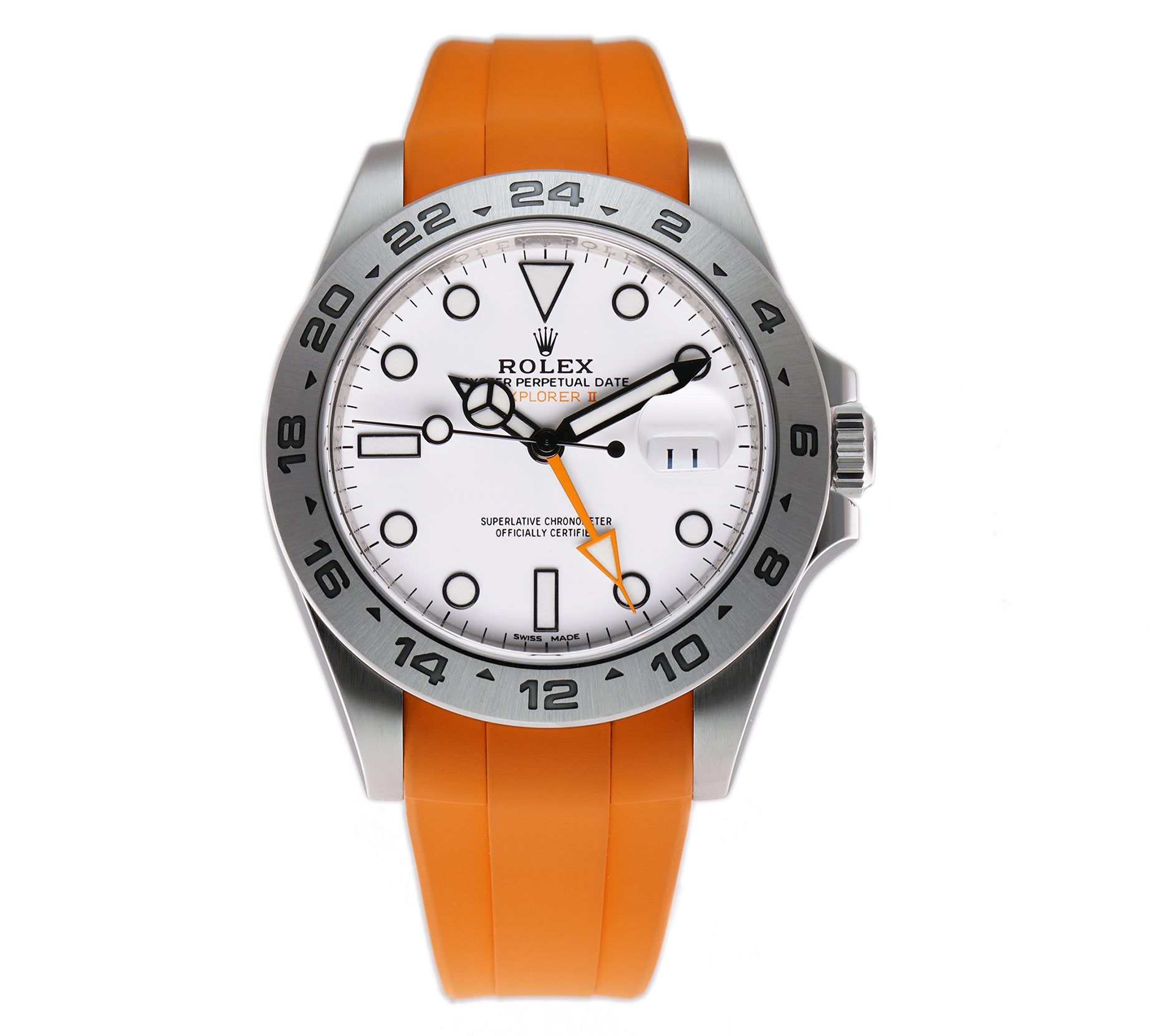 Case is made of stainless steel with brush-finished lugs and high-polish finished sides. The 24-hour bezel mounted atop is of brush-finished stainless steel. Both crown and case back are screw-down. Watch is currently on an orange RubberB strap that works with the original Rolex clasp. Also included would be the Rolex stainless steel oyster bracelet which fits up to a 7.25 inch wrist.