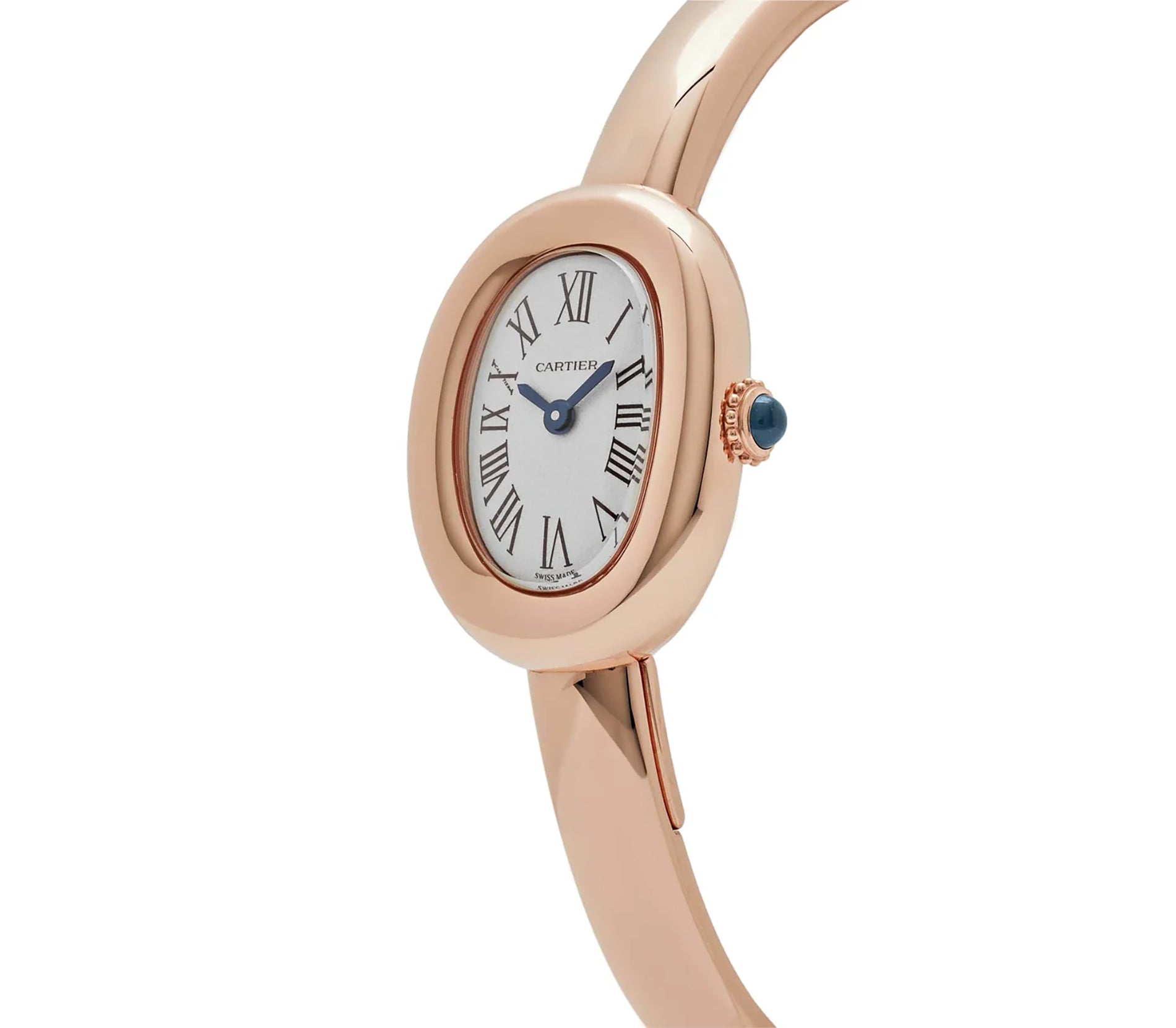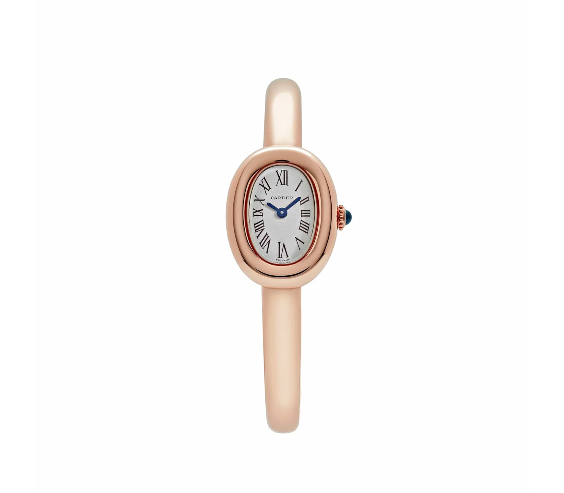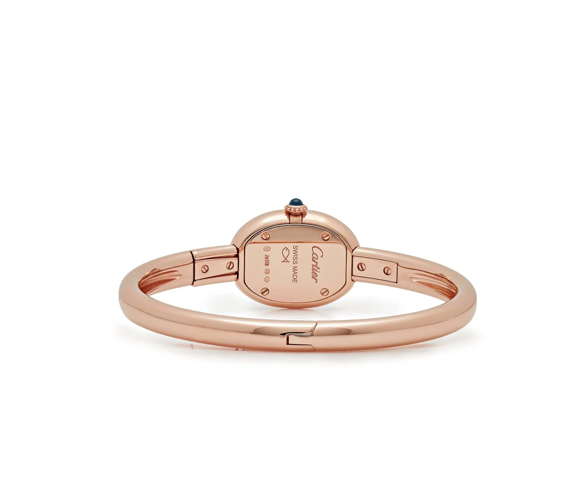 Case is made of a smooth high polished finish 18k rose gold which also includes the 18k rose gold spinel with a blue cabochon. The watch is paired with a high polished finish 18k rose gold rigid bracelet.