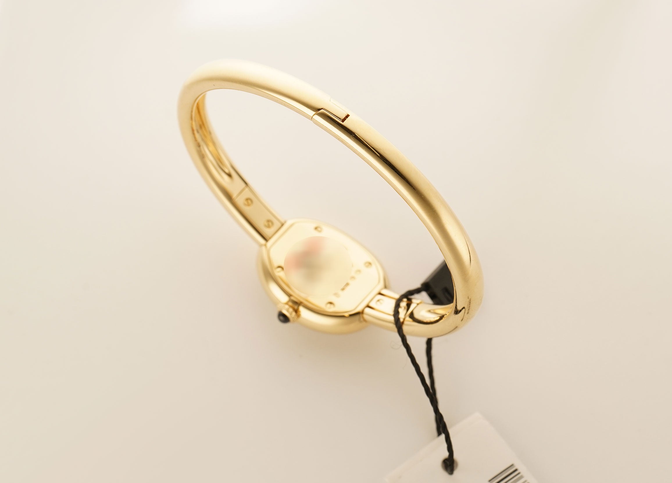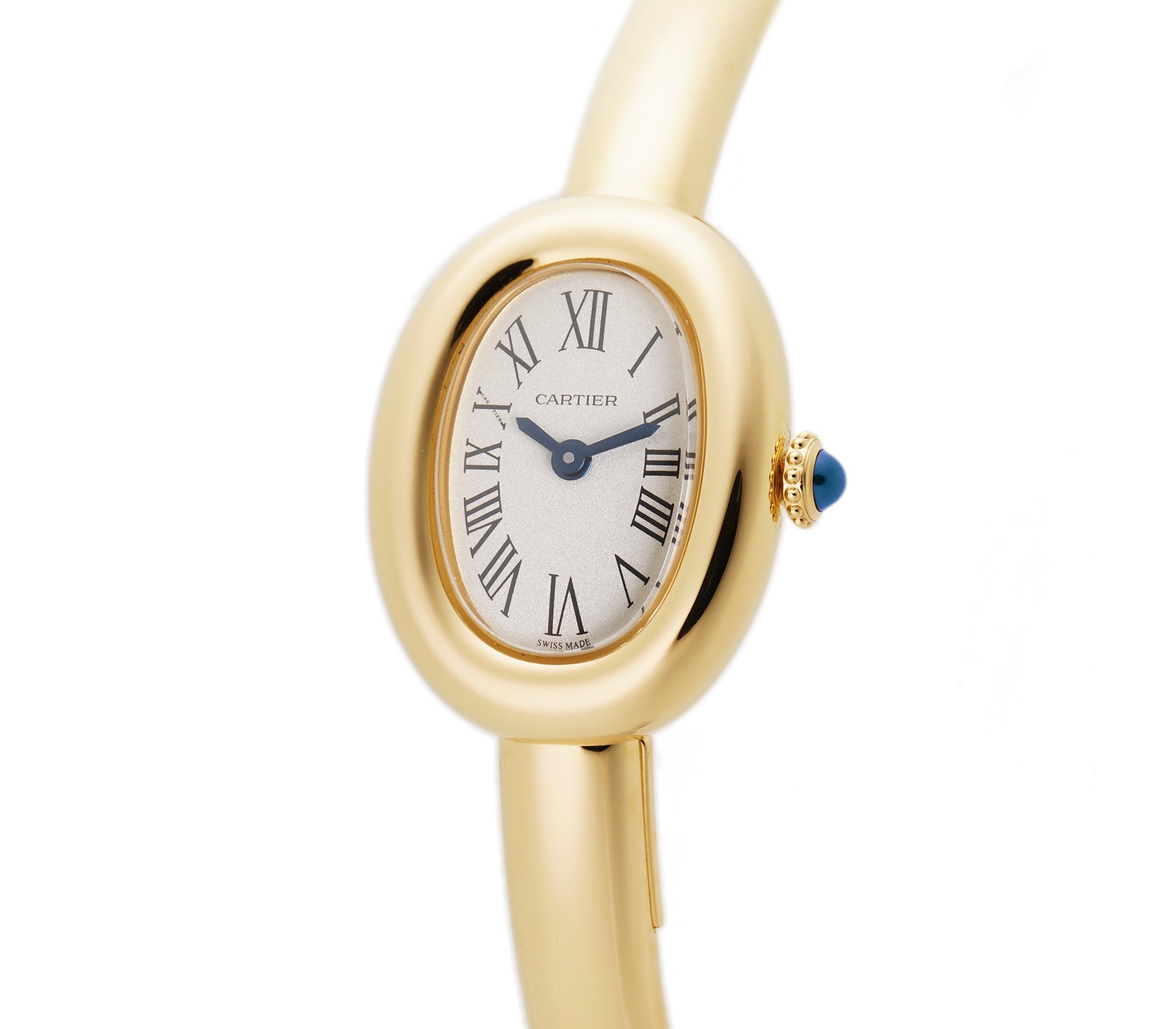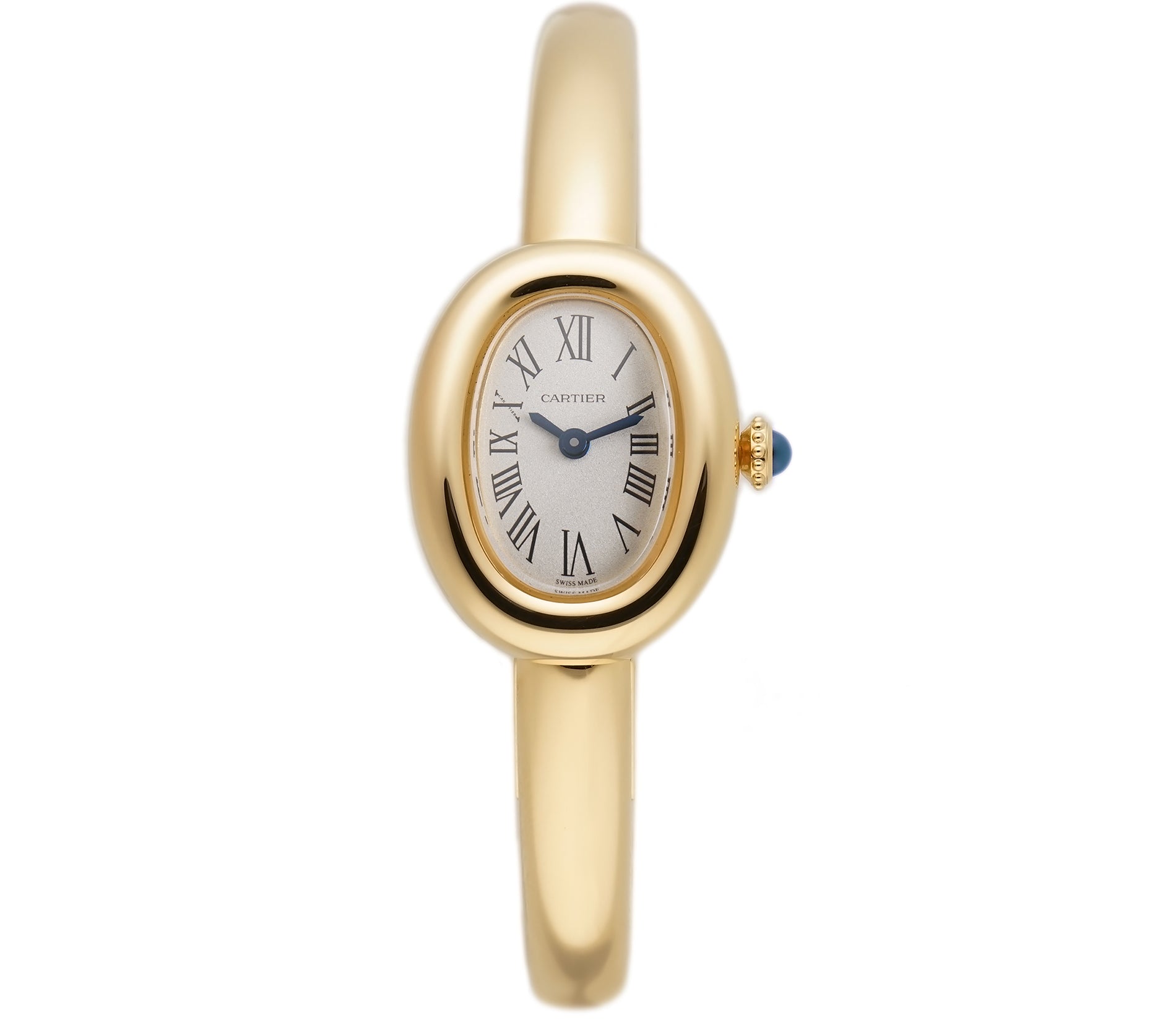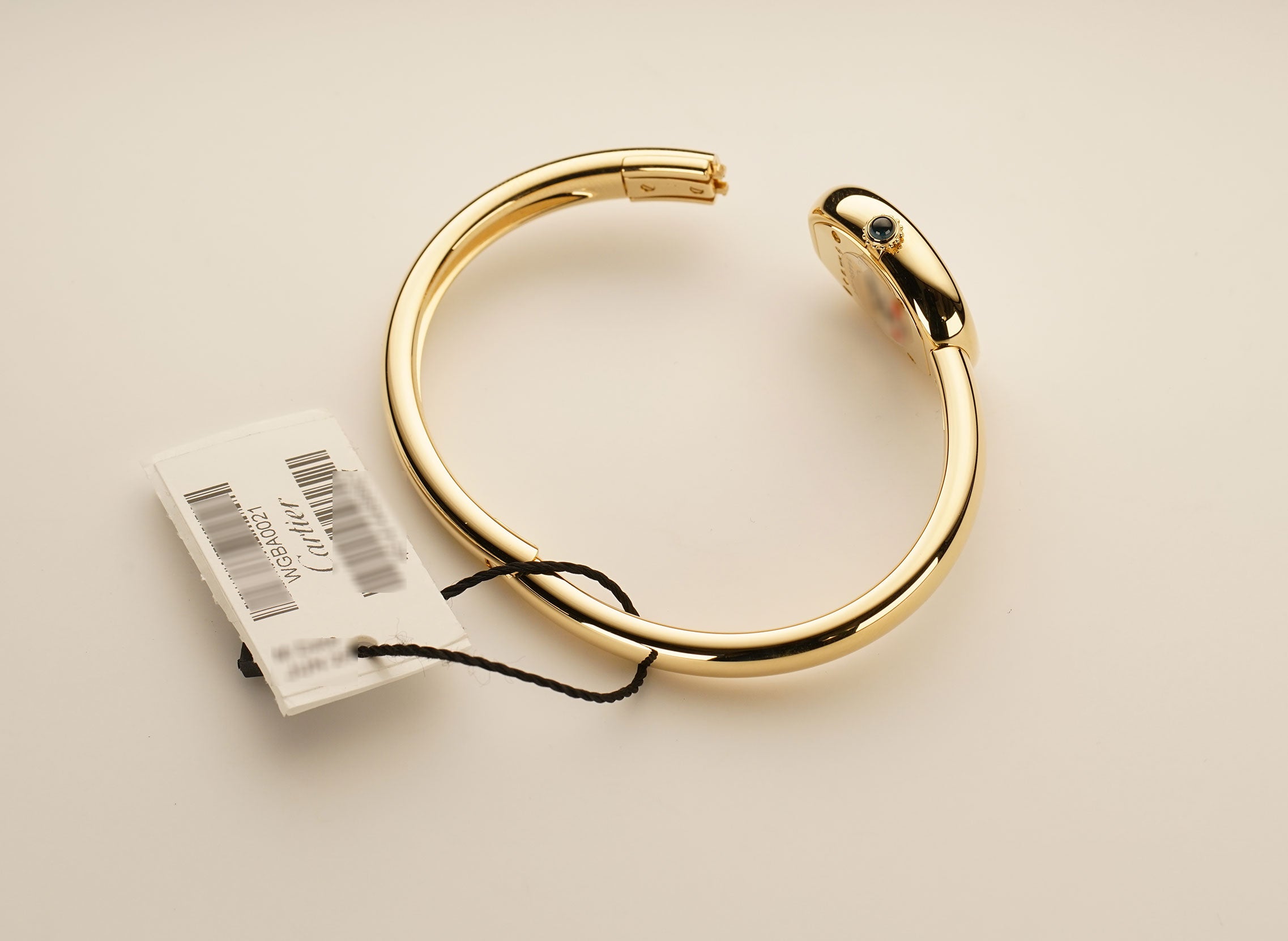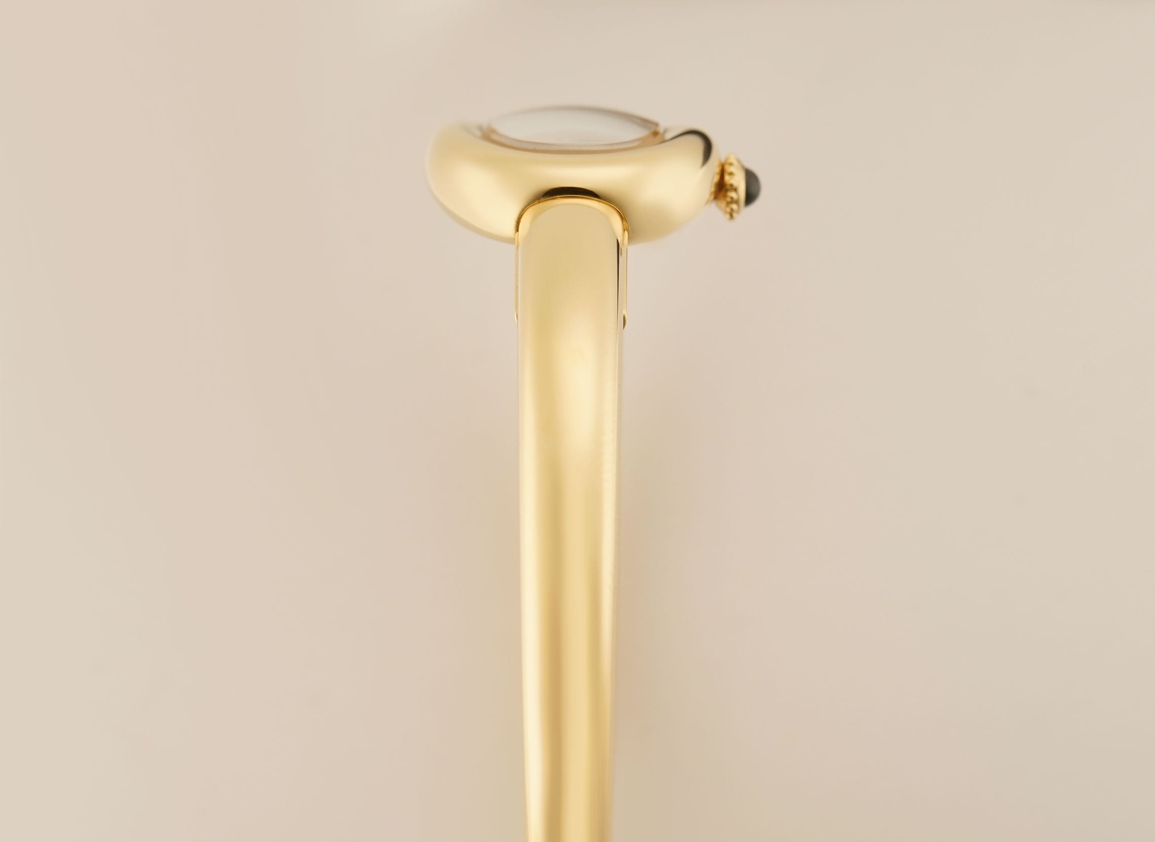 Case is made of a smooth mirror finish 18k yellow gold which also includes the 18k yellow gold spinel with a blue cabochon. The watch is paired with a high polished finish 18k yellow gold rigid bracelet.