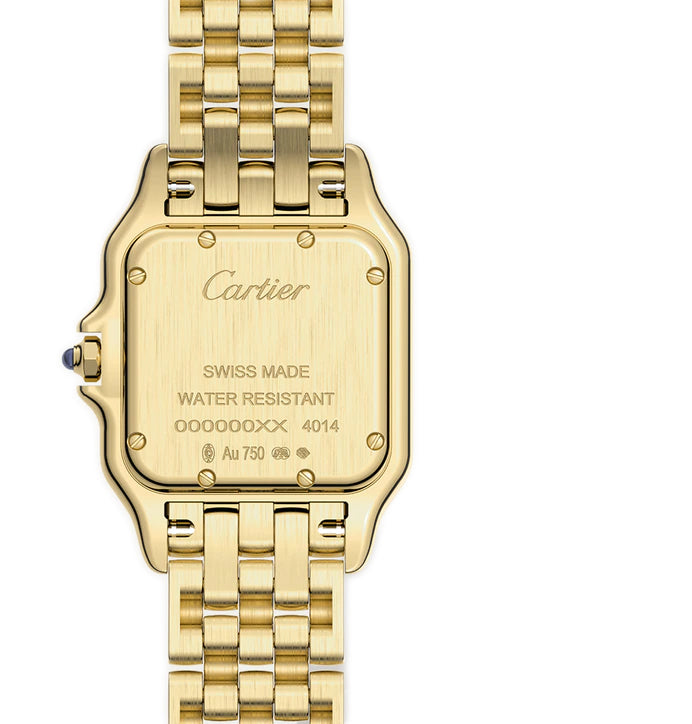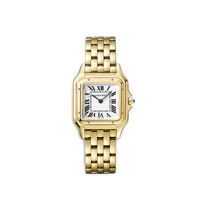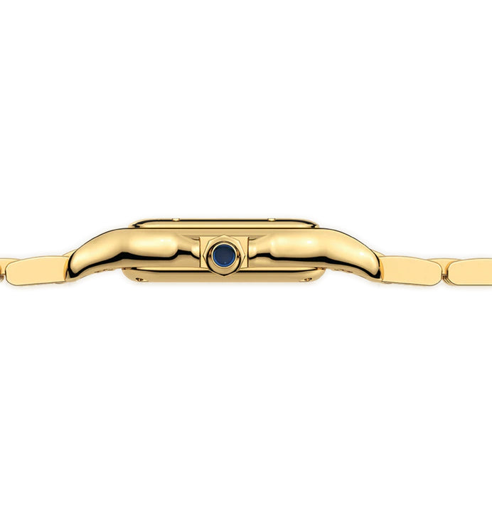 Case us made of a high polished finish 18k yellow gold including the crown with the spinel. Mounted atop the case is a high polished finish 18k yellow gold fixed rectangular bezel. The watch is paired with a high polished finish 18k yellow gold bracelet.