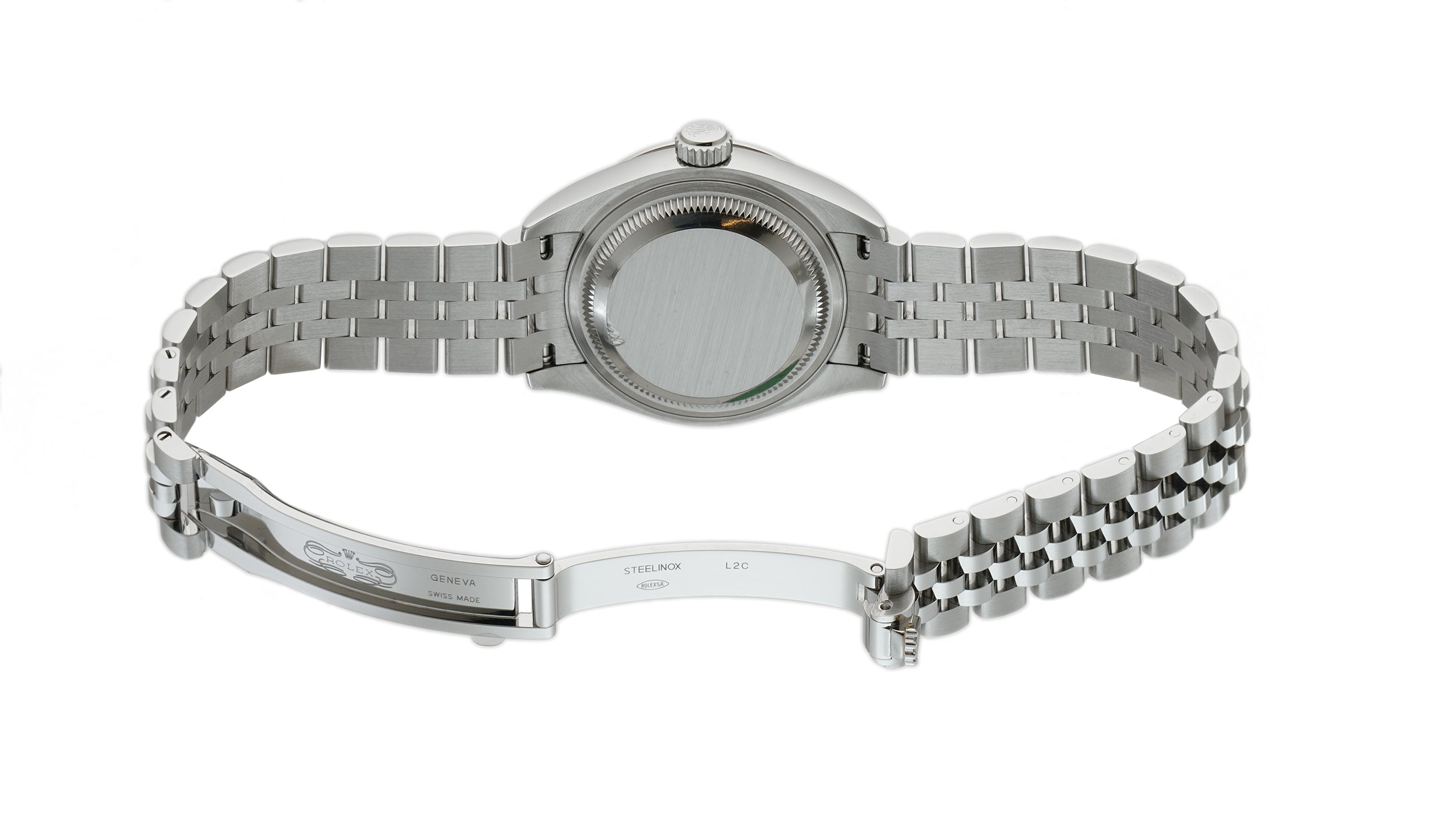 Case is made high-polish finished stainless steel and it is equipped with a high-polish finished 18k white gold fluted bezel. Screwed into the case is a solid stainless steel case back and stainless steel crown. As for the bracelet, it is stainless steel as well but with high-polish finished center links and brush-finished shoulder links.