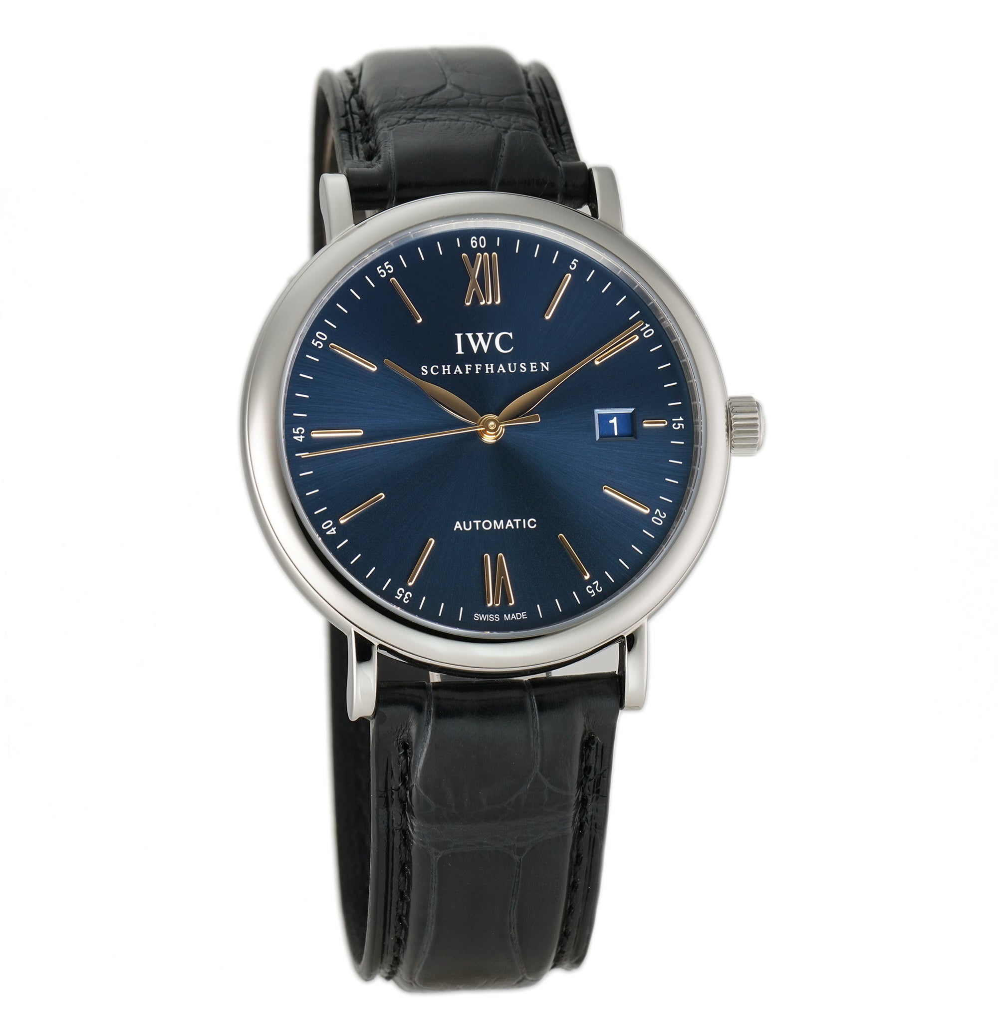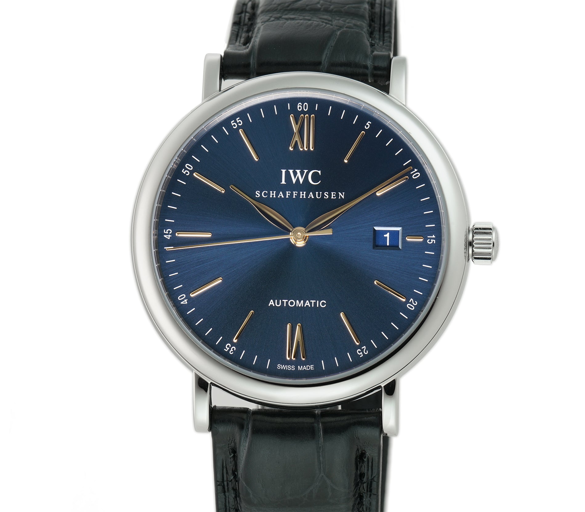 Time and date are displayed on a blue dial that is accompanied by gold applied hands and hour markers. Featured on the dial is a date aperture at 3 o'clock.