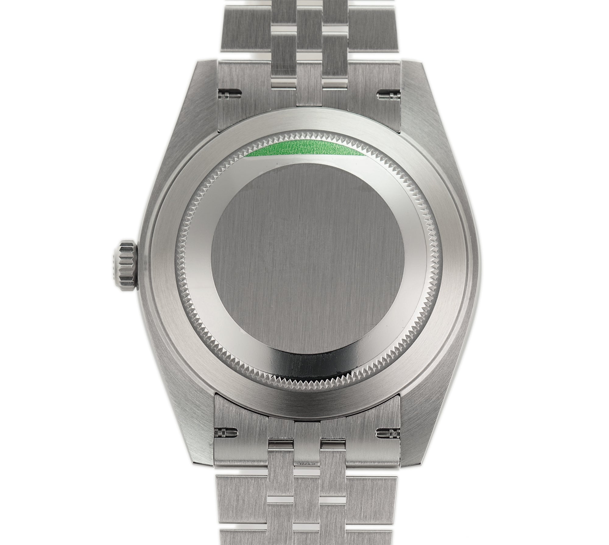 Case is made of high-polish finished stainless steel with the exception of the case back which is combination of satin-finished and high-polish stainless steel. Mounted atop is a fluted 18k white gold bezel. The jubilee bracelet is of the same material, with high-polish finished center links and brush-finished outer links.