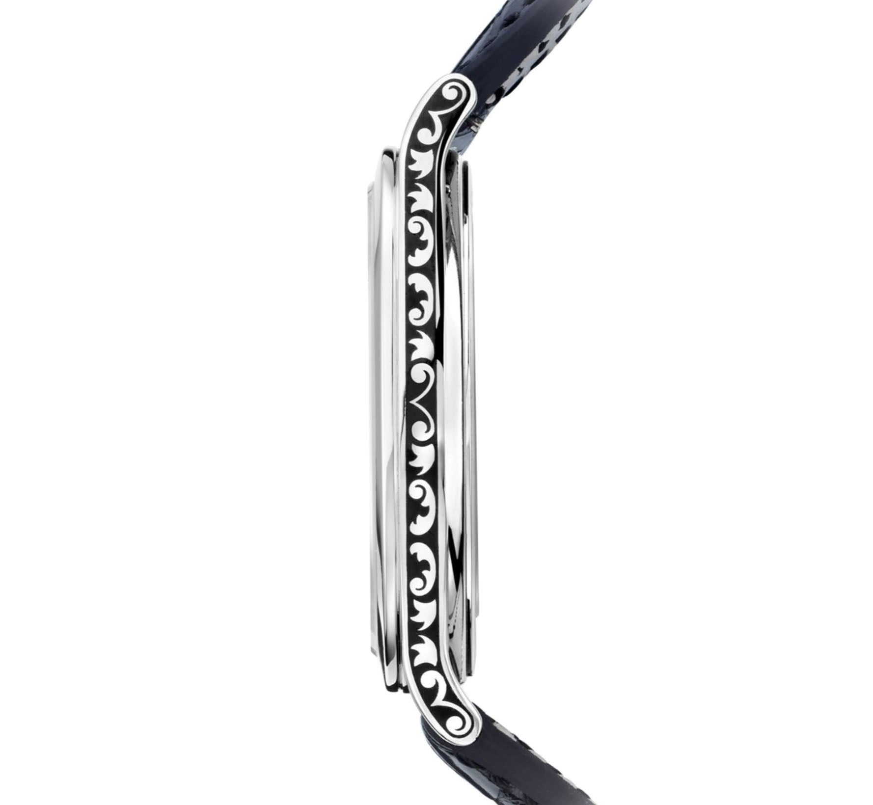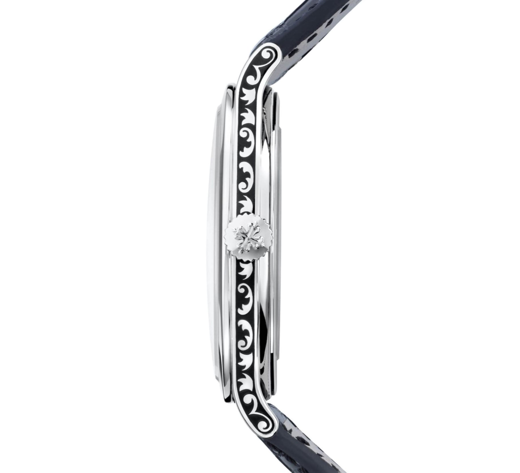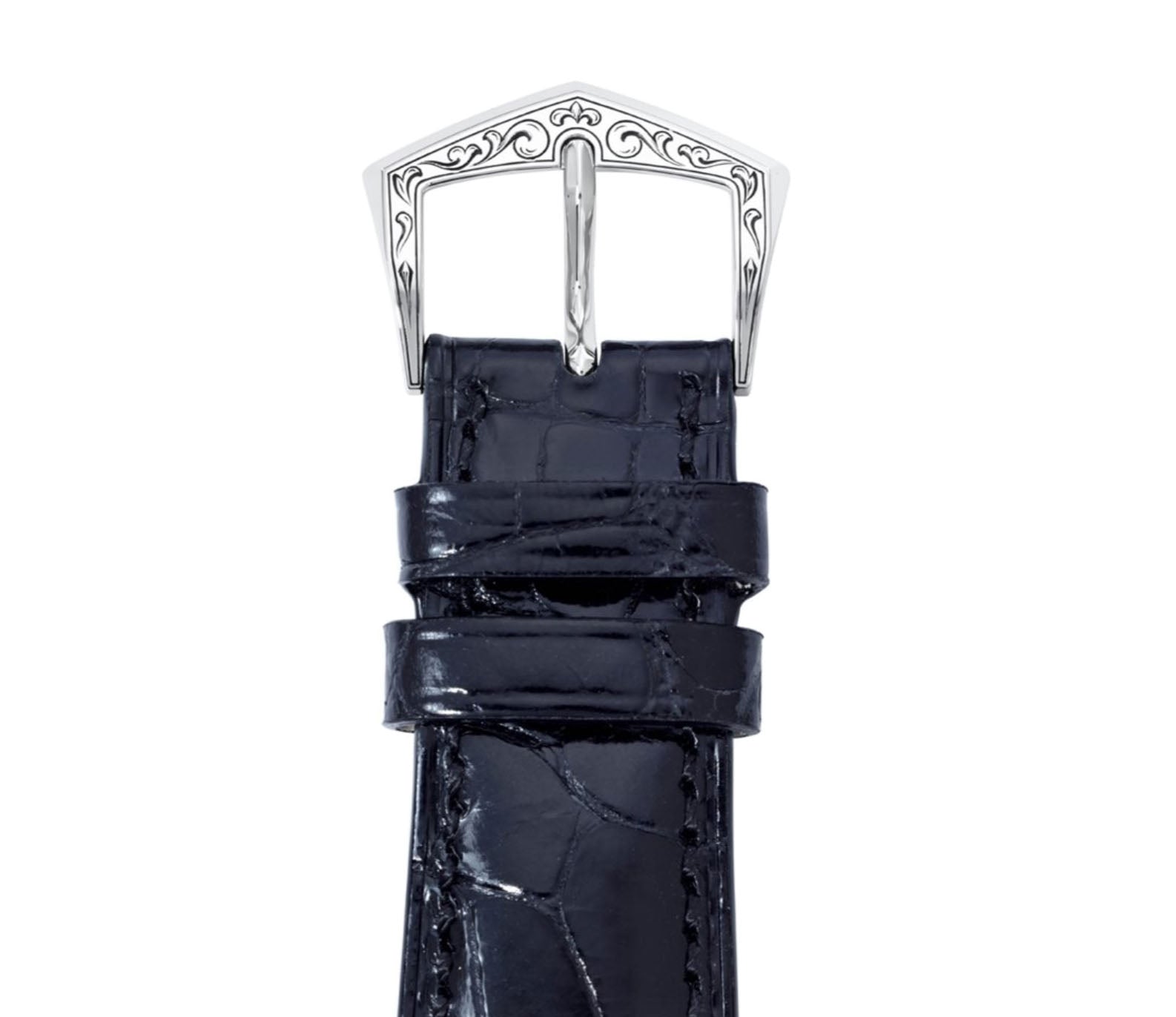 Time is displayed on a gorgeous hand-engraved black enamel dial that is accompanied with the same volute-like design as the side of the case as well as the tang buckle.